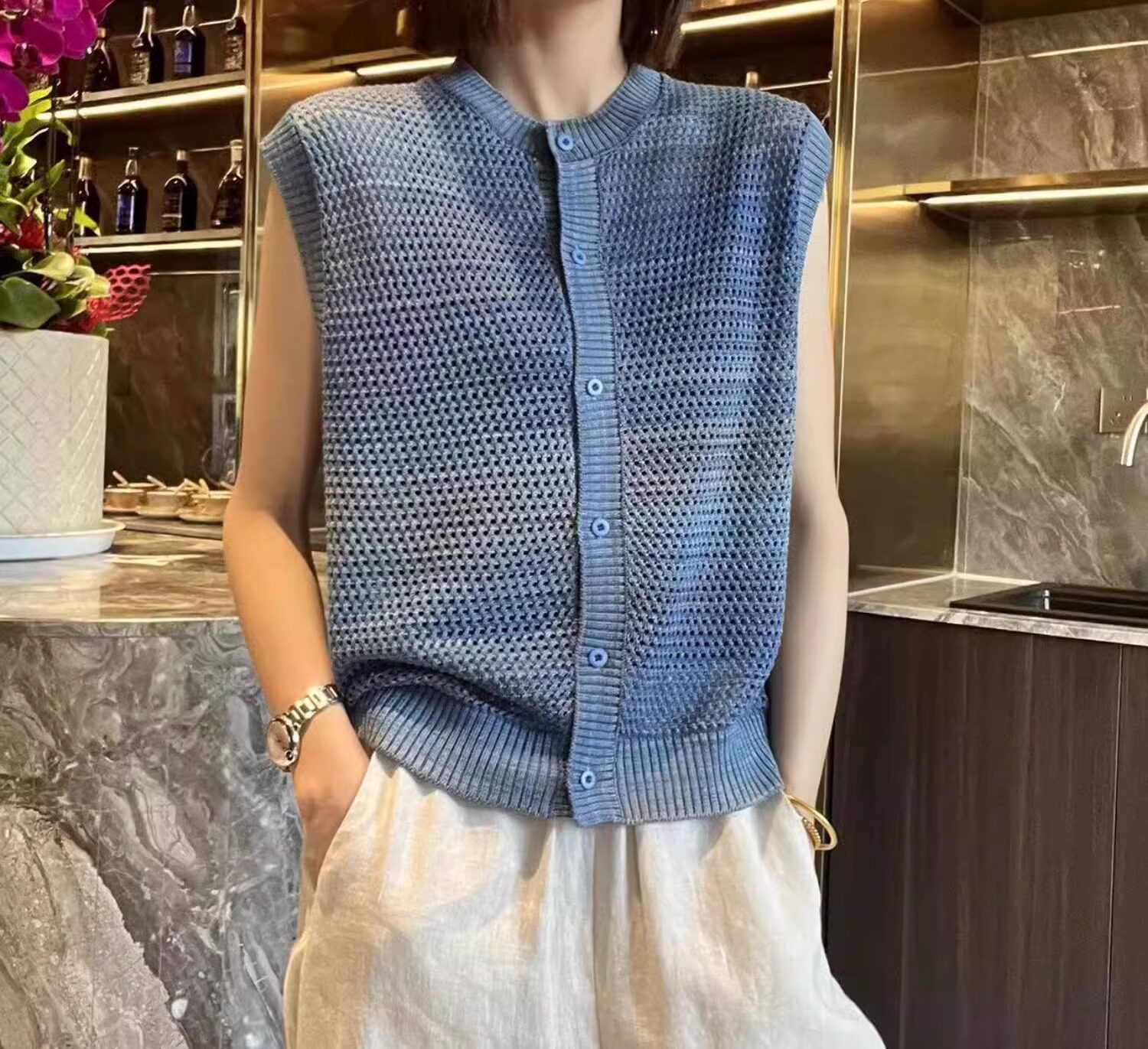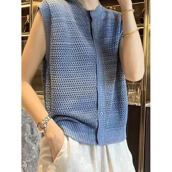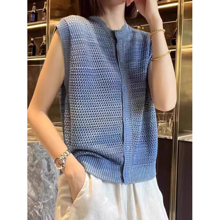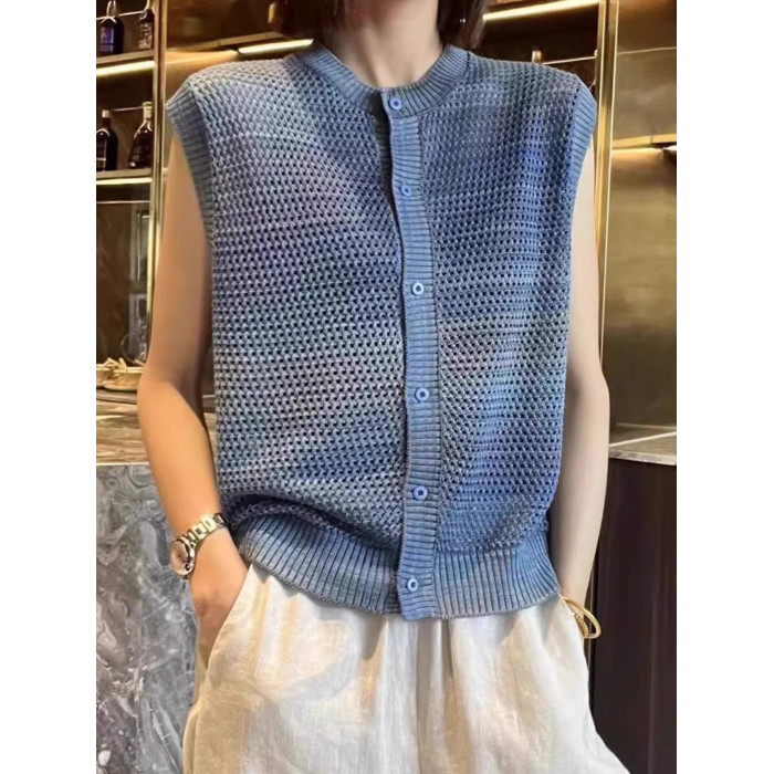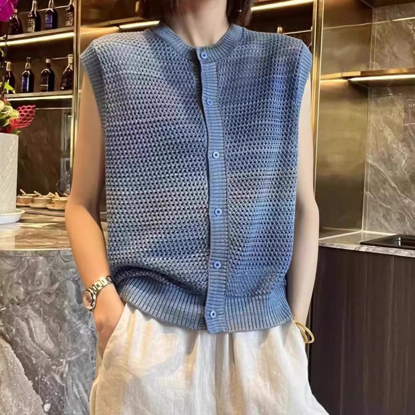 暈染設計感上衣針織開衫顯瘦無袖背心寬鬆休閒鏤空時尚洋氣舒適女
