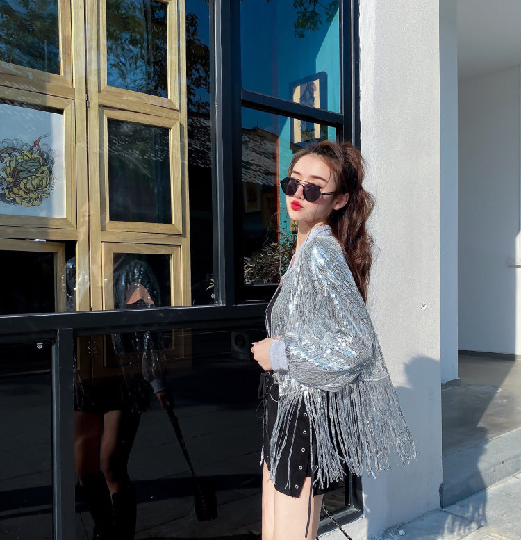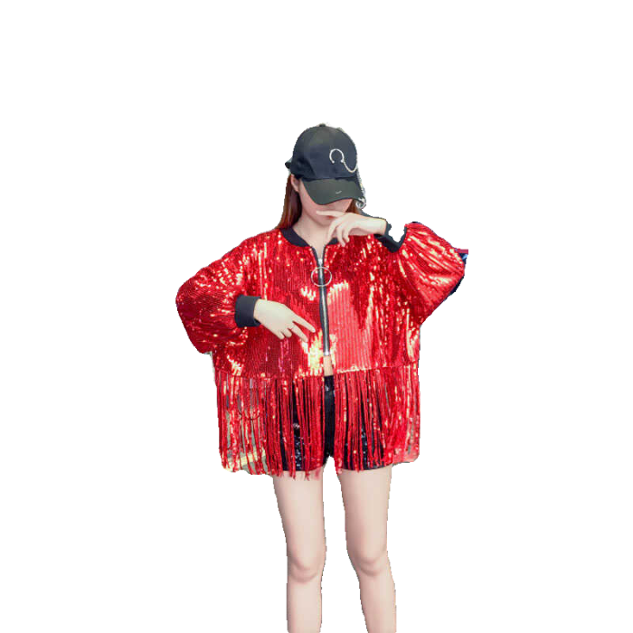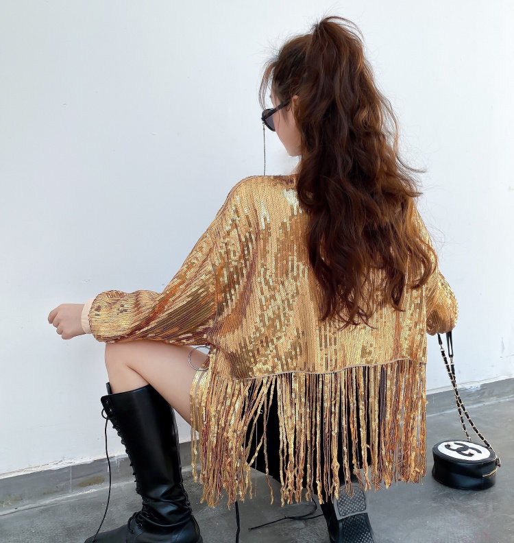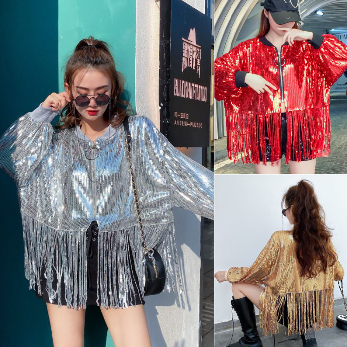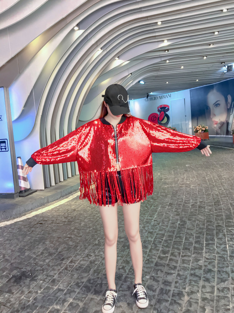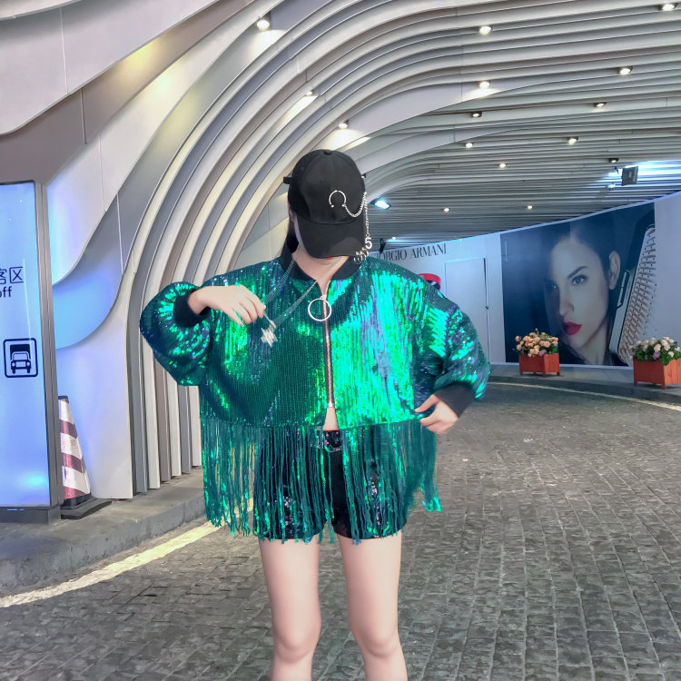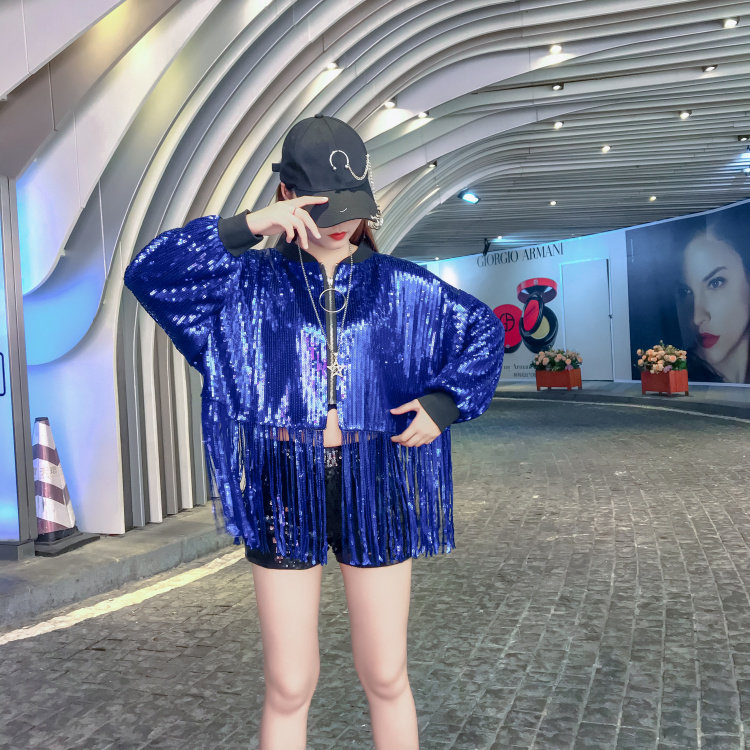 舞台服裝學生成人嘻哈街舞表演出服百搭亮片閃閃上衣流蘇短外套女