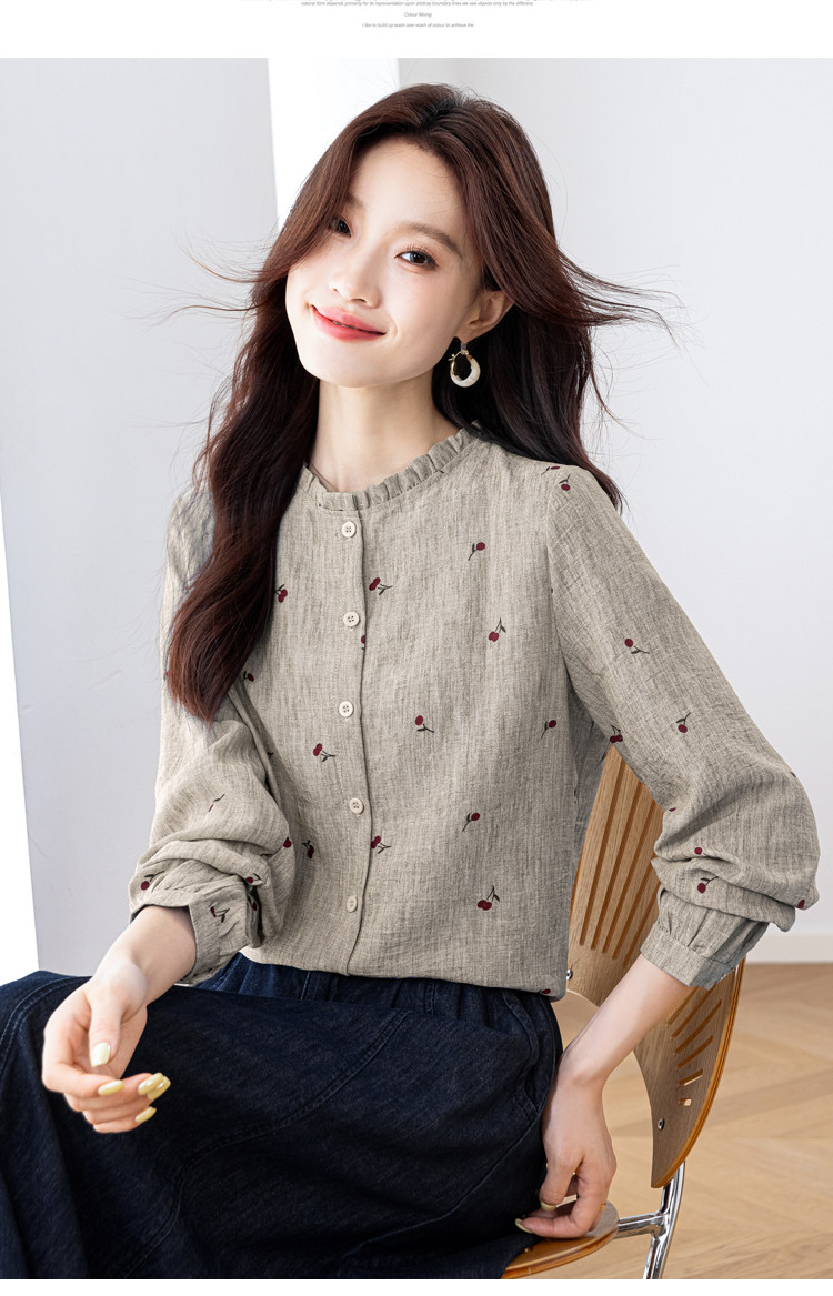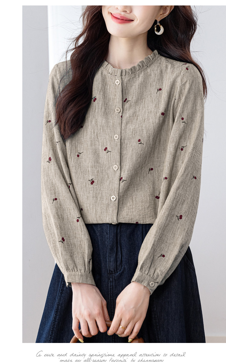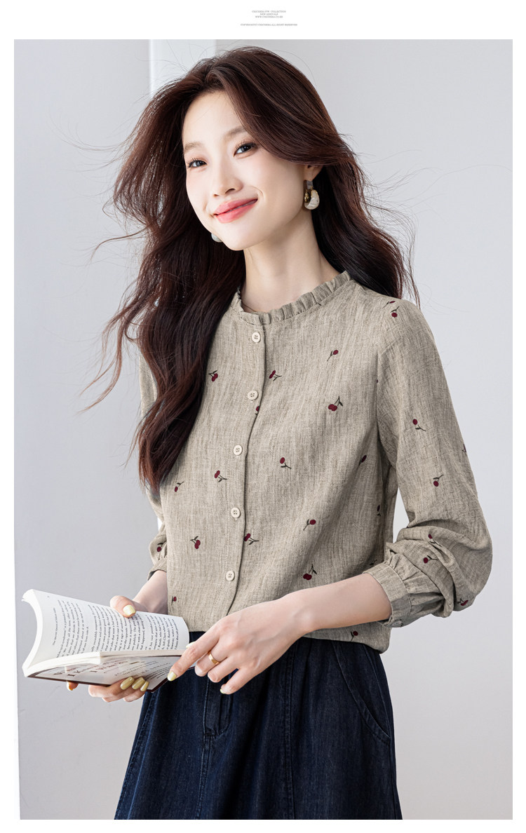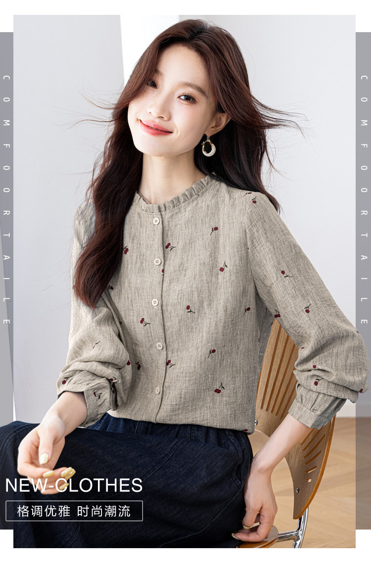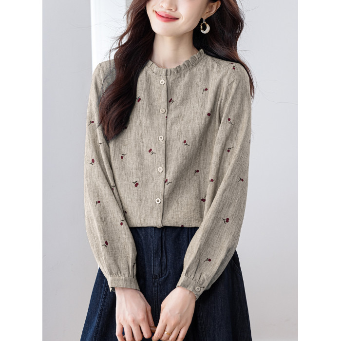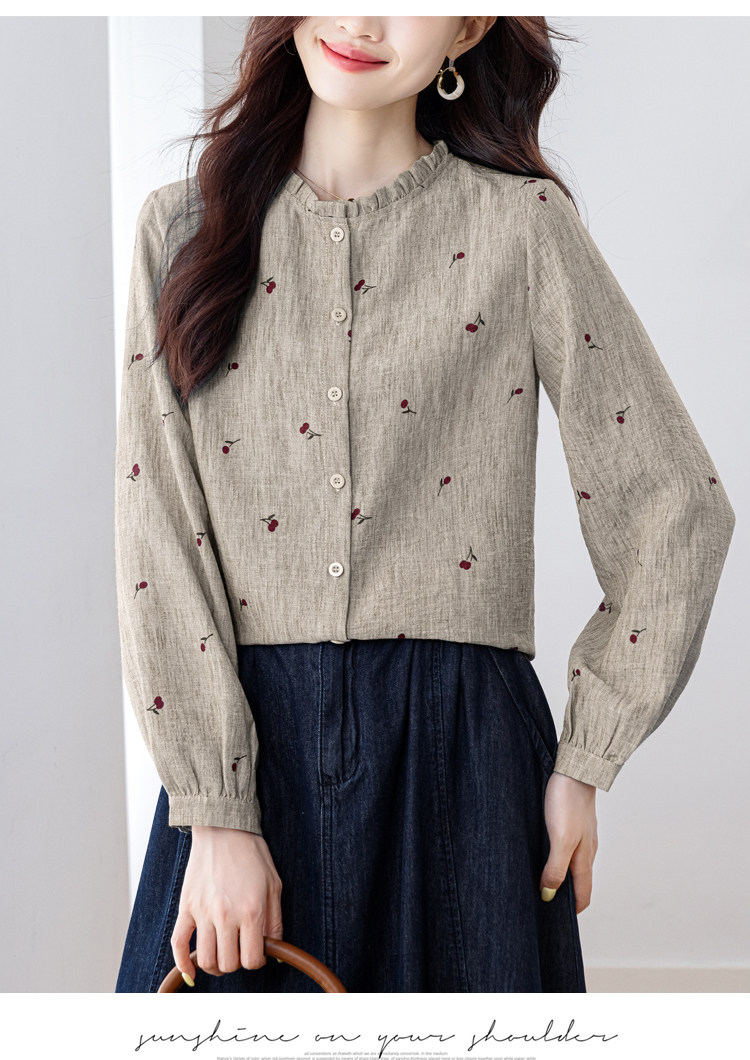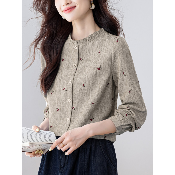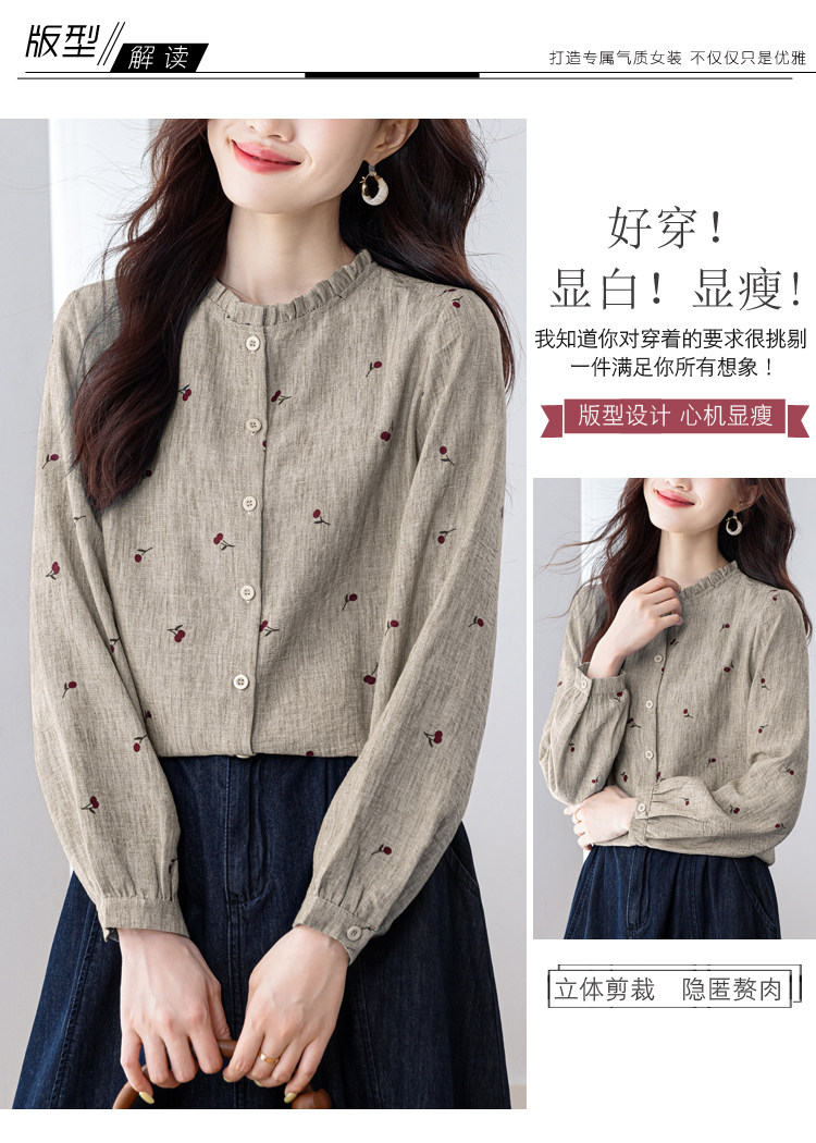 文藝印花長袖棉麻襯衫女士春裝新款氣質休閒小衫百搭洋氣顯瘦上衣