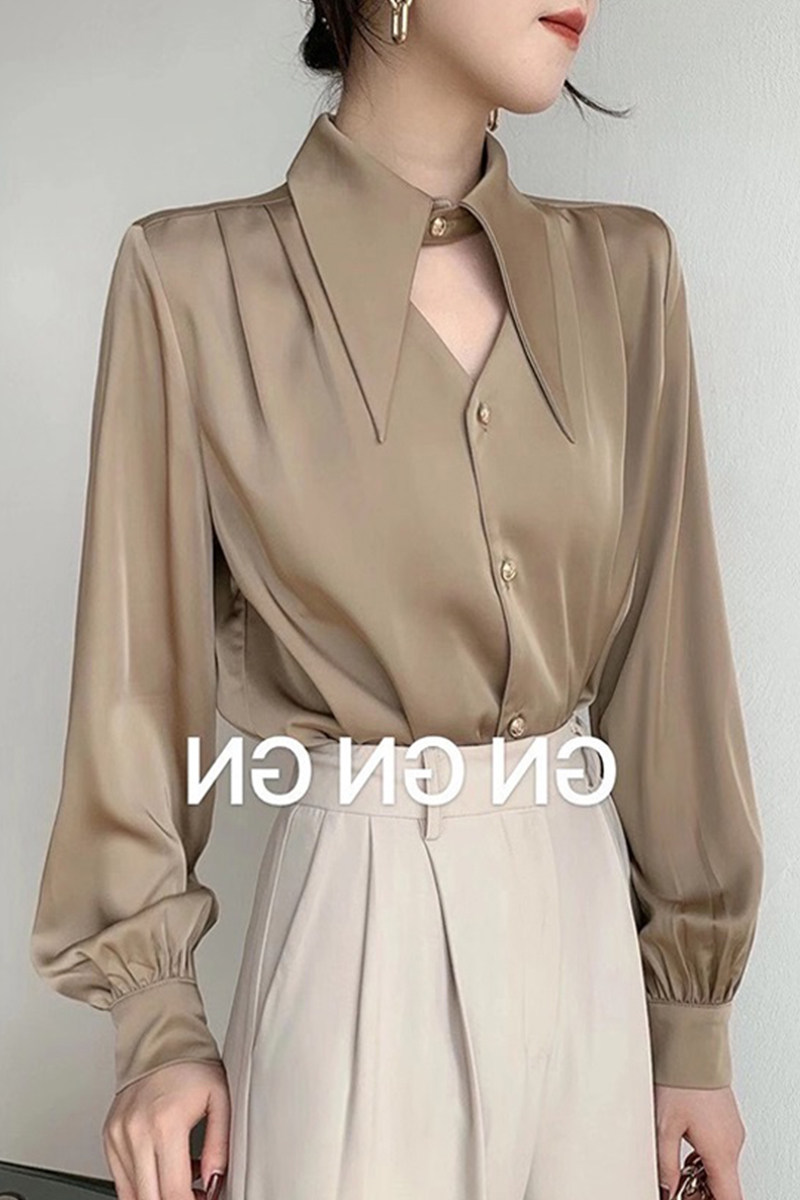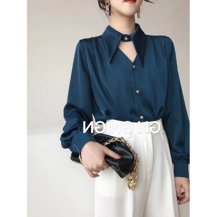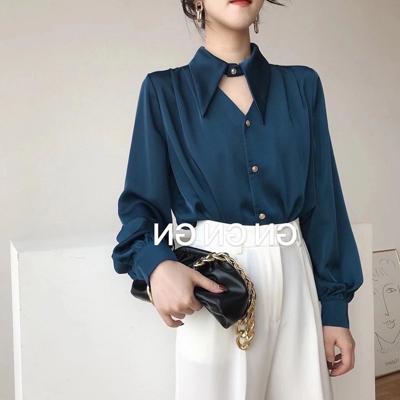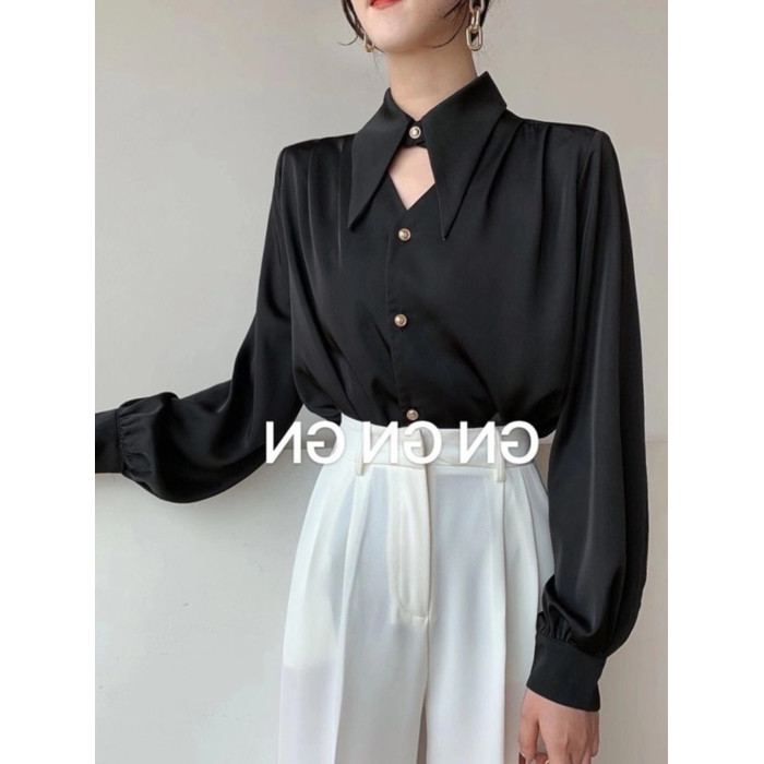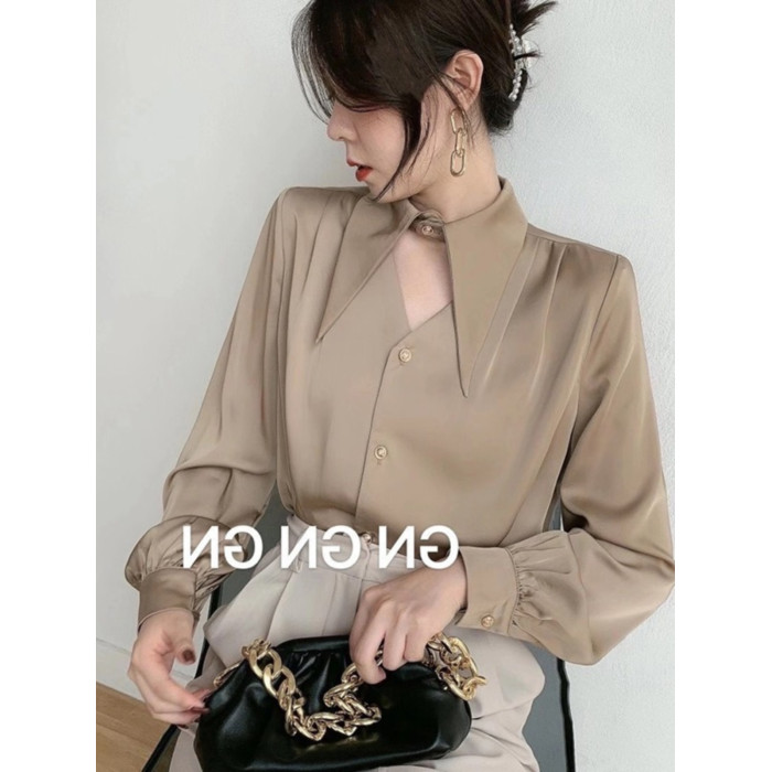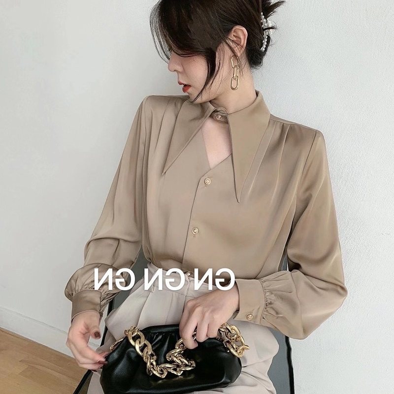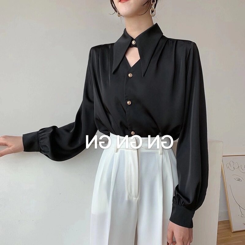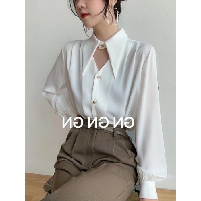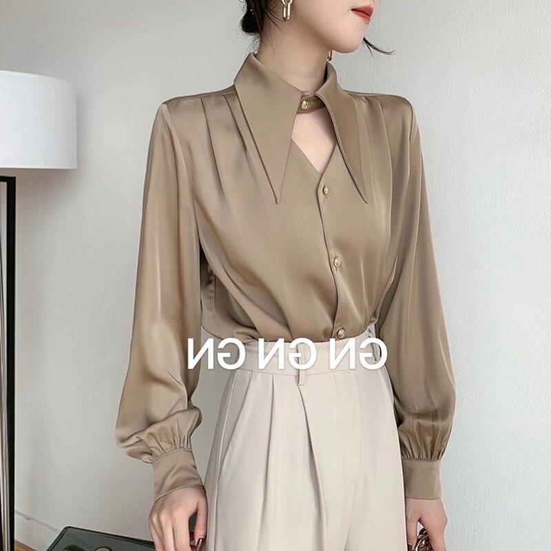 白色緞面襯衫女春秋設計感鏤空氣質通勤尖領長袖職業裝雪紡上衣潮