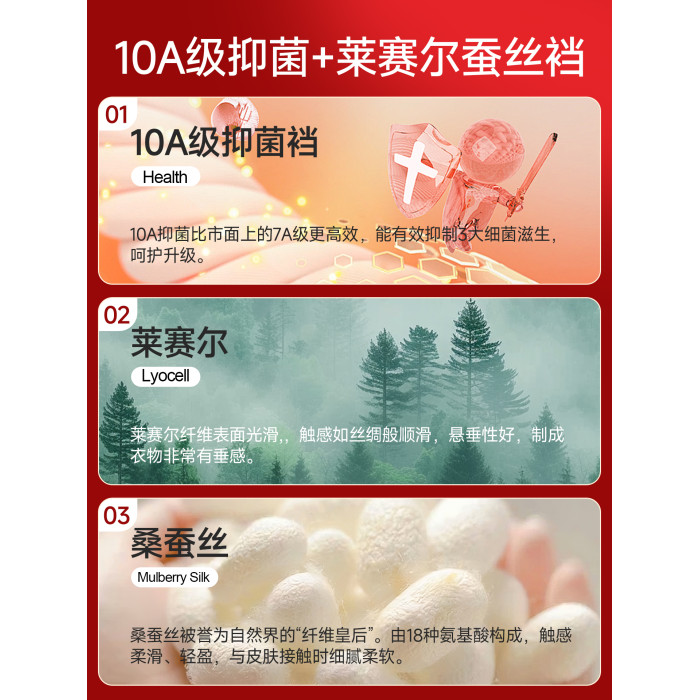 | 襠部材質成分 | 萊賽爾纖維(萊賽爾)85.5% 聚氨酯彈性纖維(氨綸)7.1% 聚酯纖維4.3% 桑蠶絲3.1% |