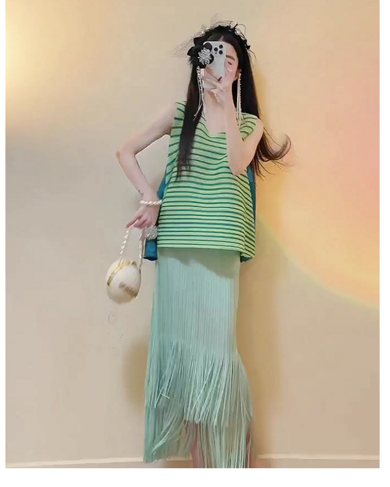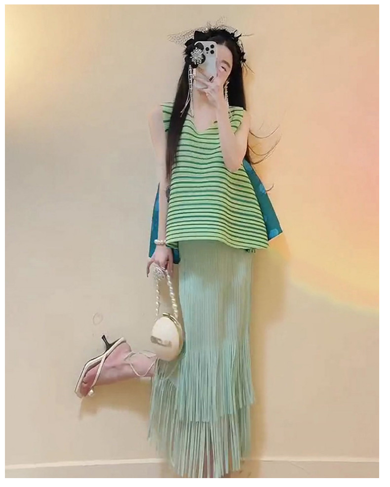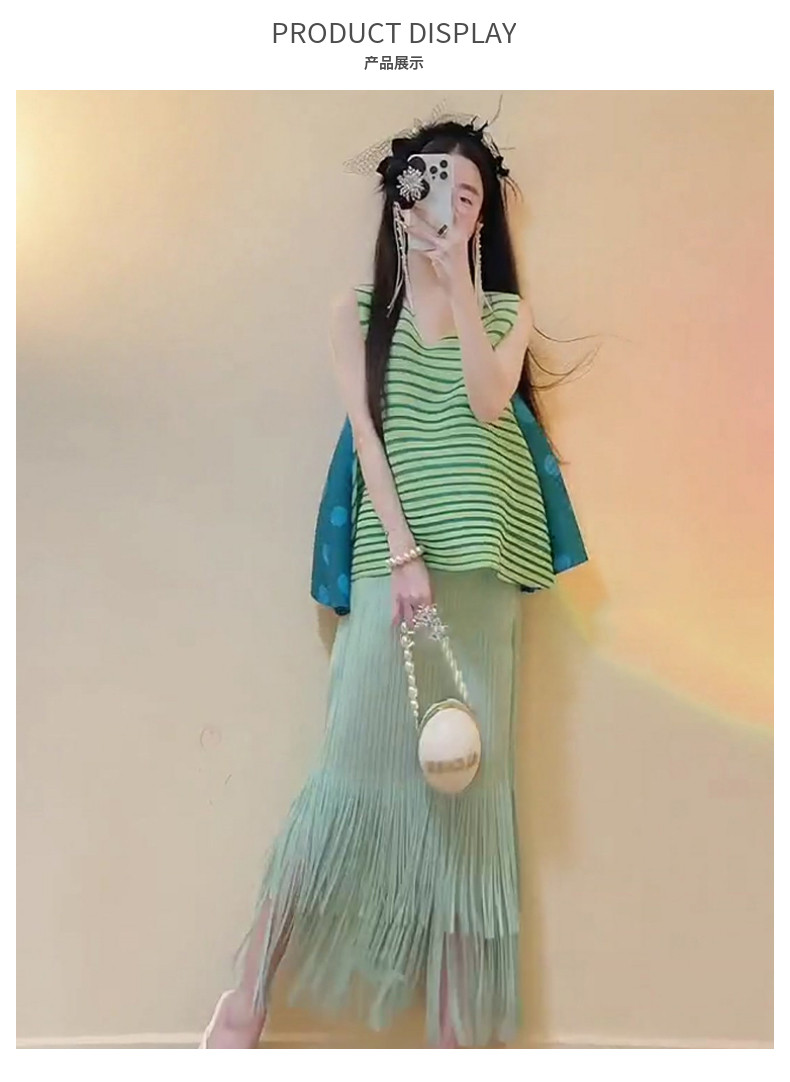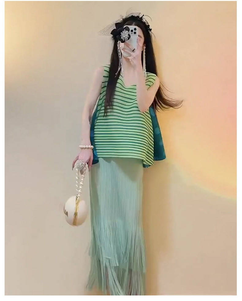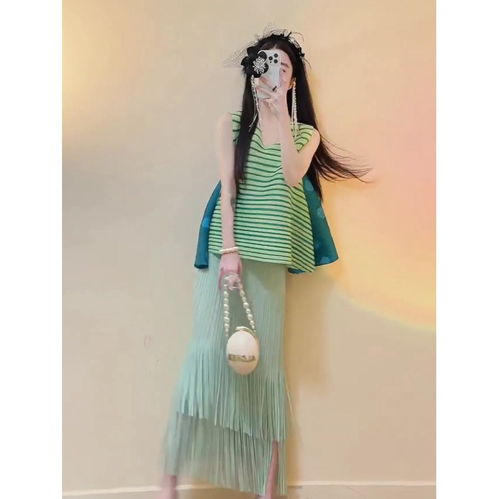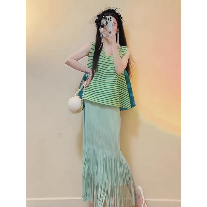 宅家褶皺2025夏季新款套裝女條紋印花無袖上衣高腰清新流蘇中長裙