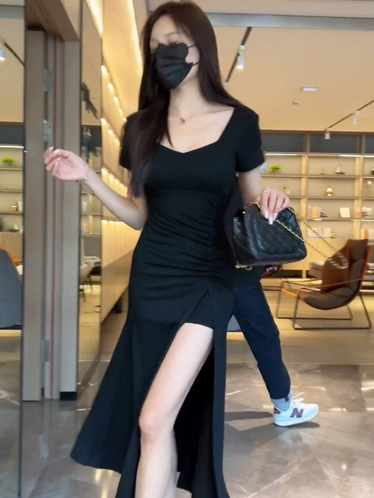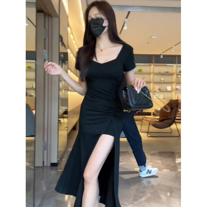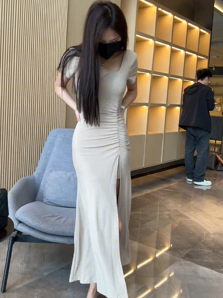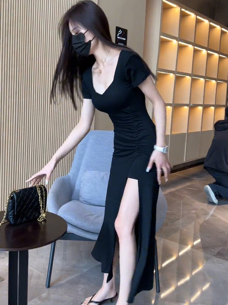 純色性感V領短袖連衣裙女2025年夏季新款氣質顯瘦褶皺開叉長裙潮