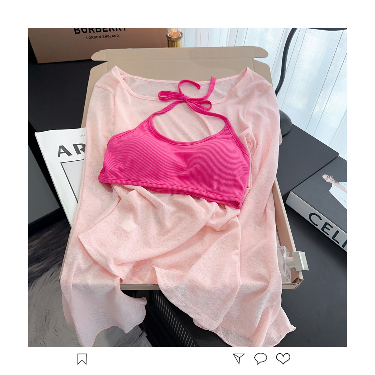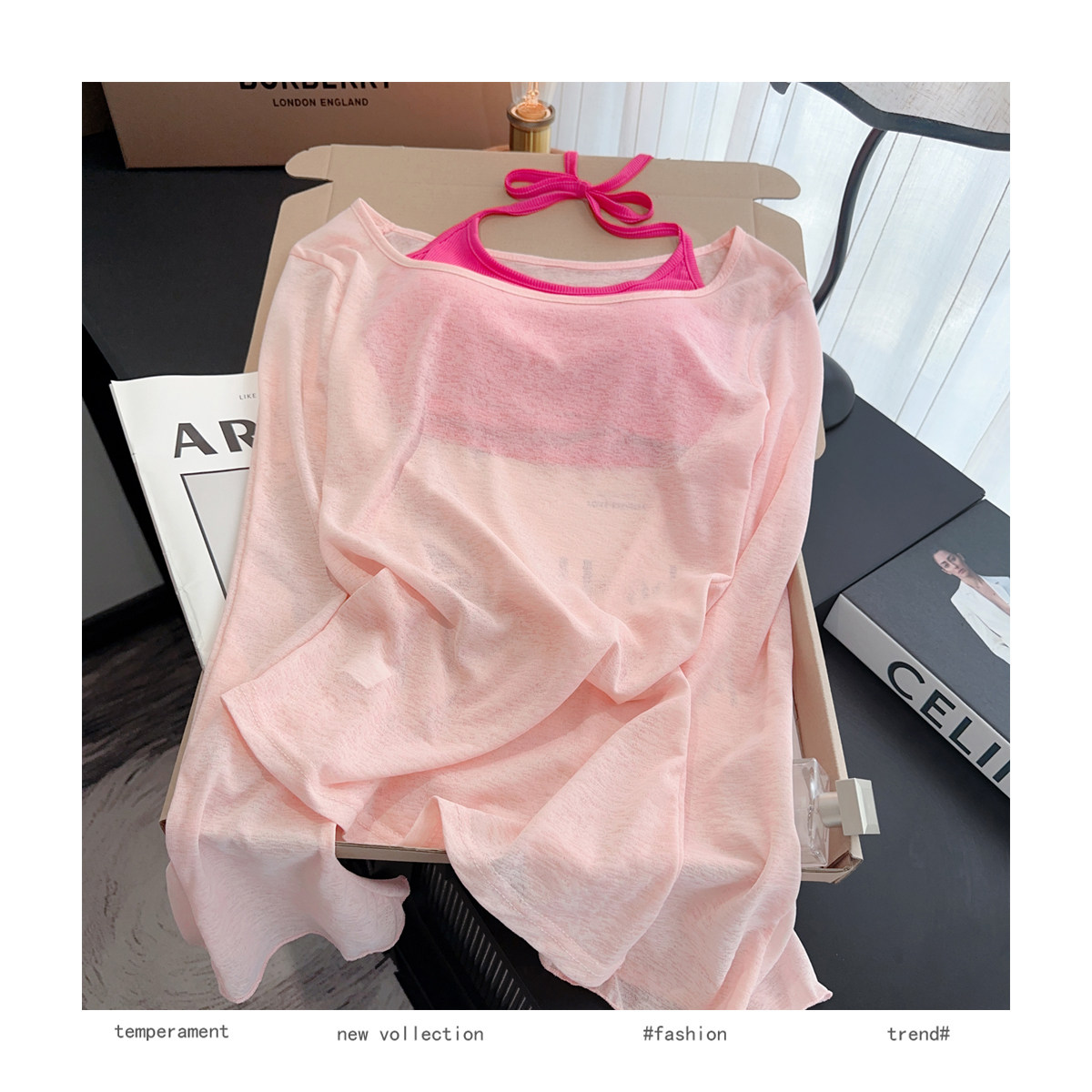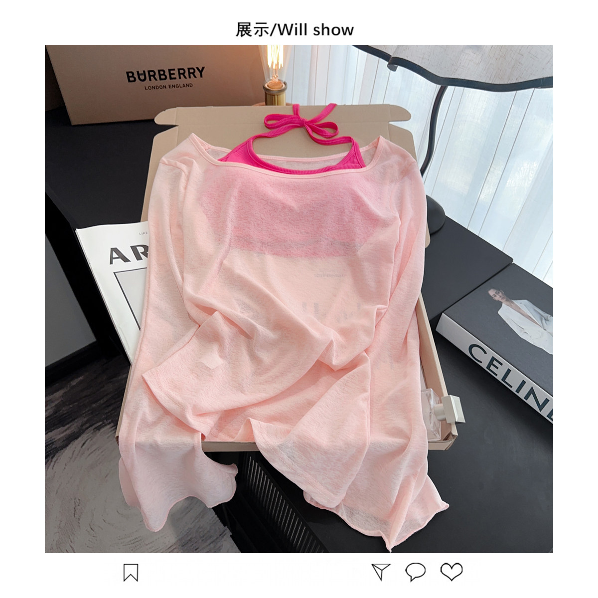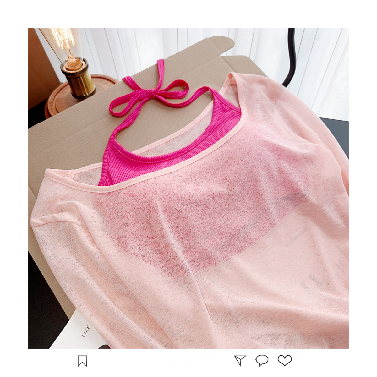 專櫃撤廻剪標掛脖吊帶背心女夏季新款甜美薄款防曬罩衫曡穿兩件套