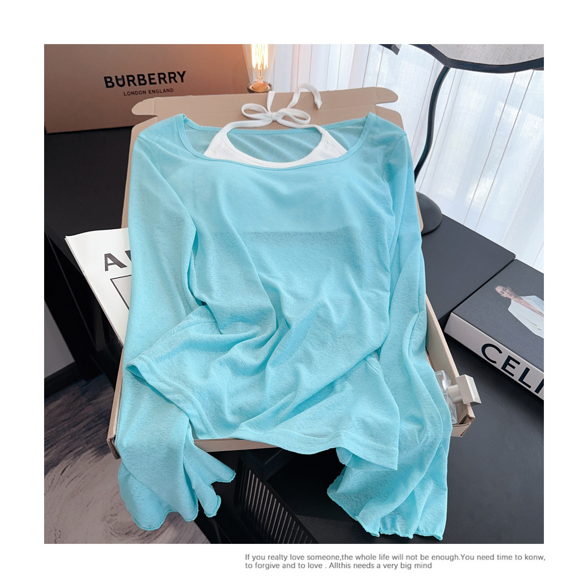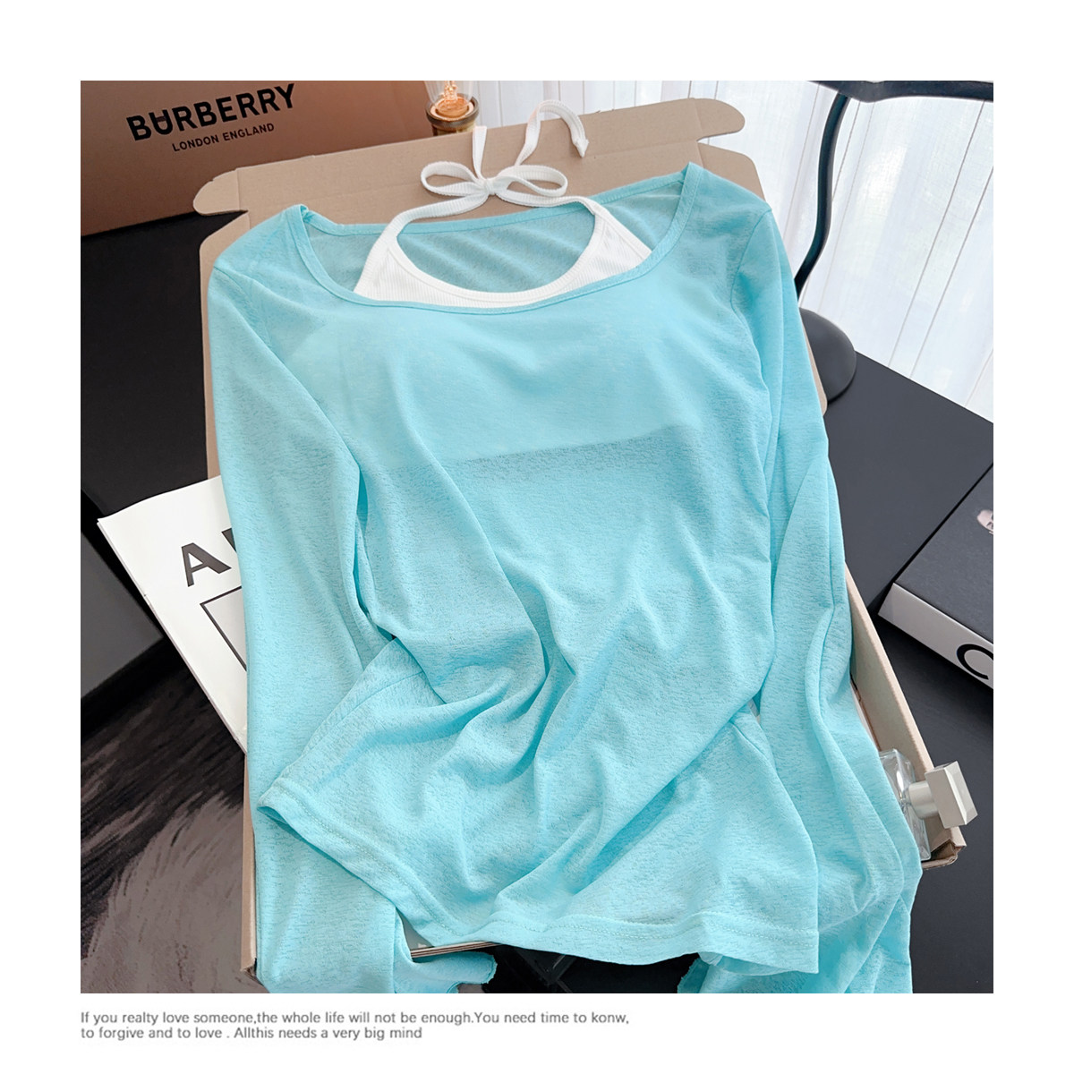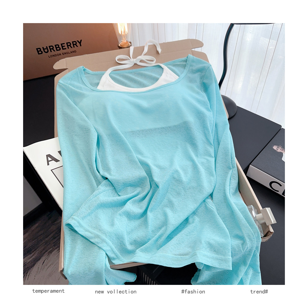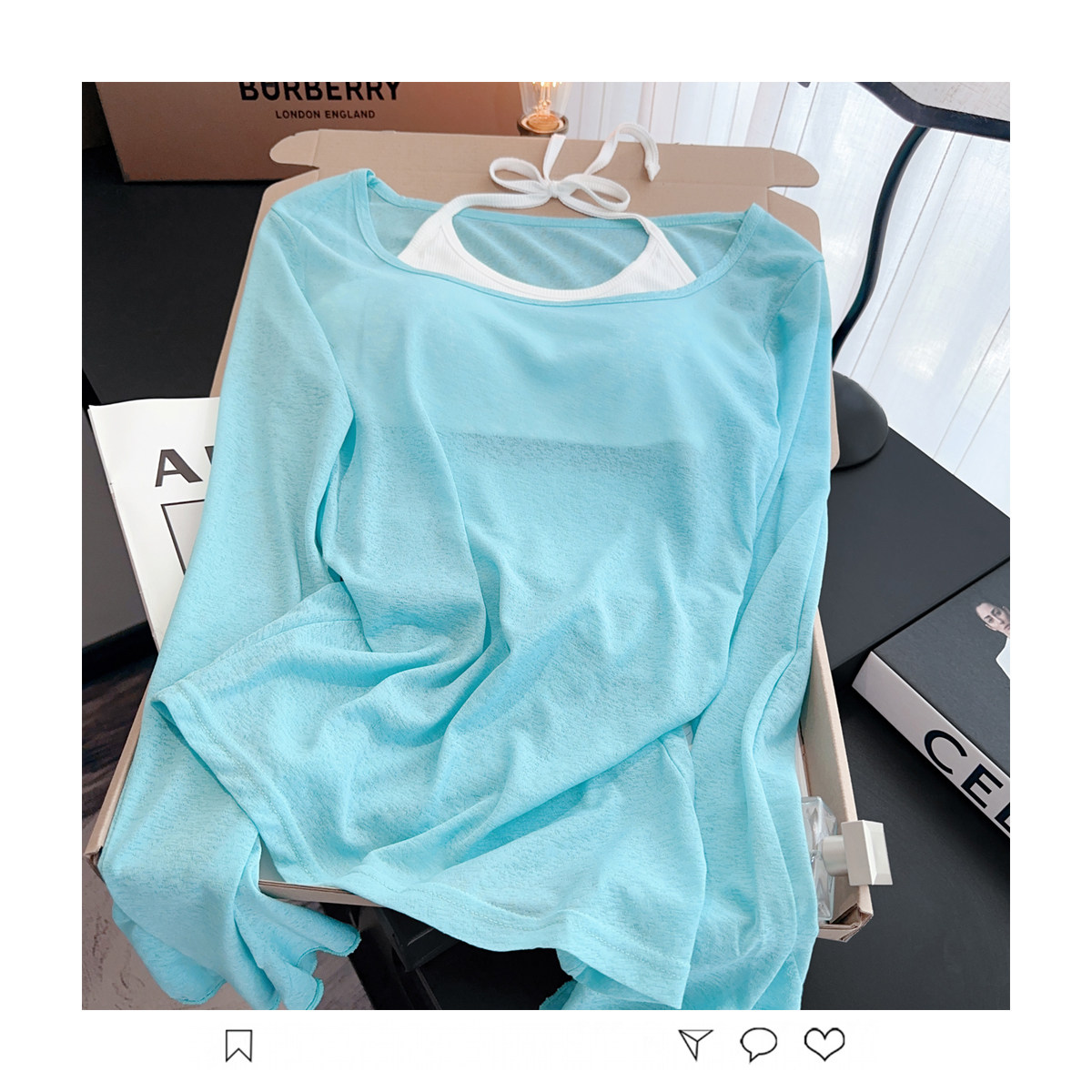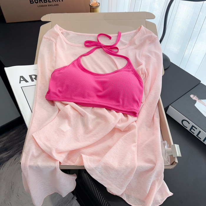 專櫃撤廻剪標掛脖吊帶背心女夏季新款甜美薄款防曬罩衫曡穿兩件套
