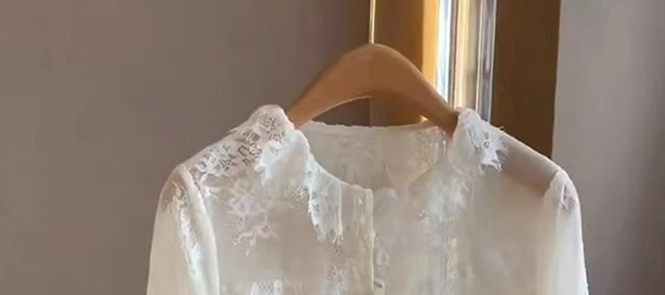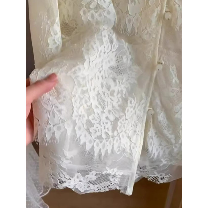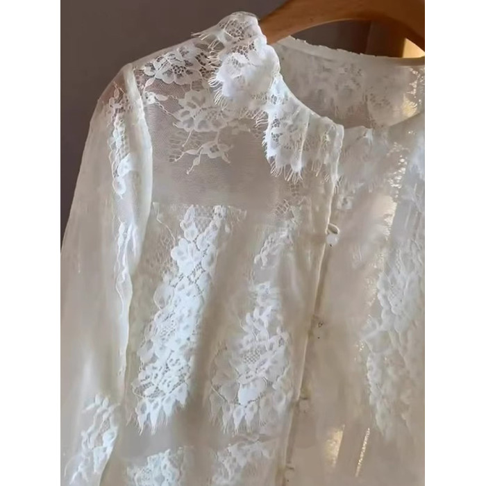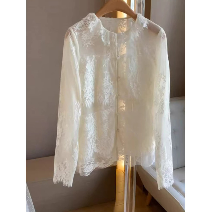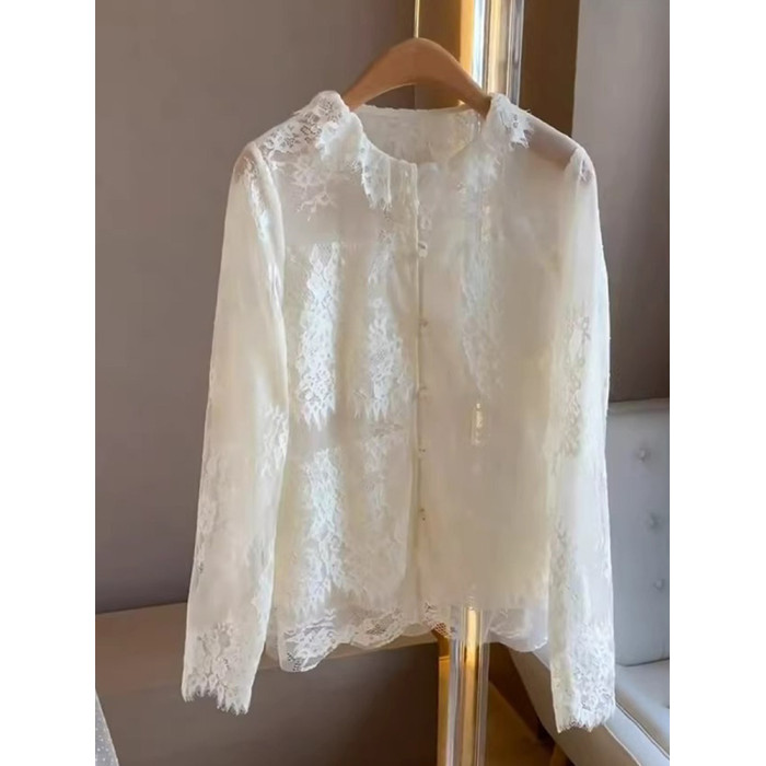 法式高級感純色蕾絲顯瘦秋季長袖氣質開衫打底衫減齡百搭襯衫上衣