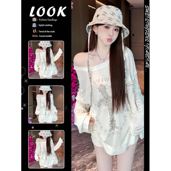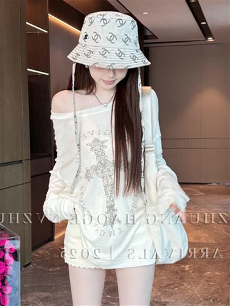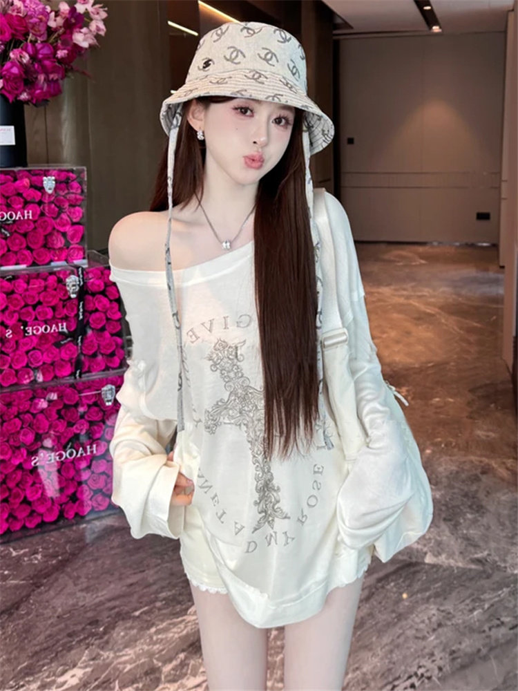 美式印花斜肩白色長袖t恤防曬罩衫女士薄款寬鬆慵懶夏季外穿上衣