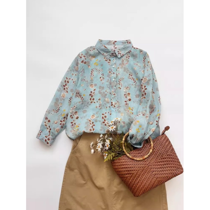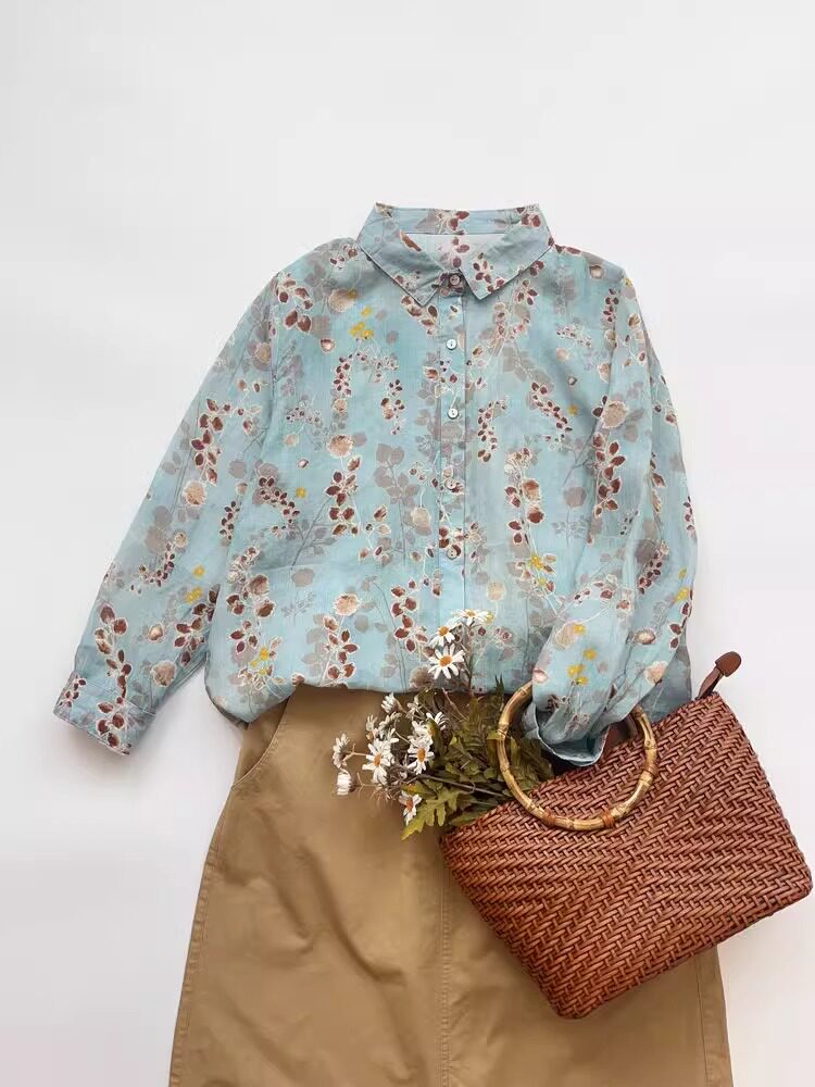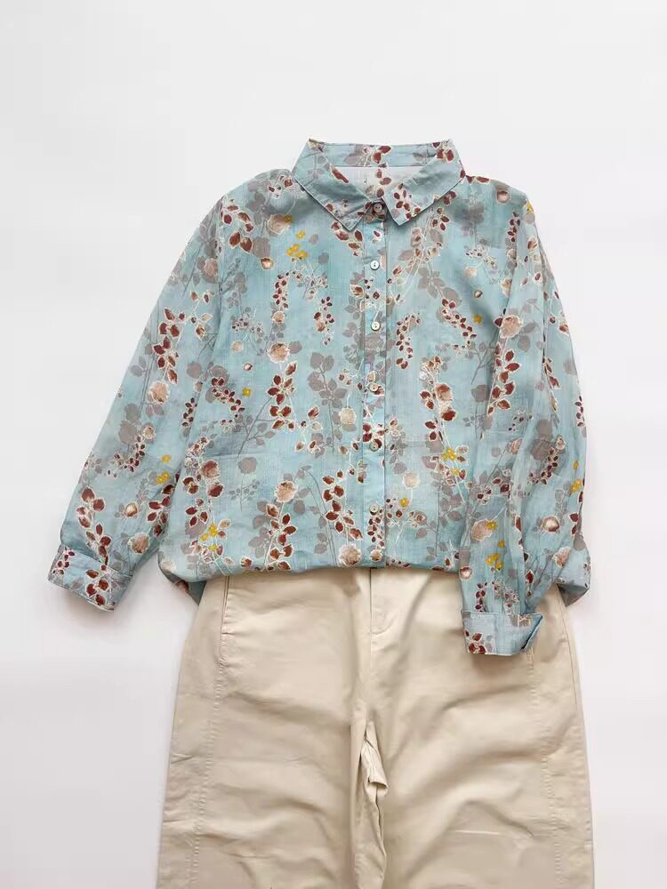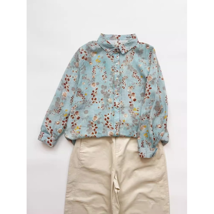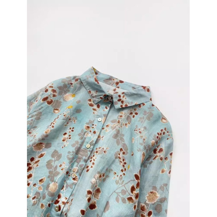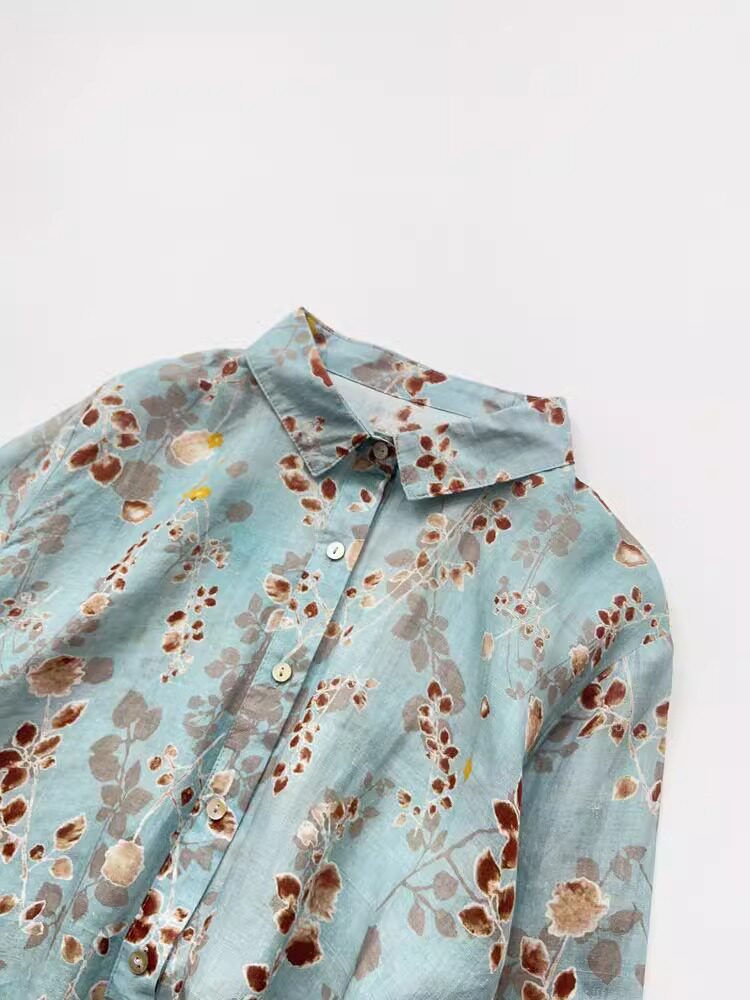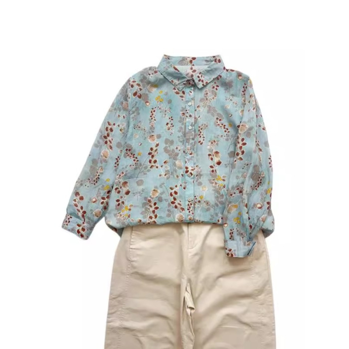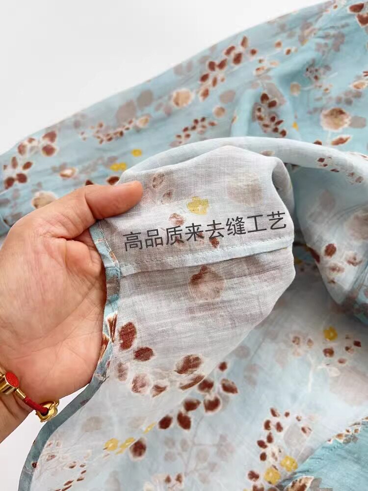 商場折釦店撤櫃文藝印花苧麻襯衫女薄款寬鬆百搭休閒長袖開衫上衣