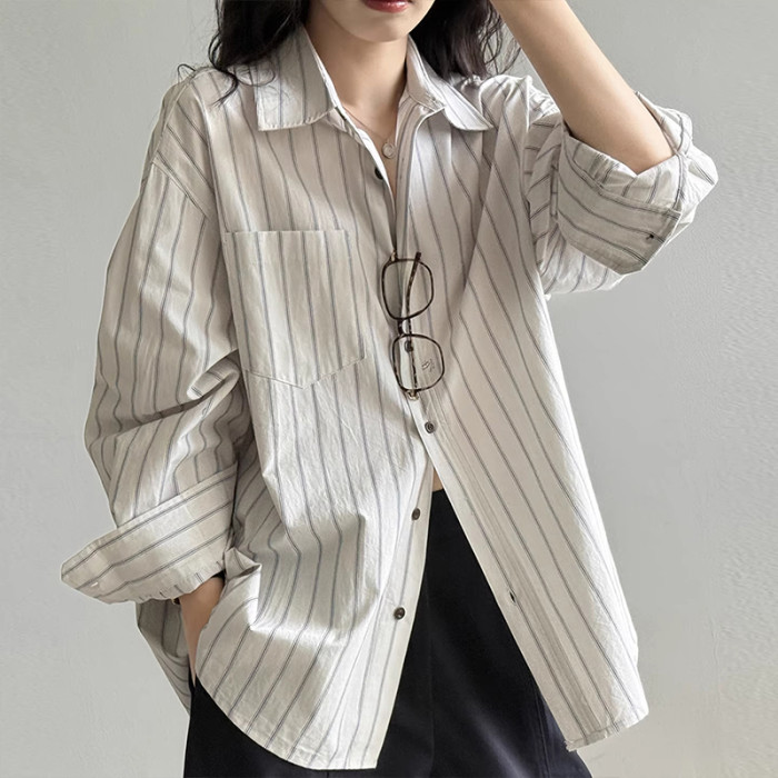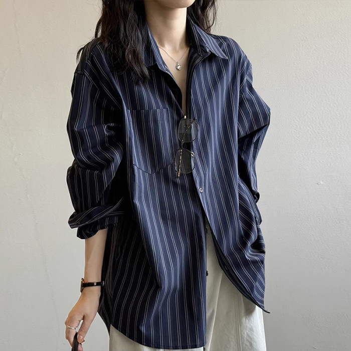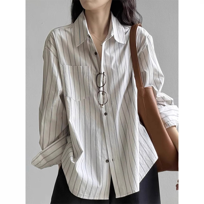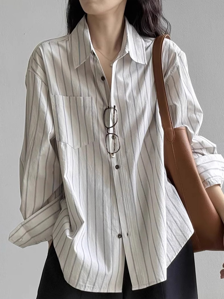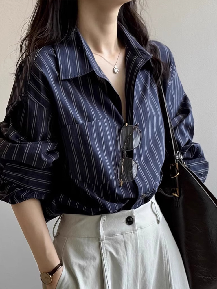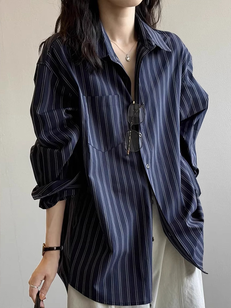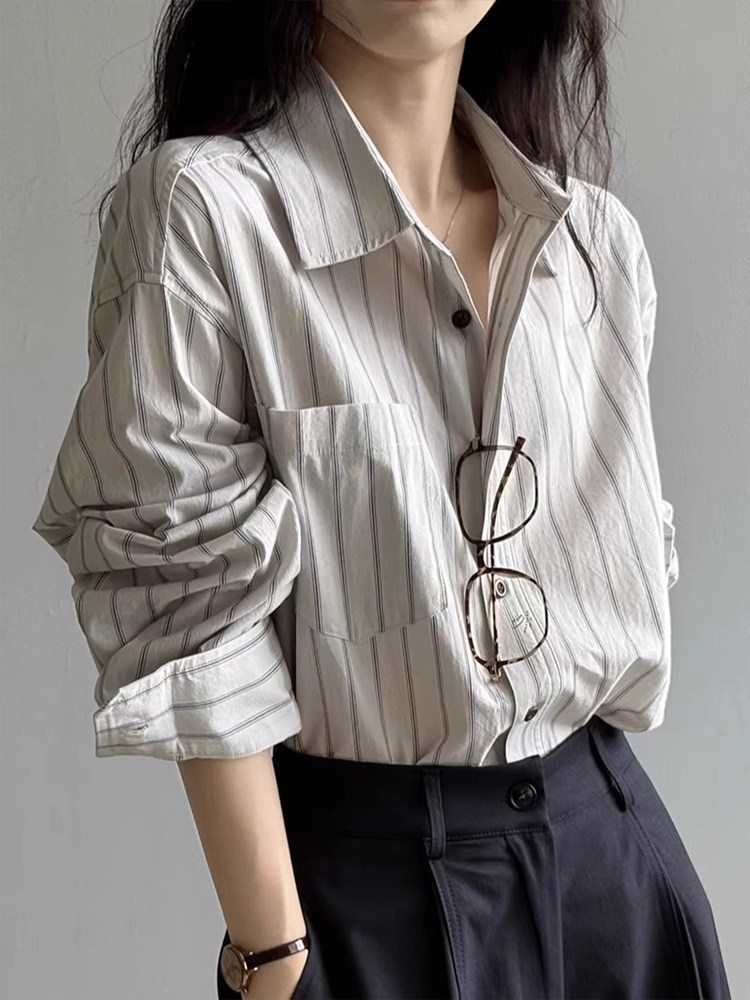 法式復古高級感條紋長袖襯衫女秋季新款時尚通勤寬鬆慵懶減齡上衣