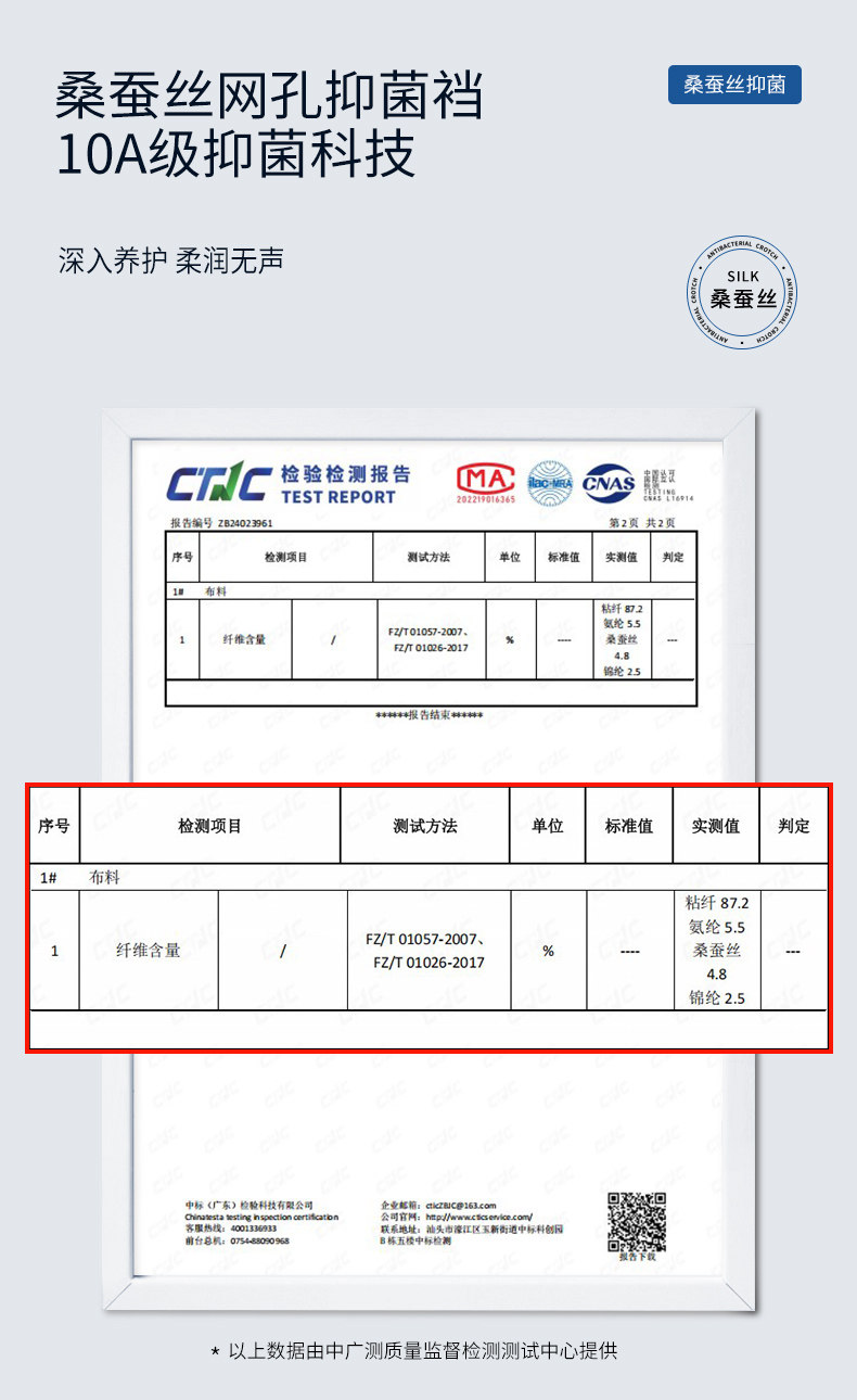 | 襠部材質成分 | 粘膠纖維(粘纖)87.2% 聚氨酯彈性纖維(氨綸)5.5% 桑蠶絲4.8% 聚醯胺纖維(錦綸)2.5% |
