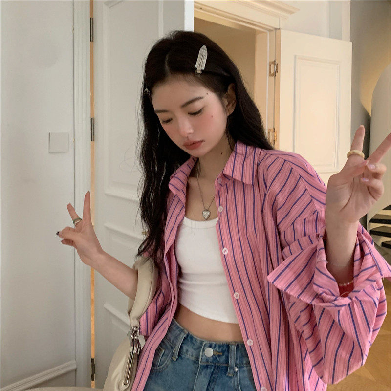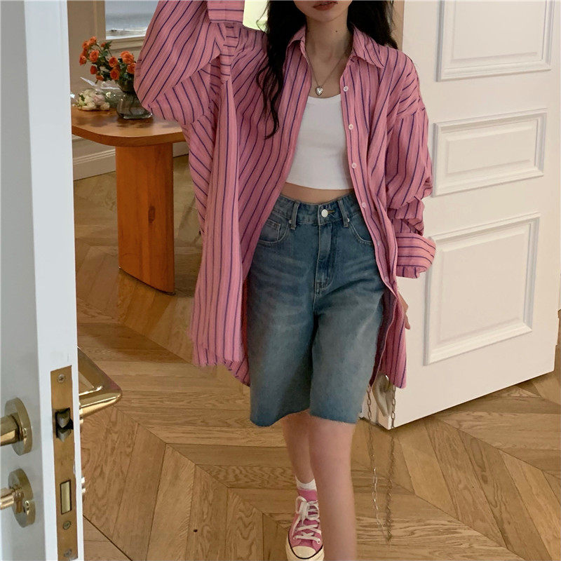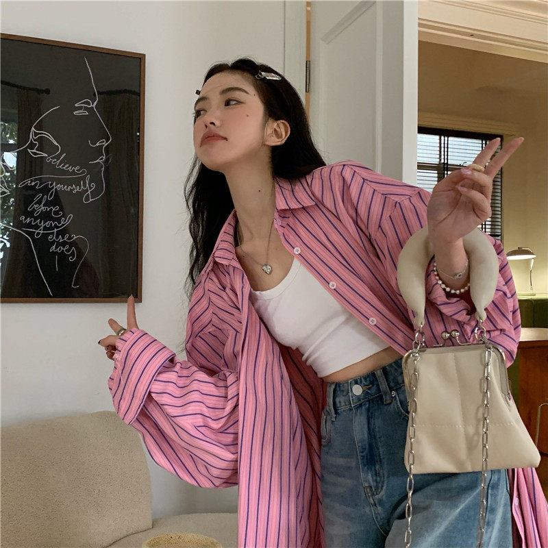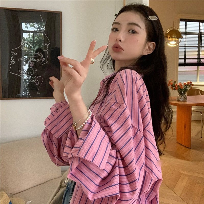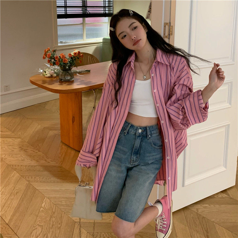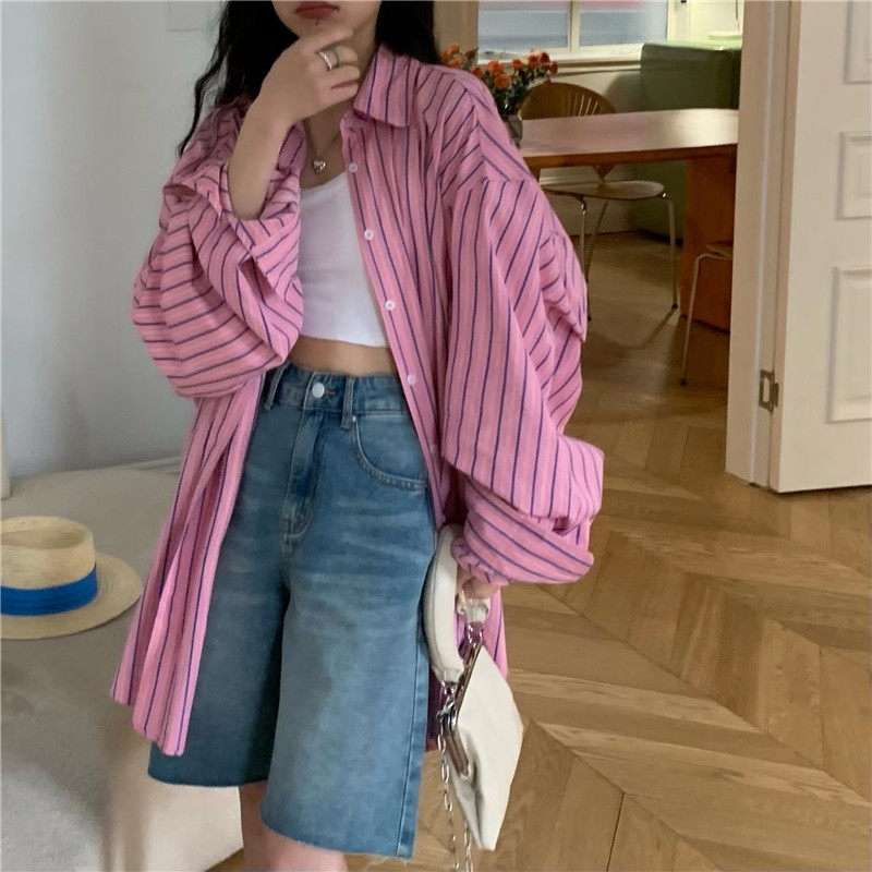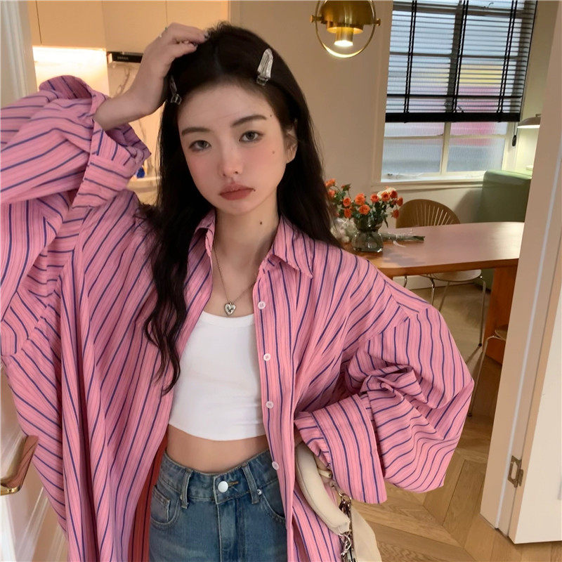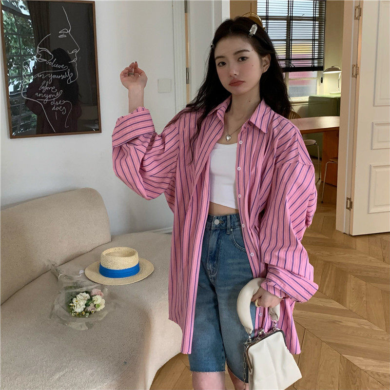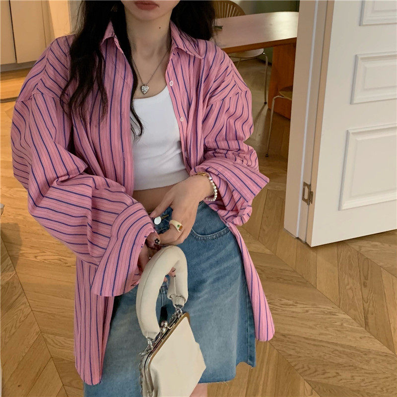粉色撞色竪條紋襯衫女春夏新款中長款寬鬆大版oversize薄款外套