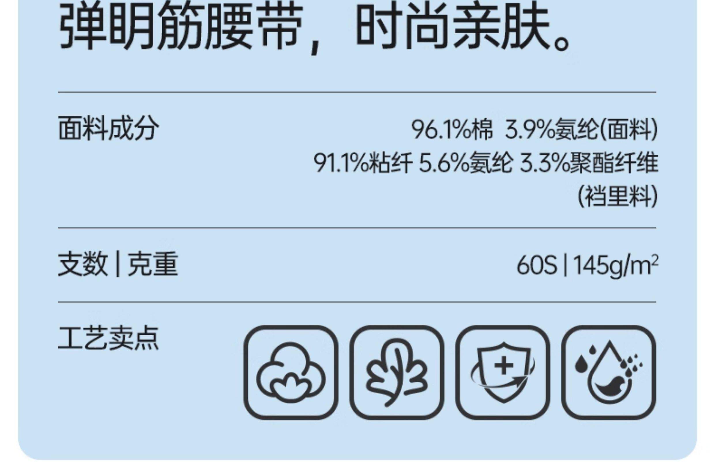 | 襠部材質成分 | 粘膠纖維(粘纖)91.1% 聚氨酯彈性纖維(氨綸)5.6% 聚酯纖維3.3% |