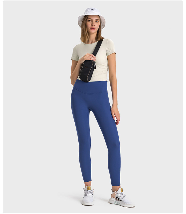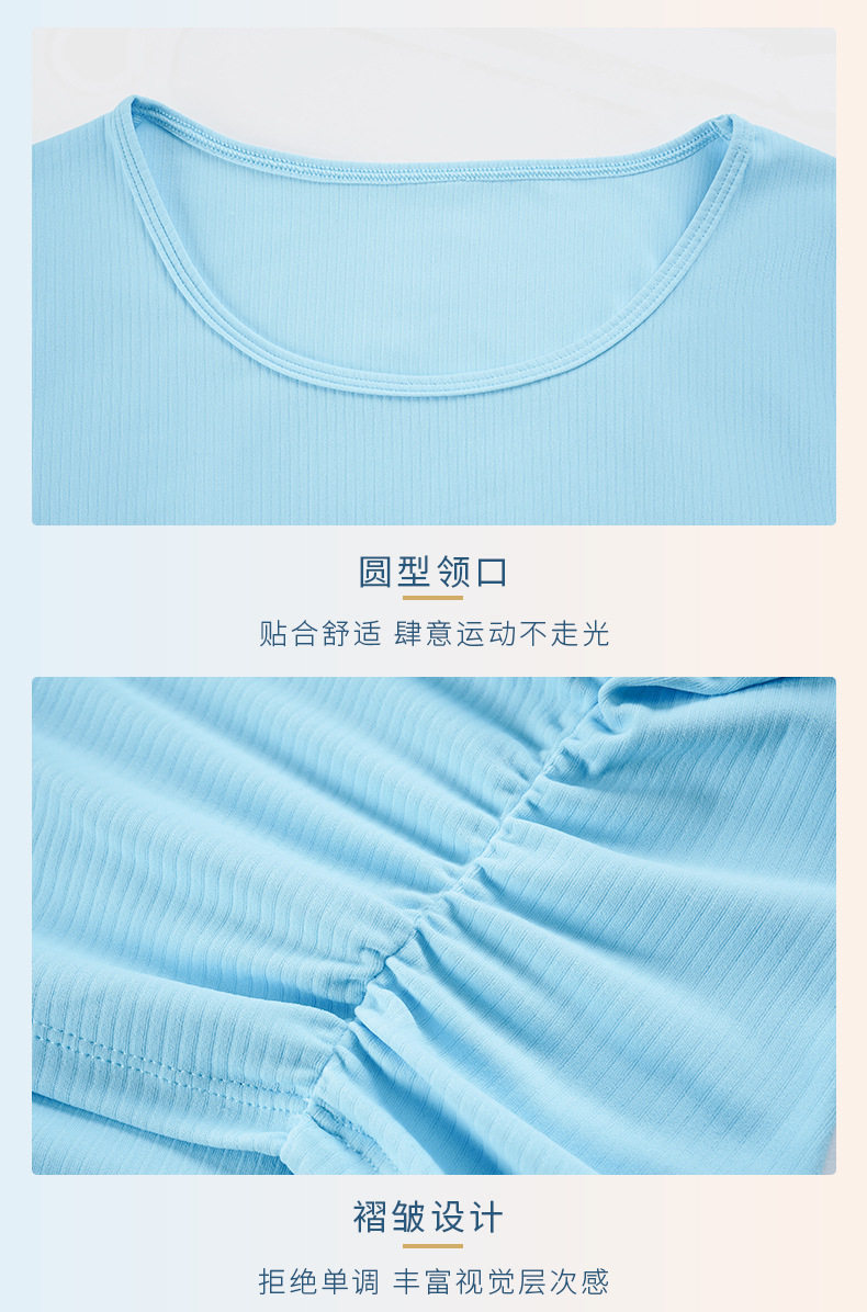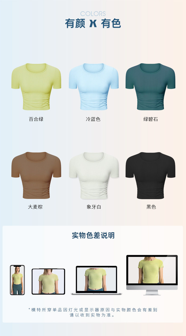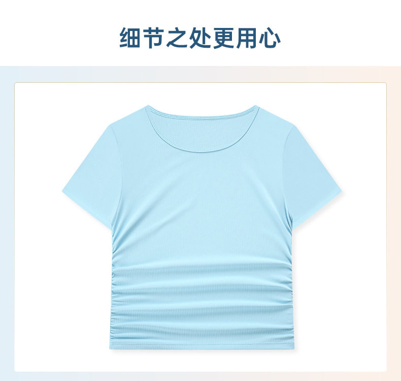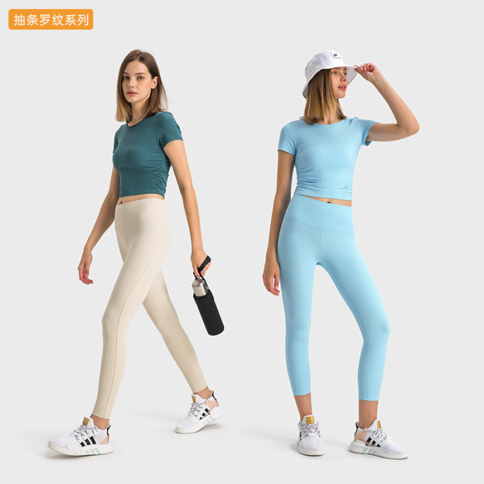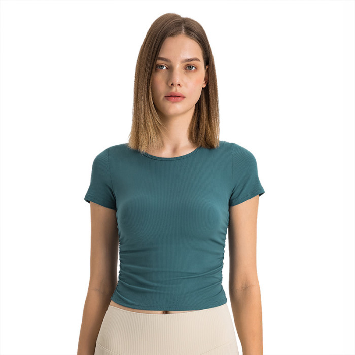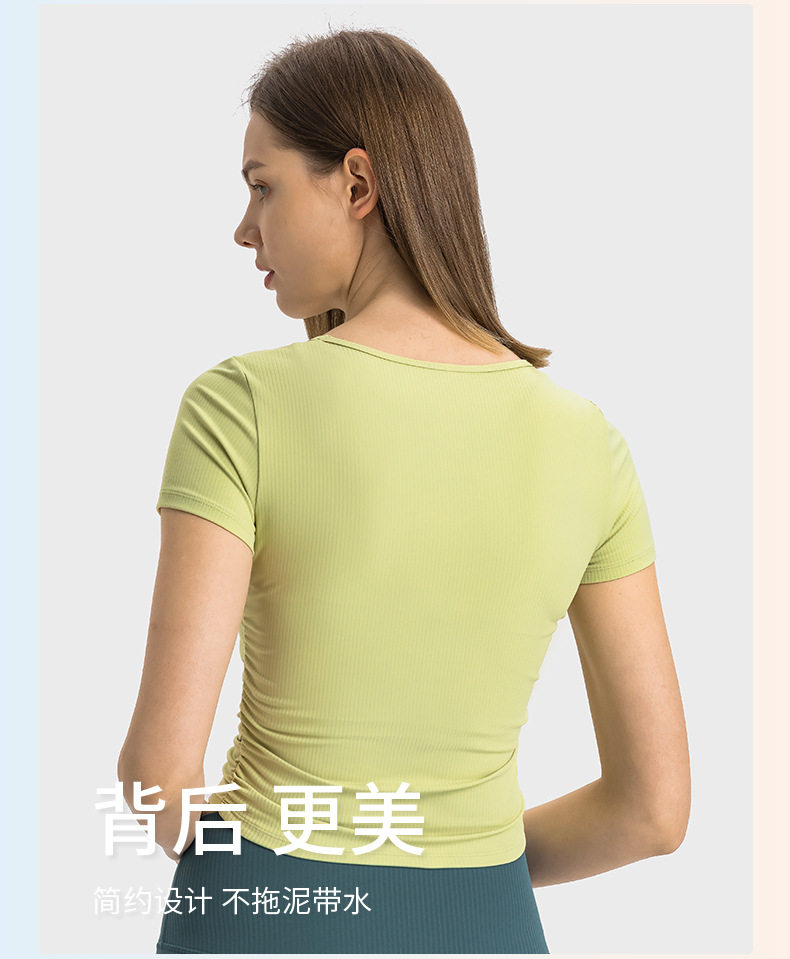 抽條羅紋微褶收腰心機短款運動短袖高彈裸感修身顯瘦瑜珈上衣