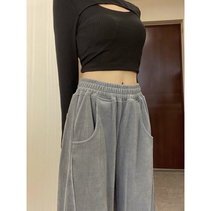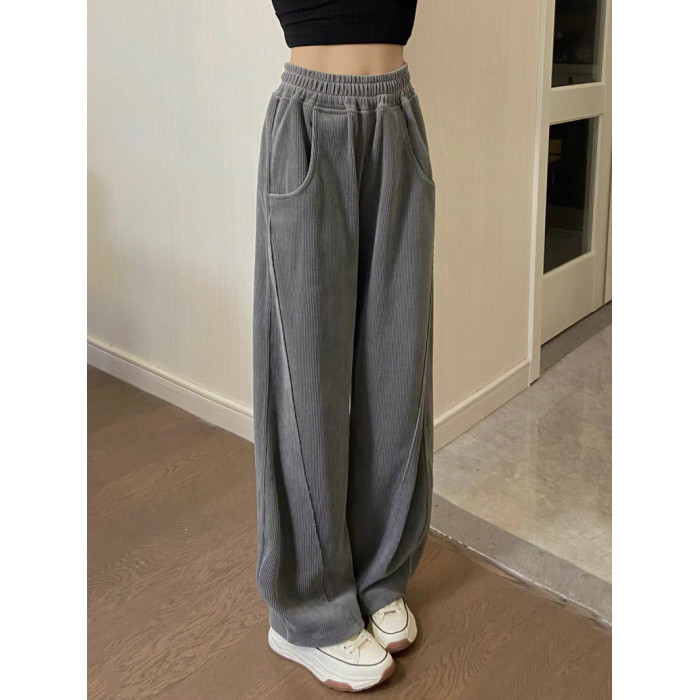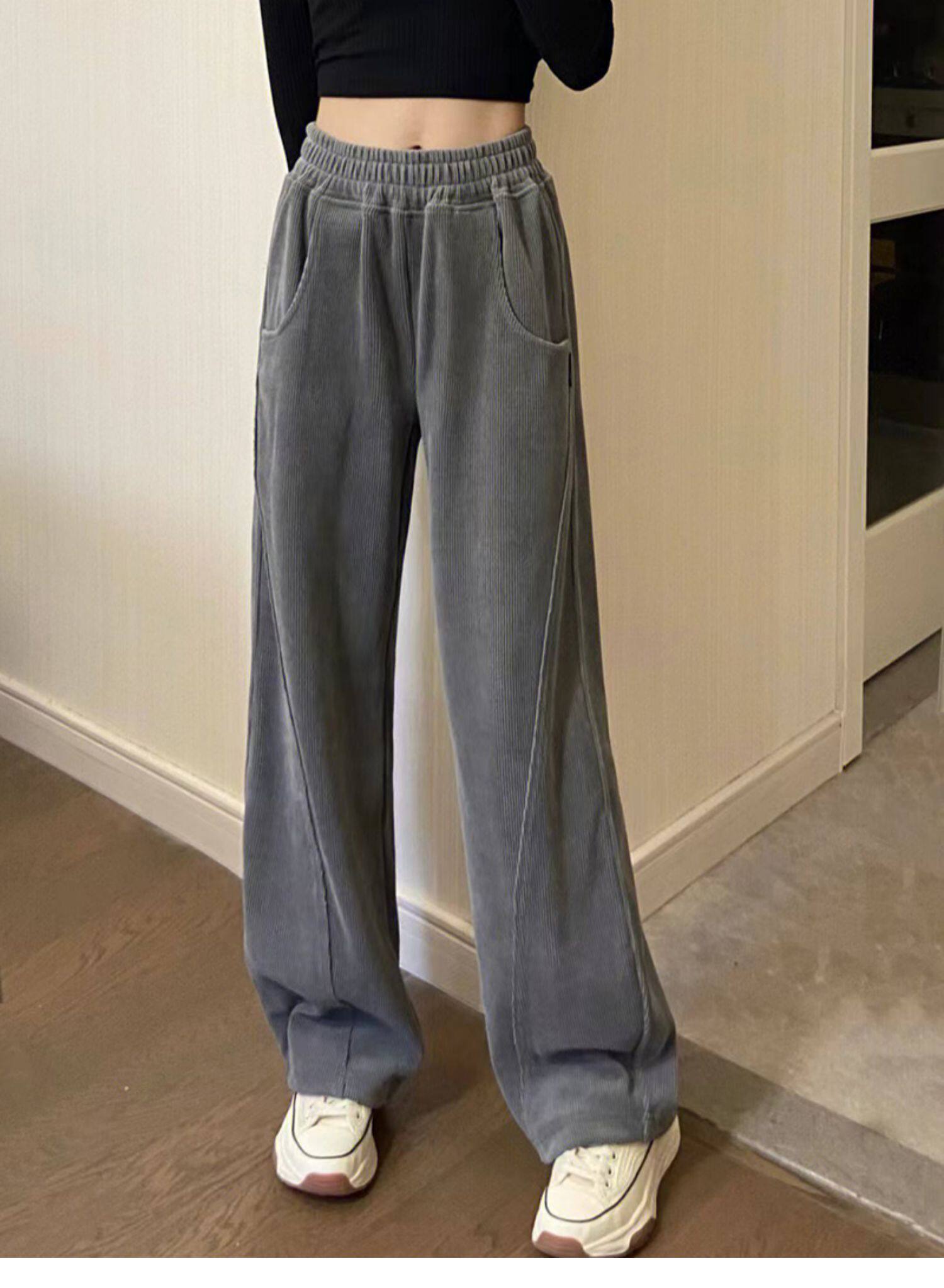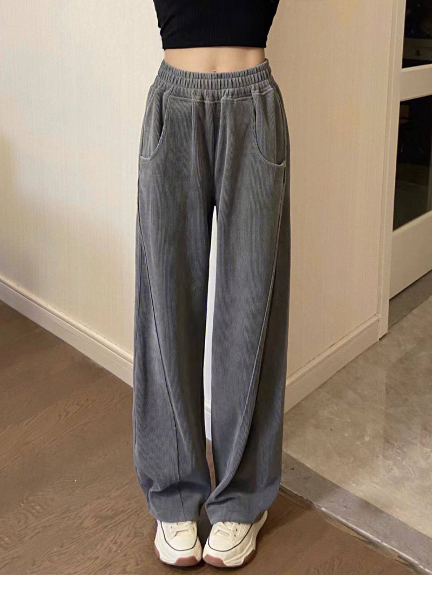 灰色燈芯絨濶腿褲女秋冬高腰垂感顯瘦直筒寬鬆加絨休閒拖地長褲子