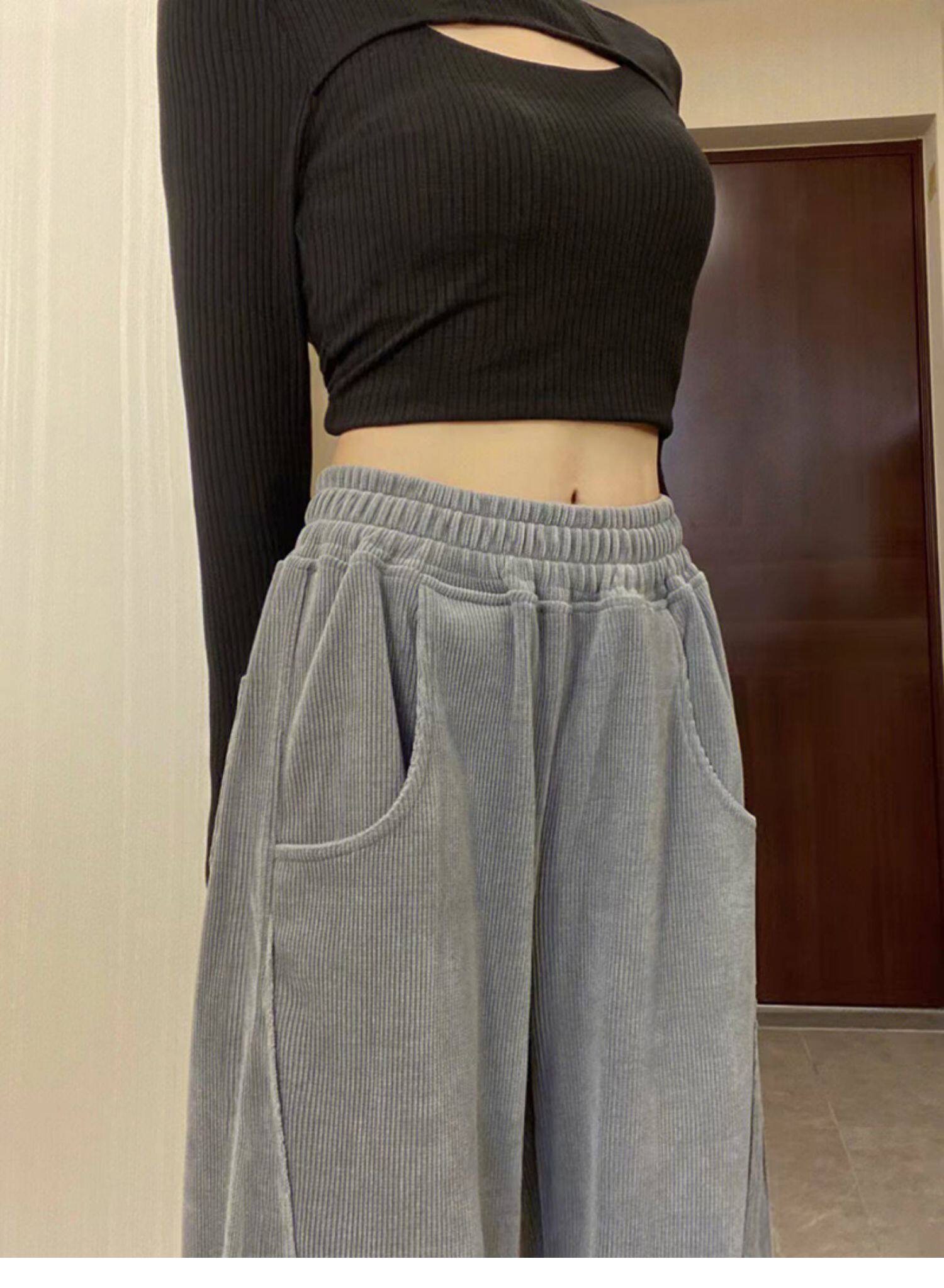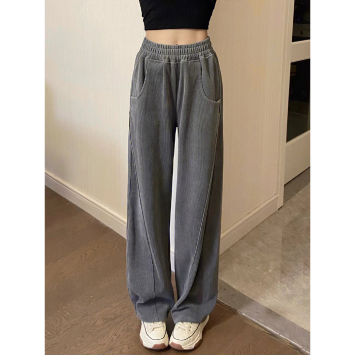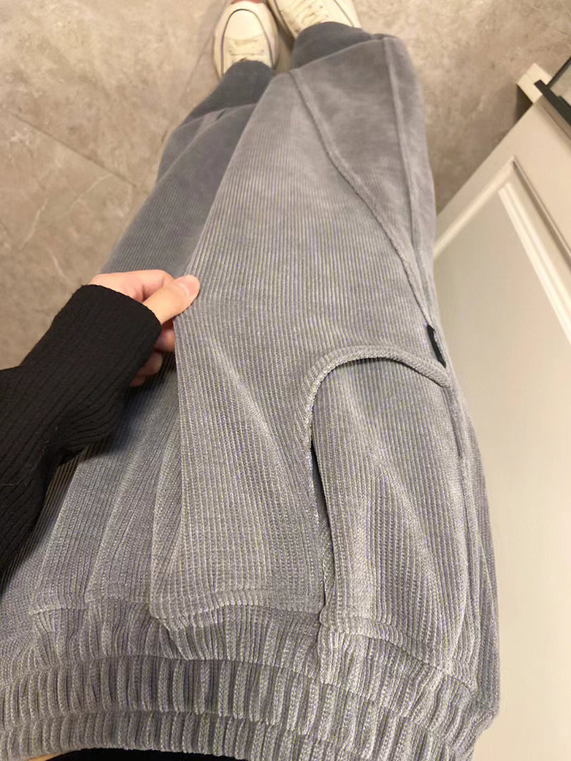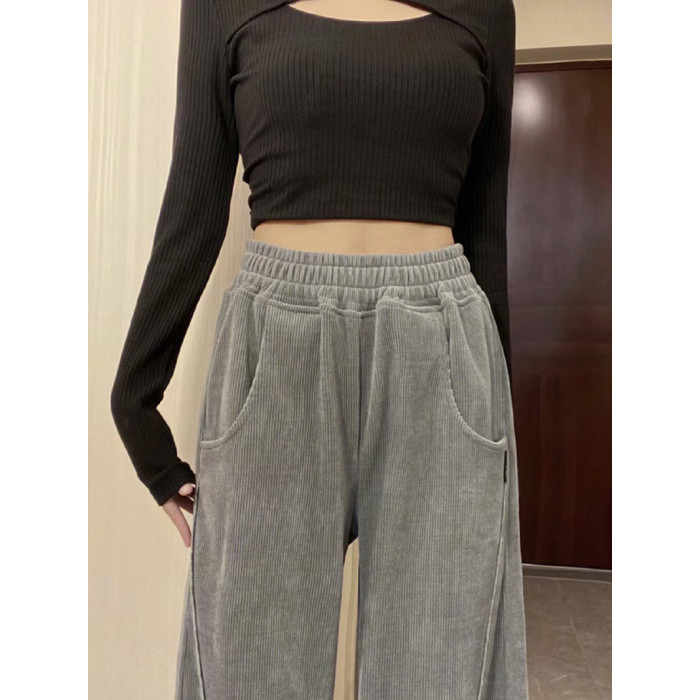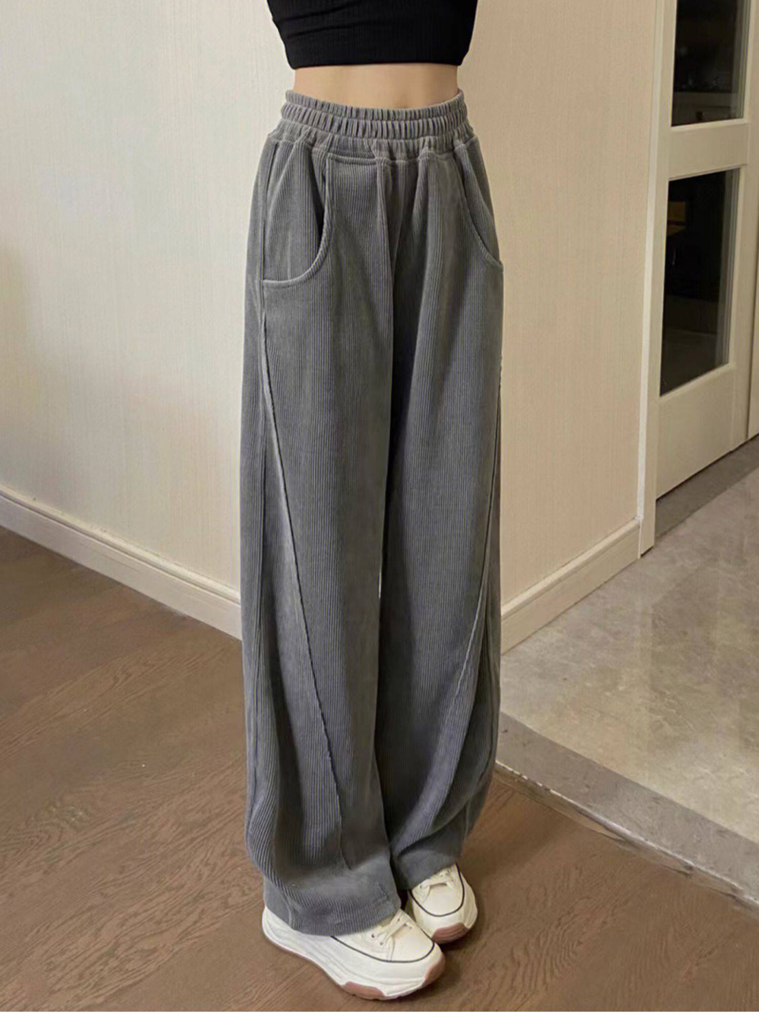 灰色燈芯絨濶腿褲女秋冬高腰垂感顯瘦直筒寬鬆加絨休閒拖地長褲子