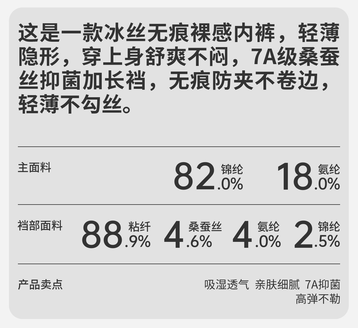 | 襠部材質成分 | 粘膠纖維(粘纖)88.9% 桑蠶絲4.6% 聚氨酯彈性纖維(氨綸)4% 聚醯胺纖維(錦綸)2.5% |