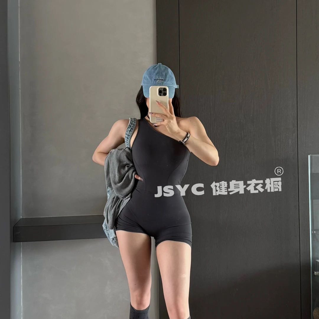 【連體衣】斜單肩運動美背瑜珈連體服裸感提臀緊身健身服連體衣女