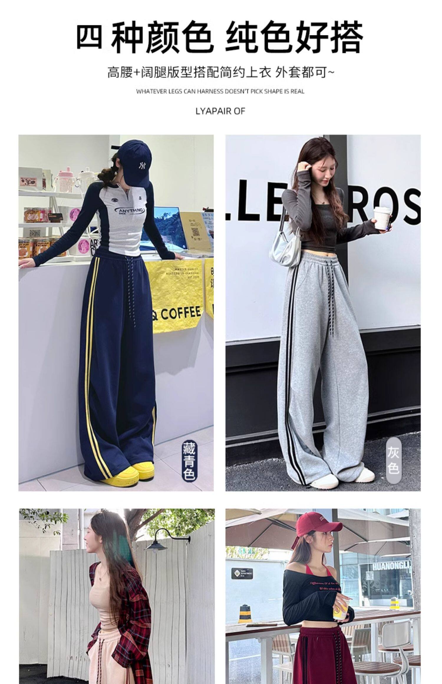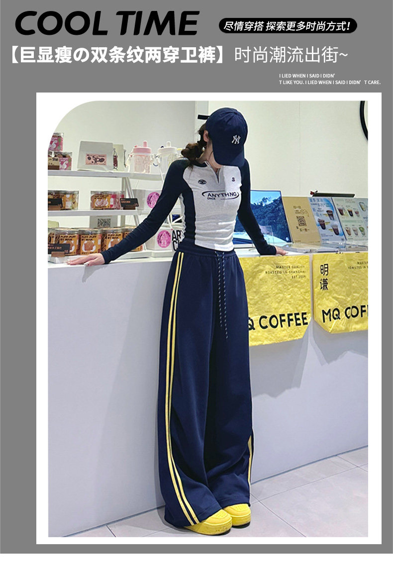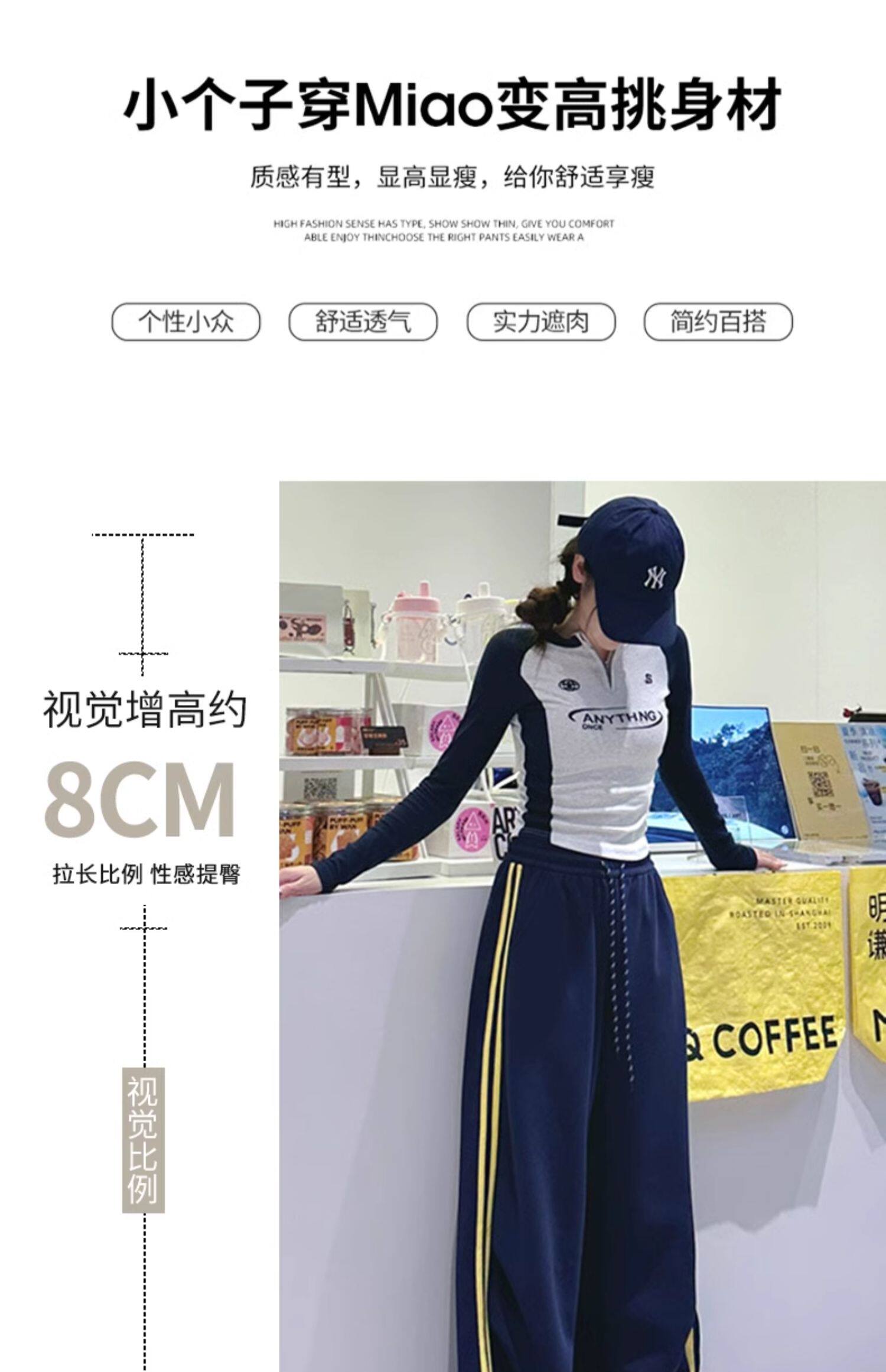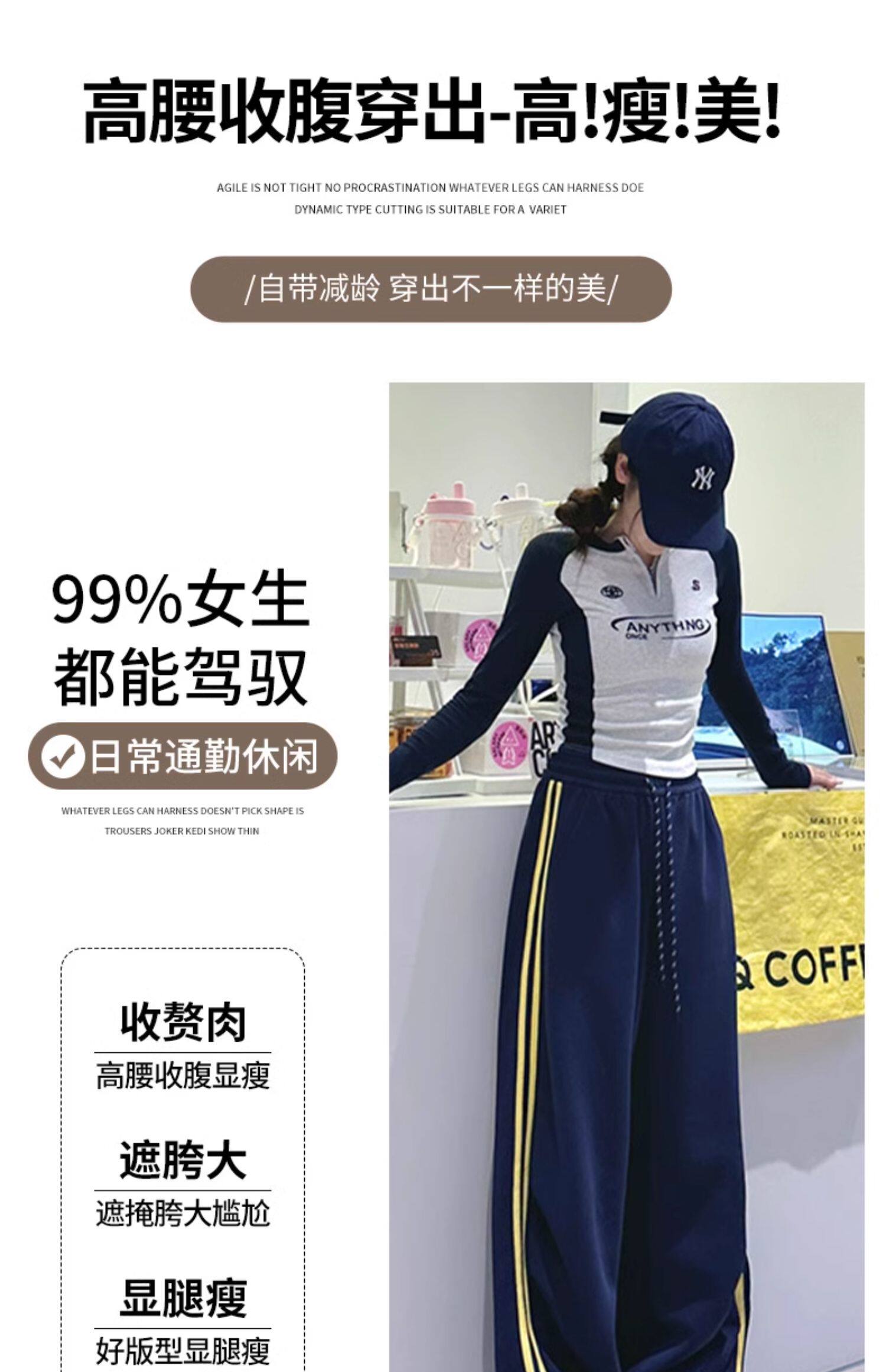 藏青色雙杠運動褲女春秋2024新款寬鬆降落傘兵工裝褲美式濶腿衛褲