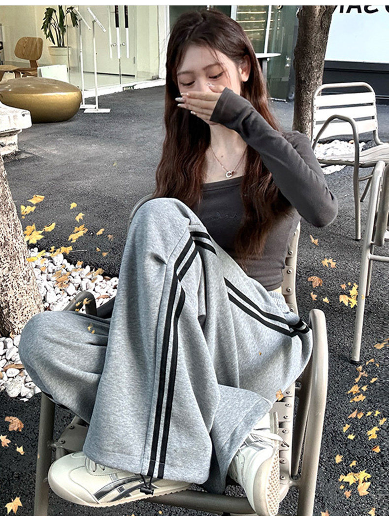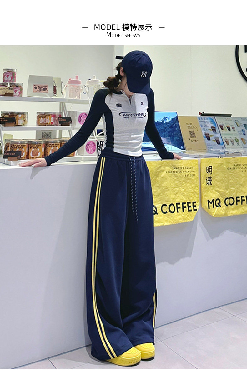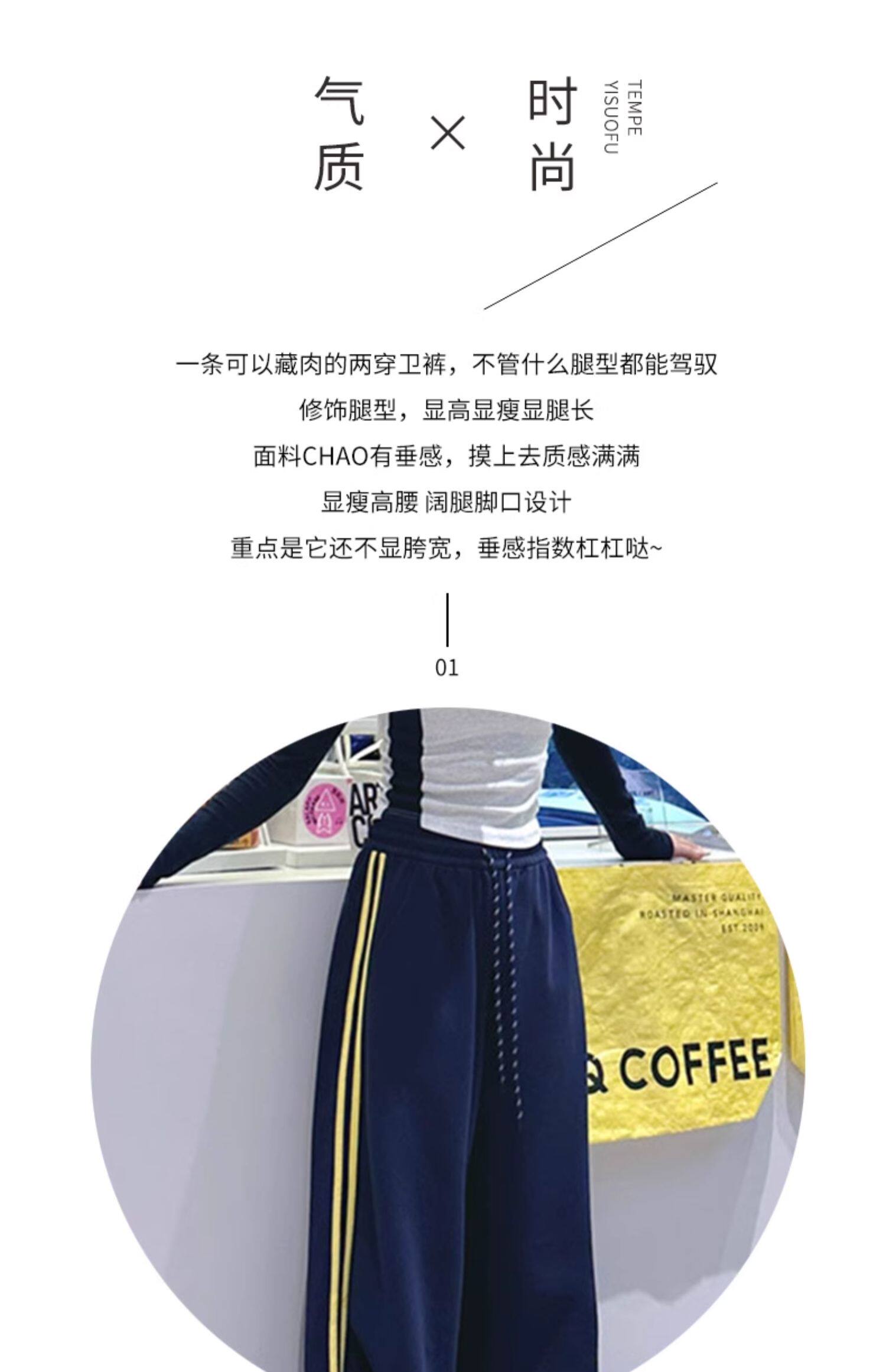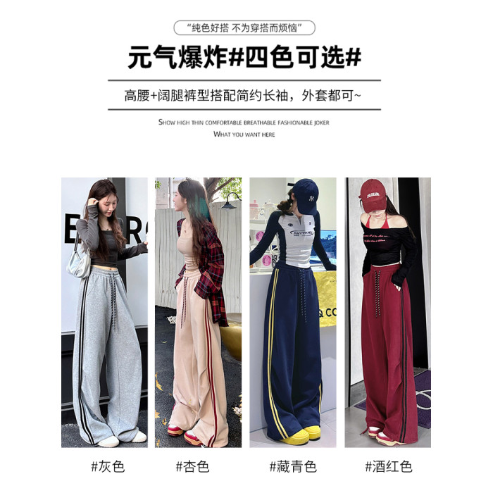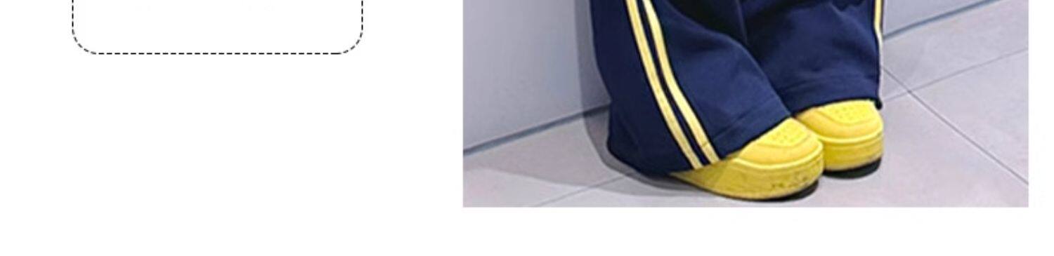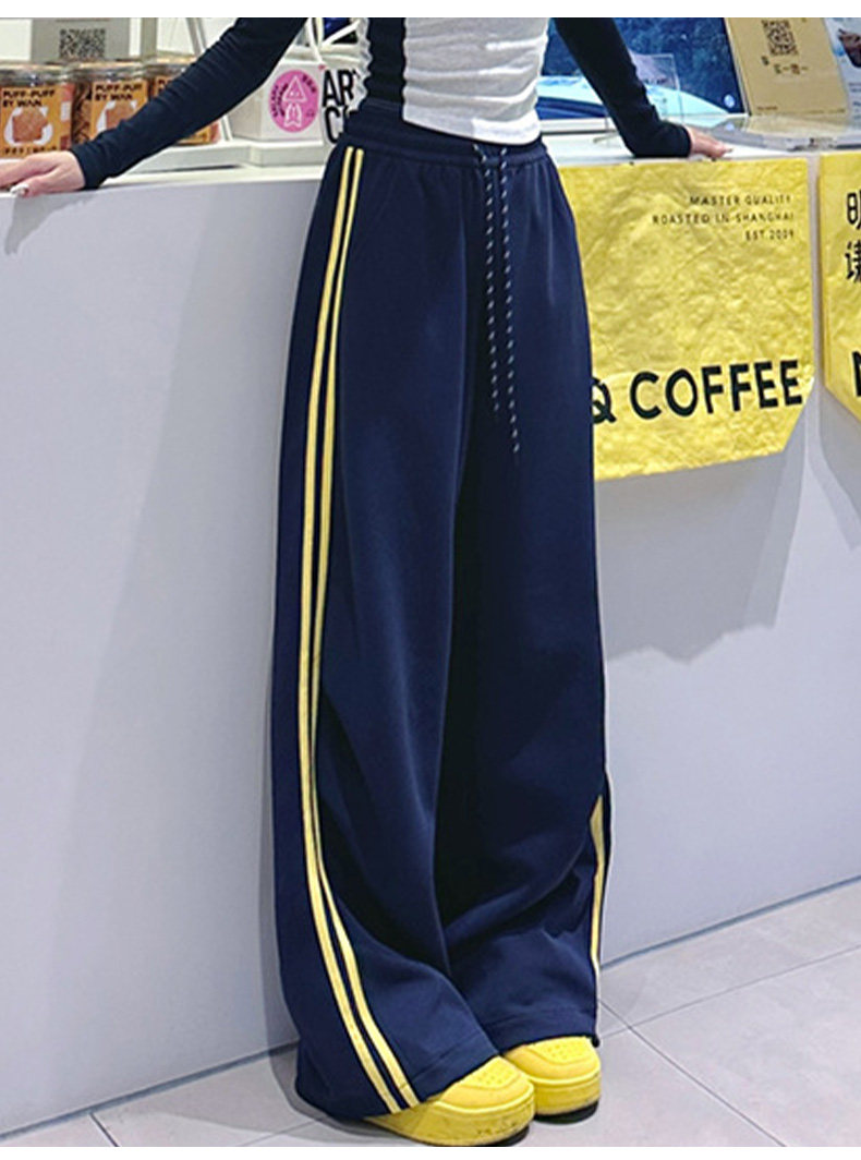 藏青色雙杠運動褲女春秋2024新款寬鬆降落傘兵工裝褲美式濶腿衛褲
