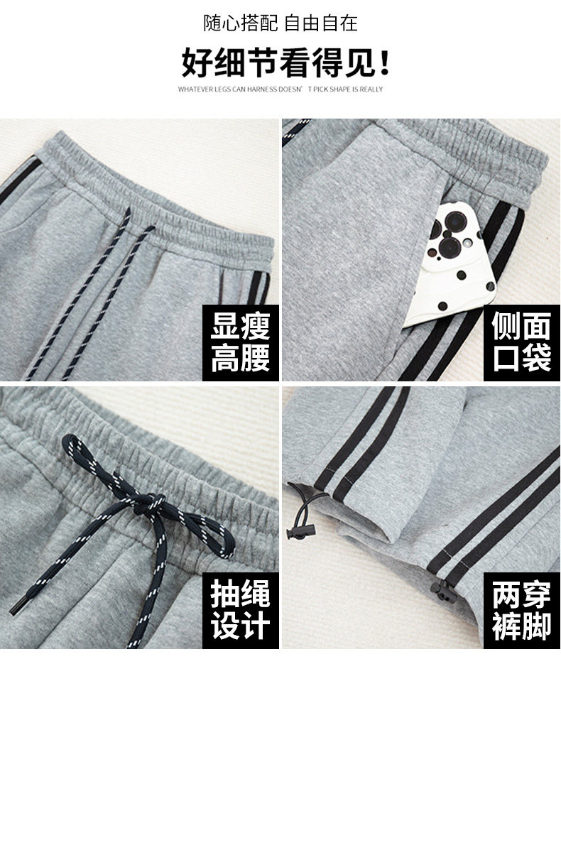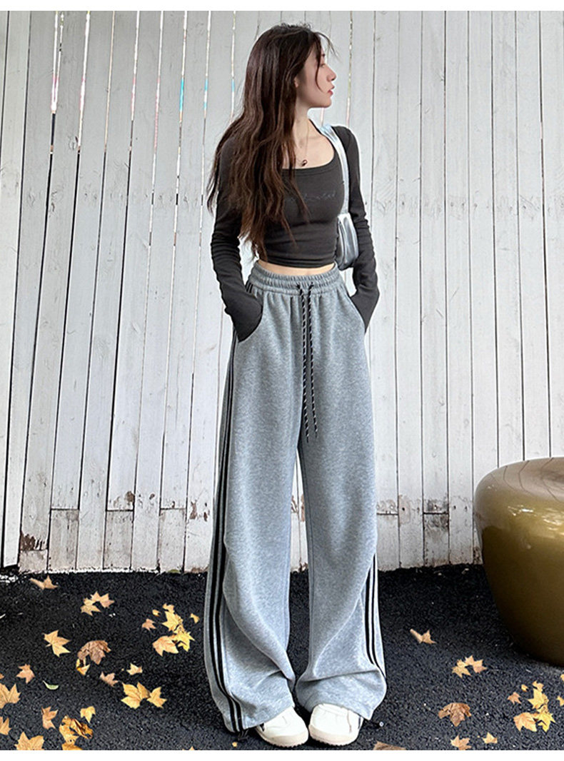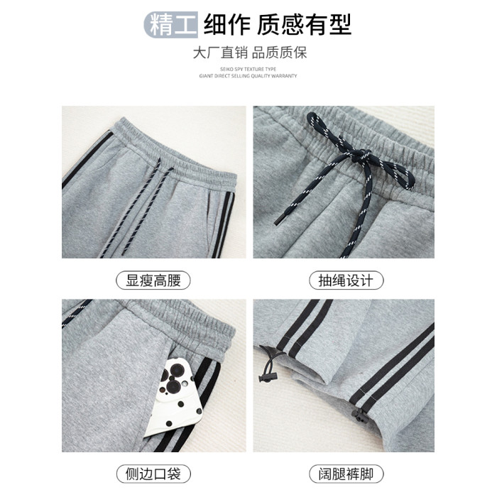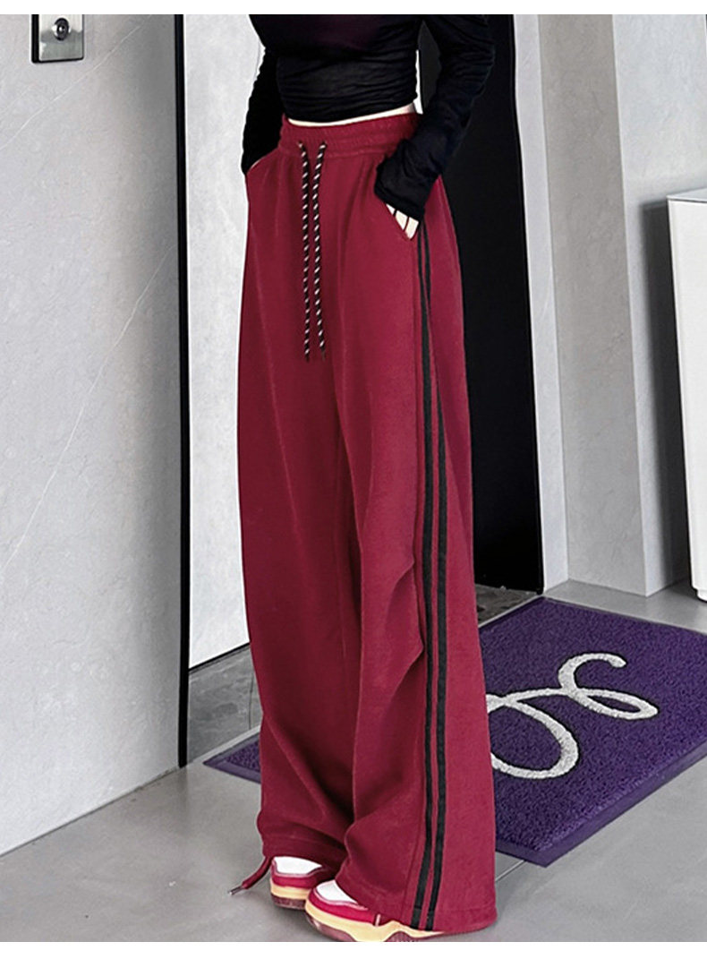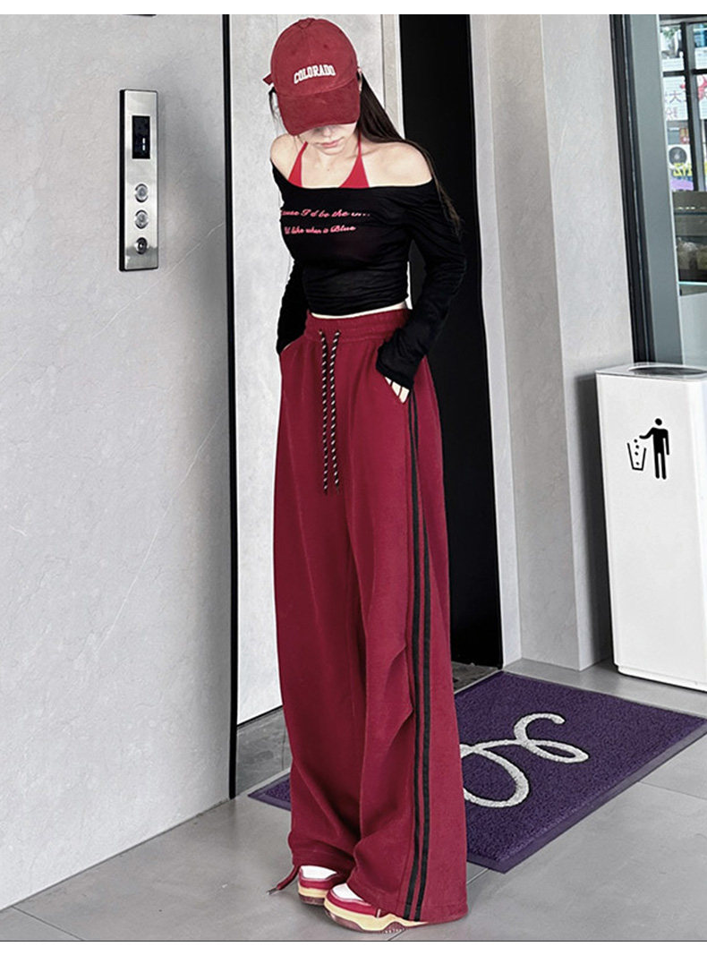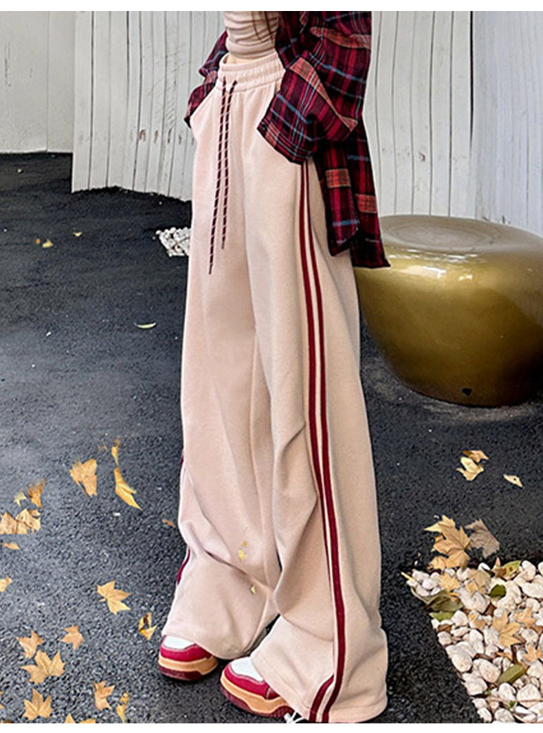 藏青色雙杠運動褲女春秋2024新款寬鬆降落傘兵工裝褲美式濶腿衛褲