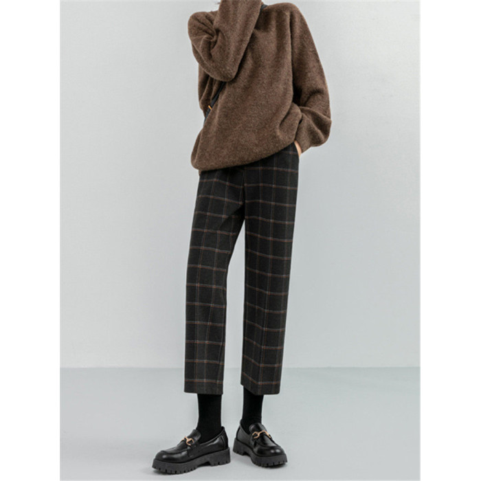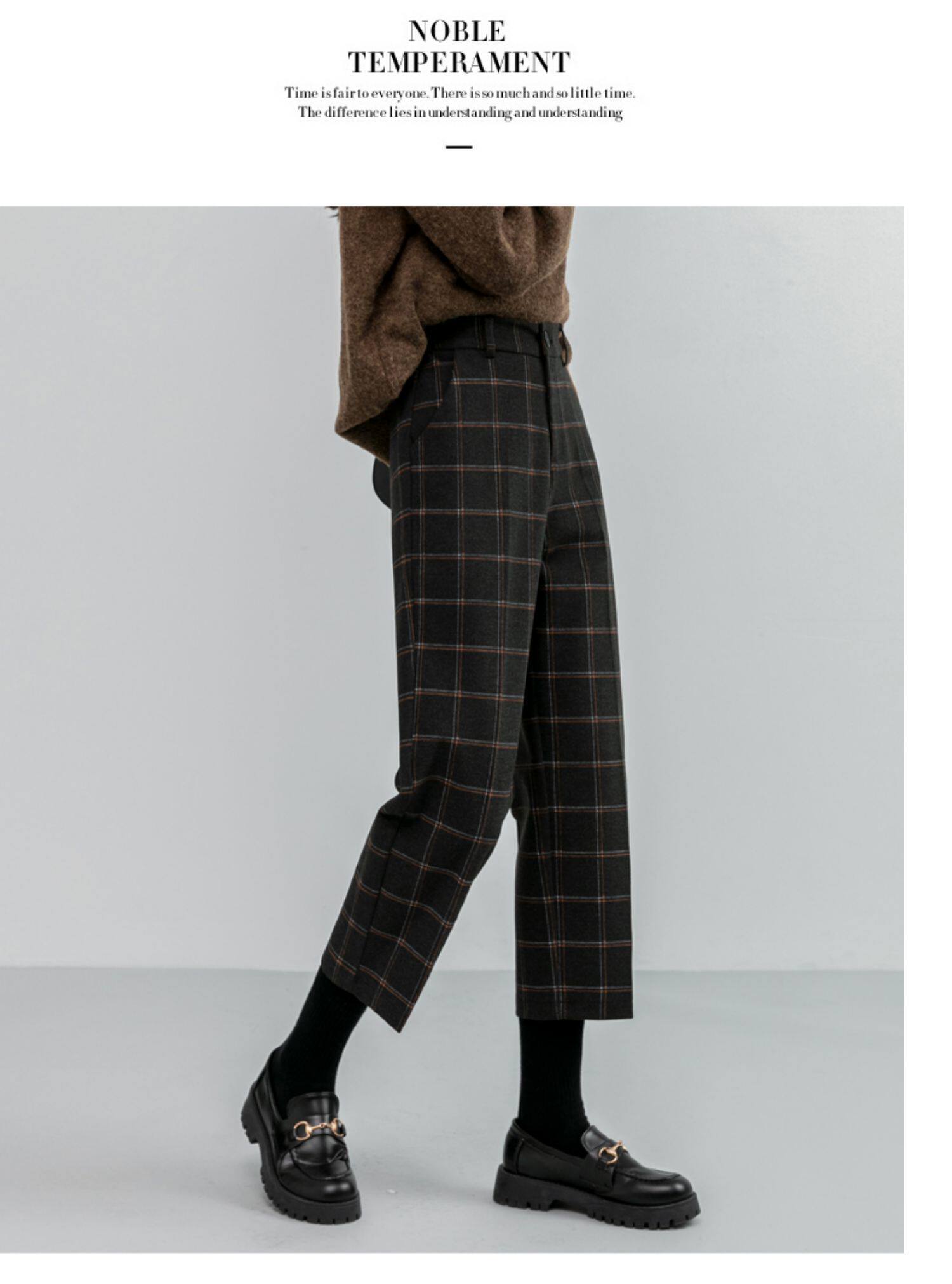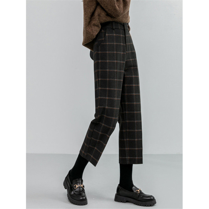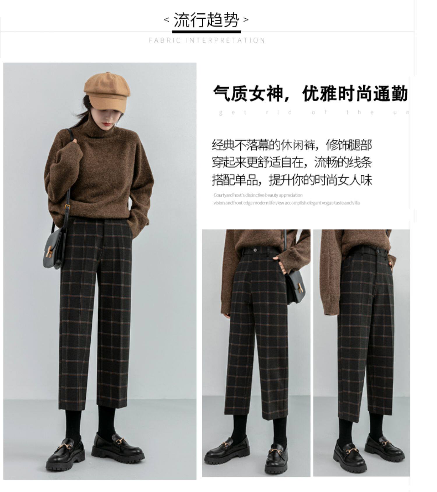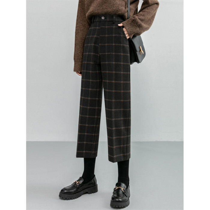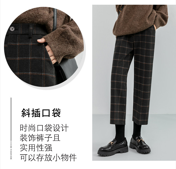 毛呢褲格子直筒秋冬女今年流行的九分小個子濶腿復古冬季褲子靴褲