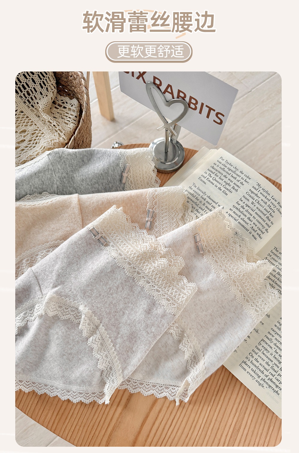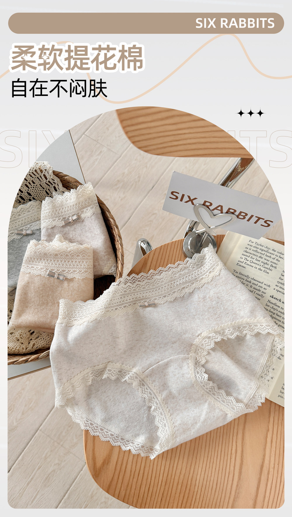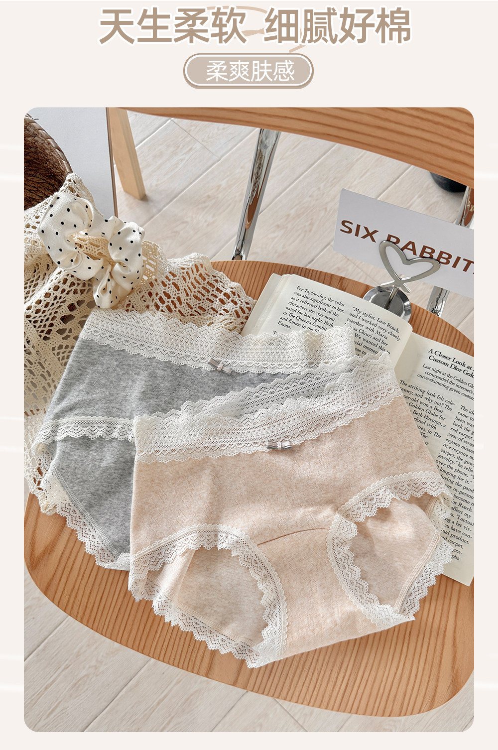 六隻兔子3條裝內褲女純棉10A抑菌底襠三角褲蕾絲邊中腰包臀短褲