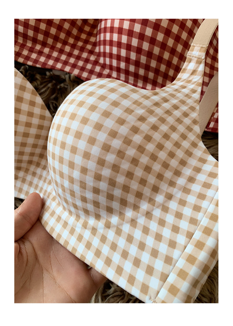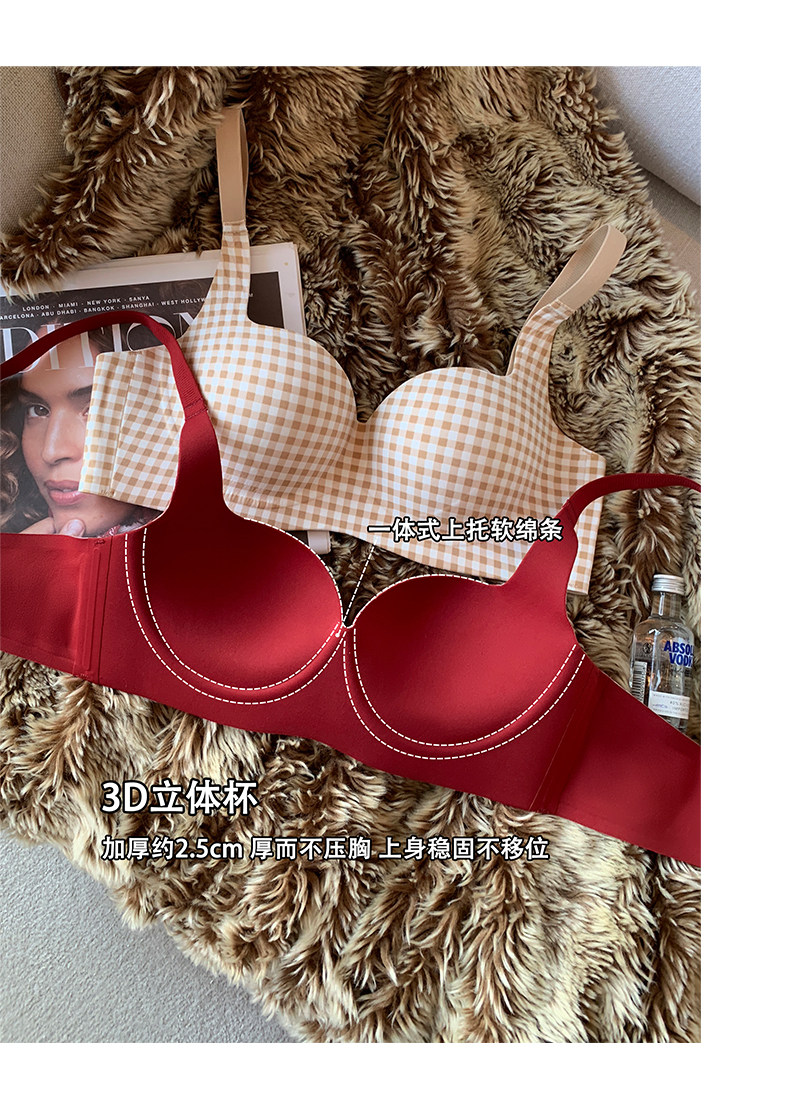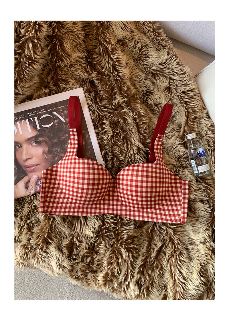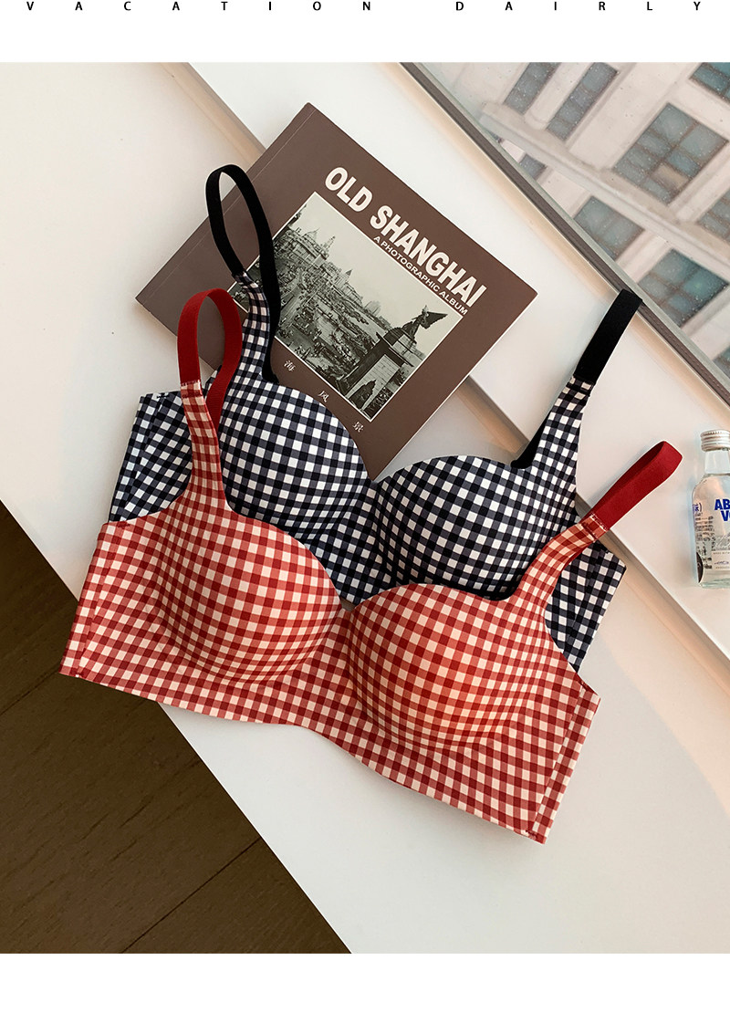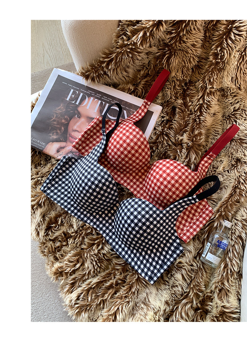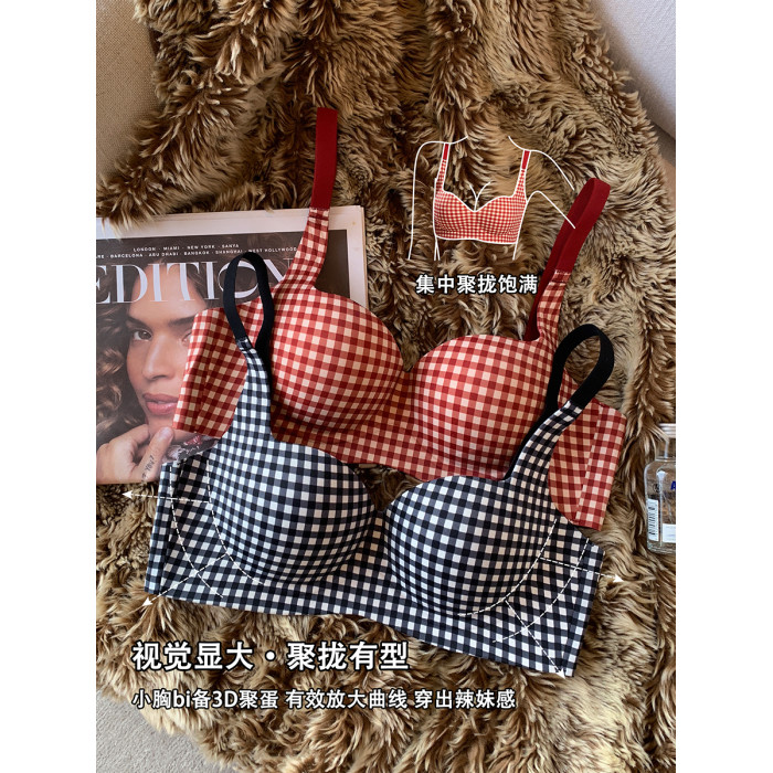 紅色格子抑菌內衣女小胸聚攏提拉上托升杯無鋼圈收副乳防下垂文胸