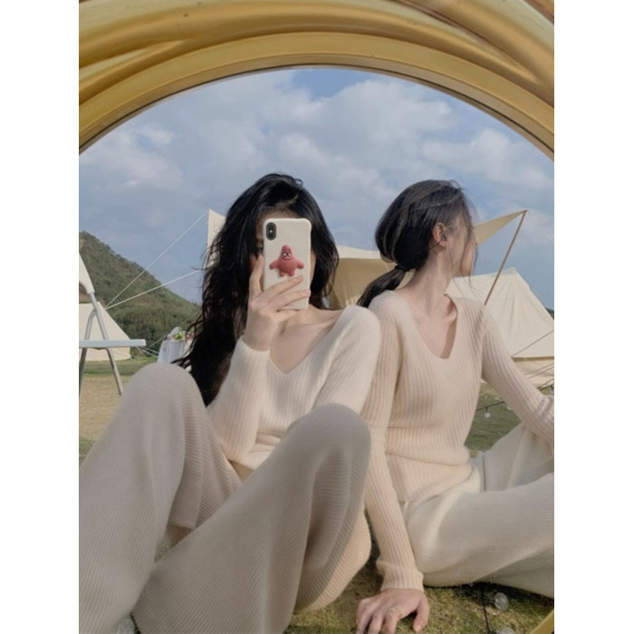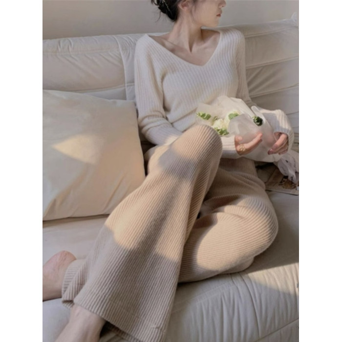 溫柔軟糯針織濶腿褲女秋冬高腰直筒寬鬆休閒褲子顯瘦垂感拖地長褲