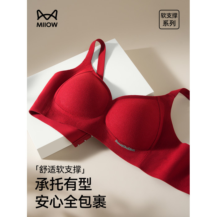 貓人紅色內衣女小胸聚攏收副乳提拉防下垂軟支撐上托無鋼圈文胸罩