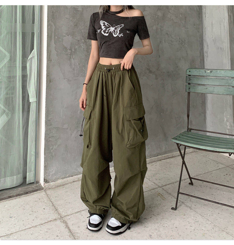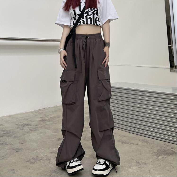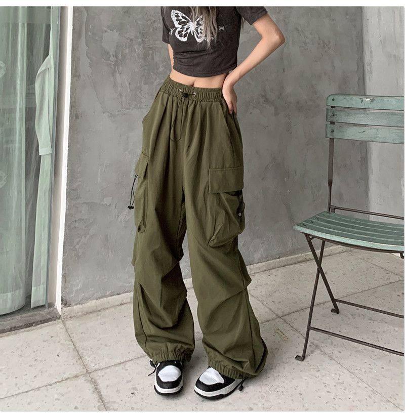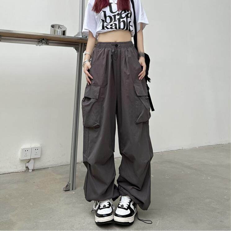 夏季美式復古工裝休閒褲女百搭直筒垂感寬鬆濶腿褲子ins束腳長褲