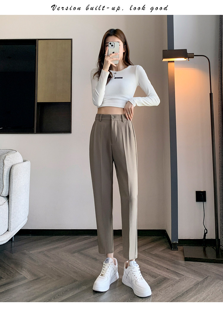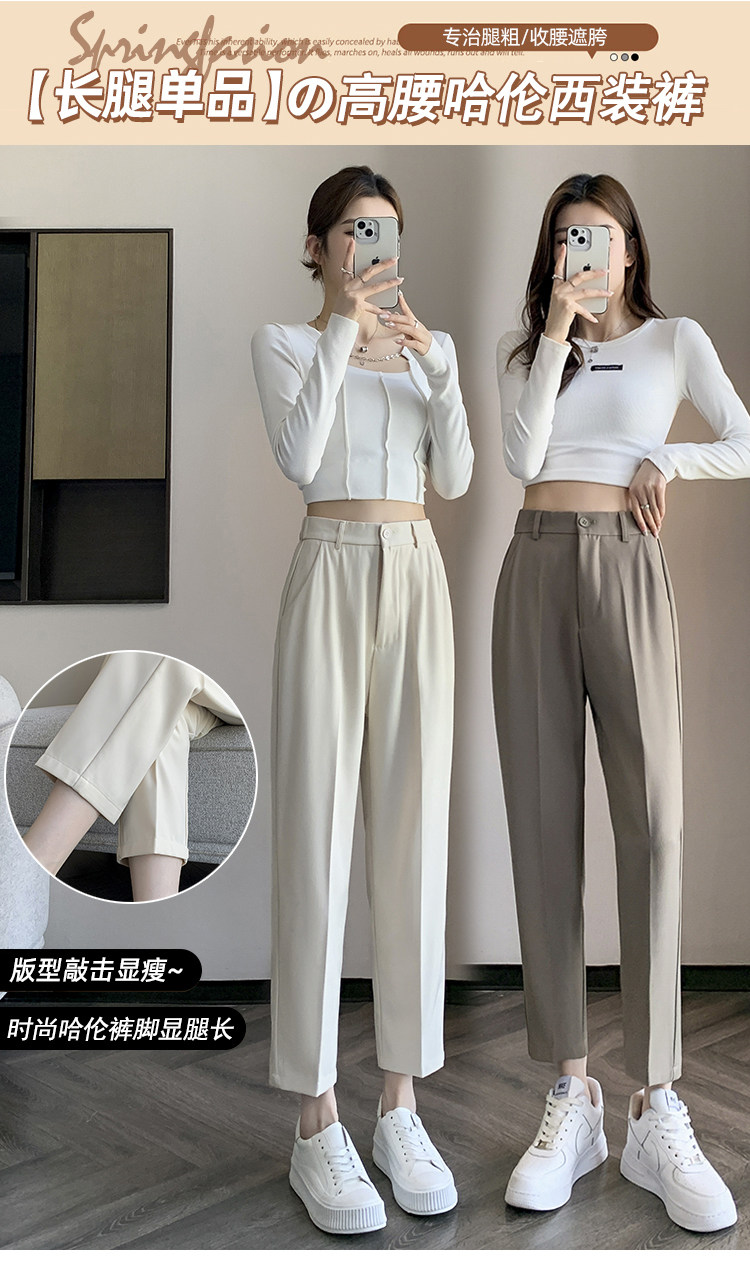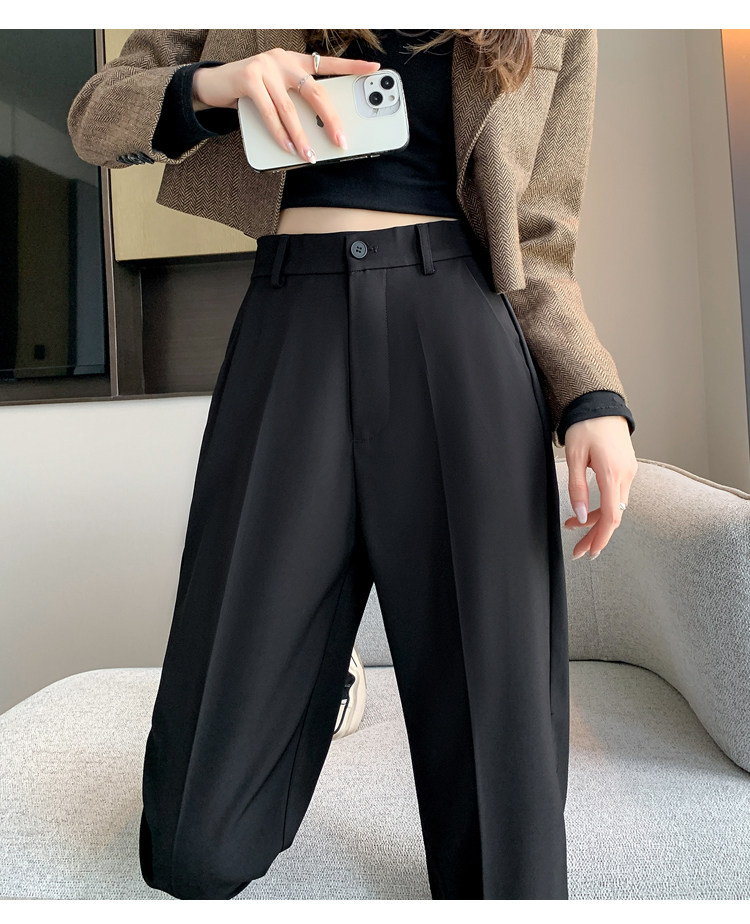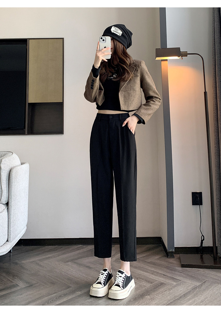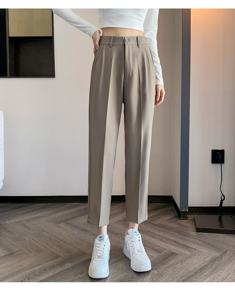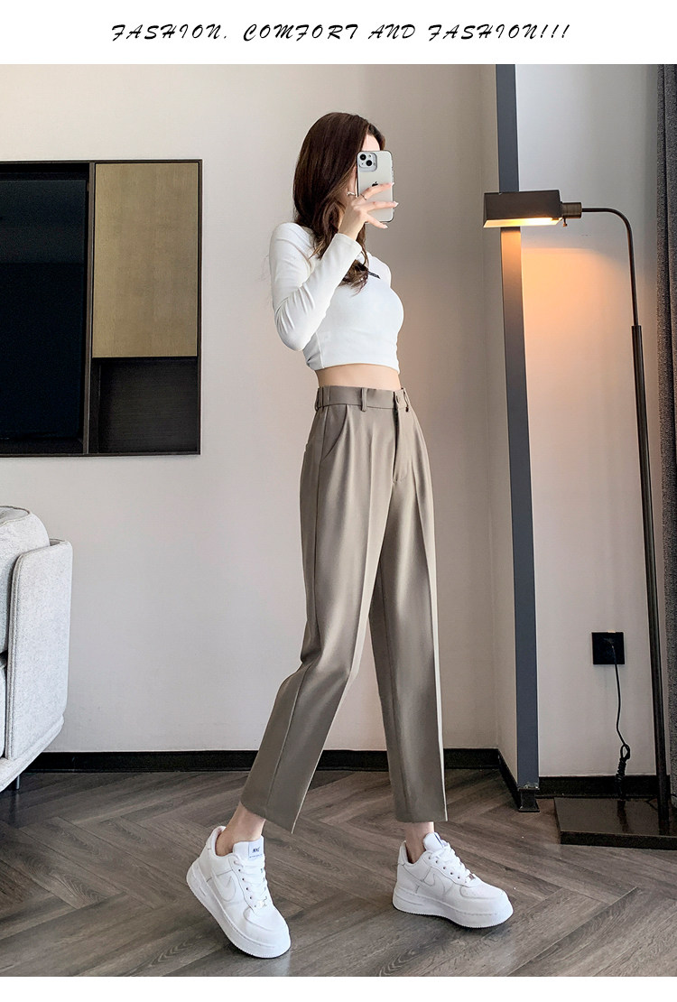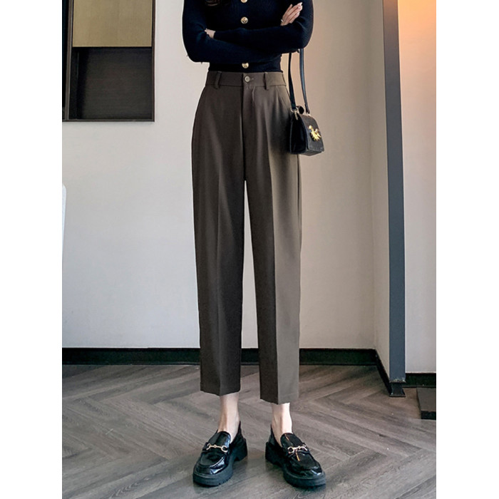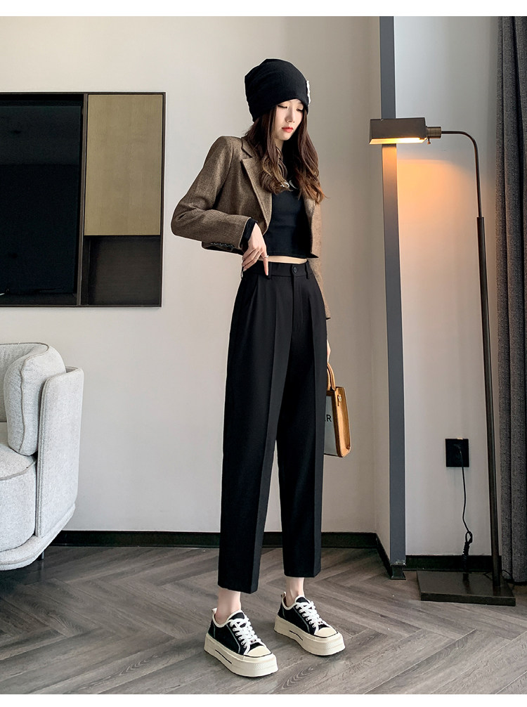 松緊腰咖色西裝褲女春秋季高腰寬鬆直筒小個子八分九分哈倫菸琯褲