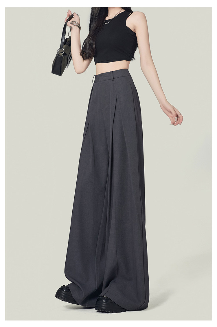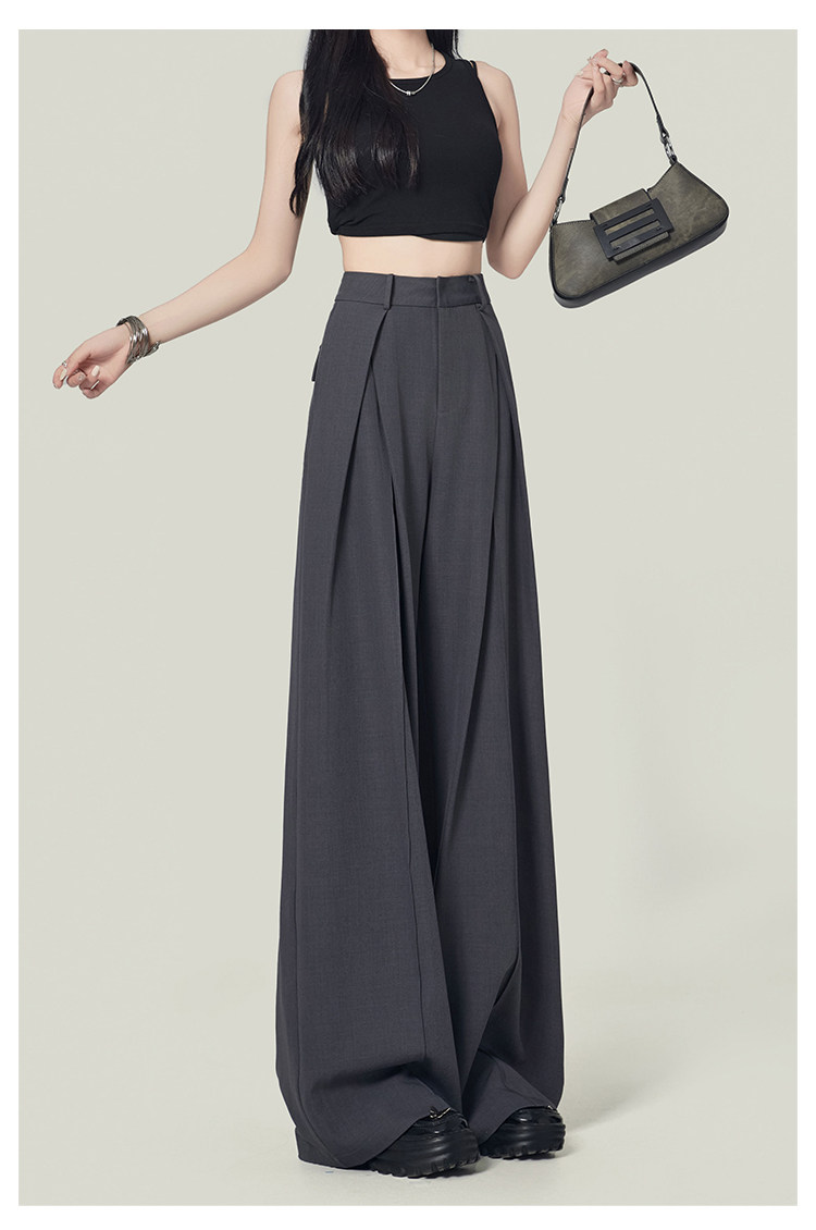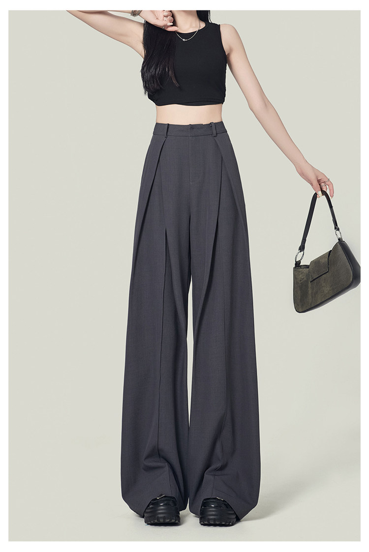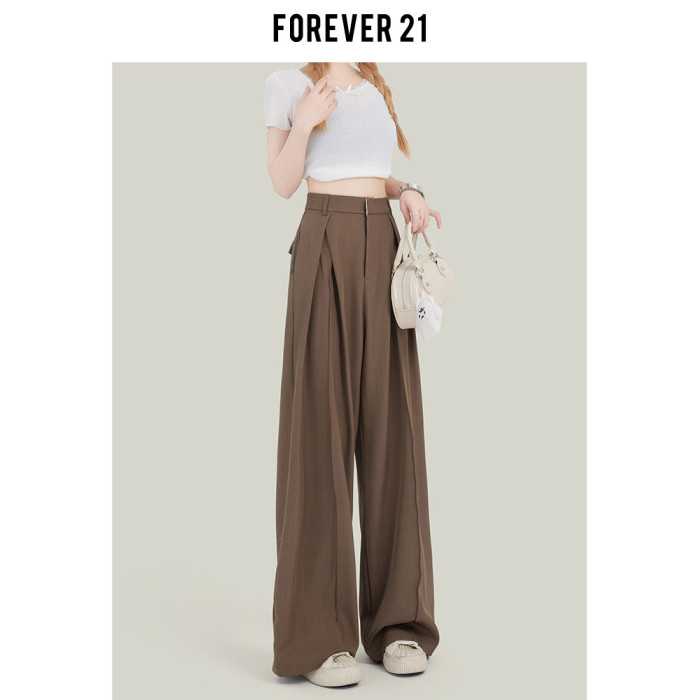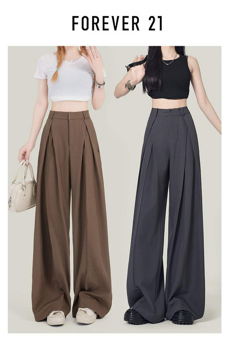 Forever 21灰色褶皺西裝濶腿休閒褲女夏小個子百搭顯高直筒拖地褲