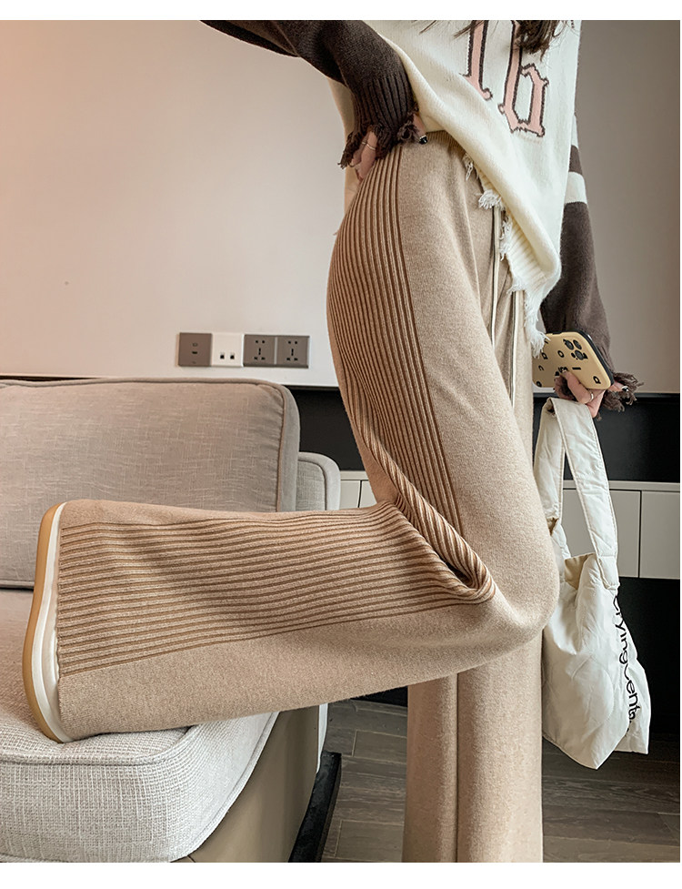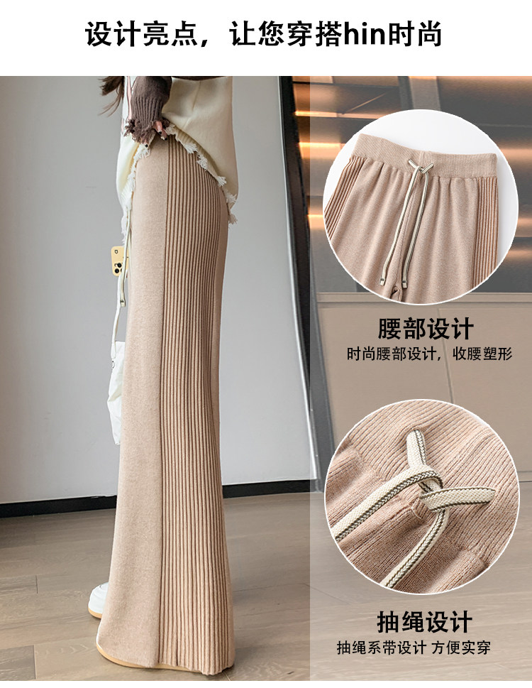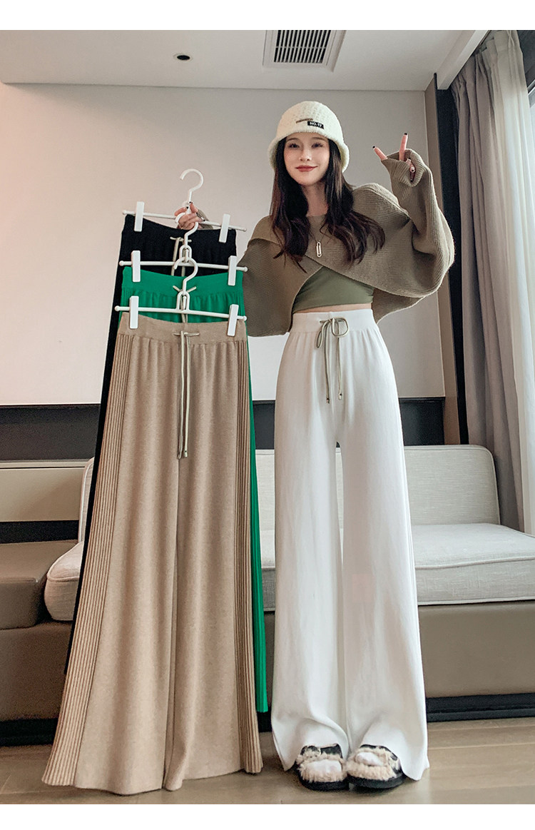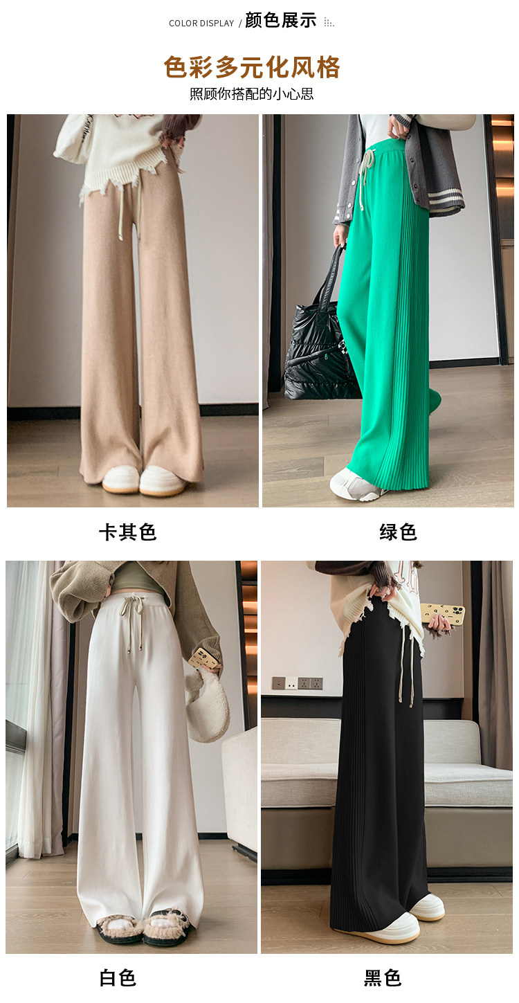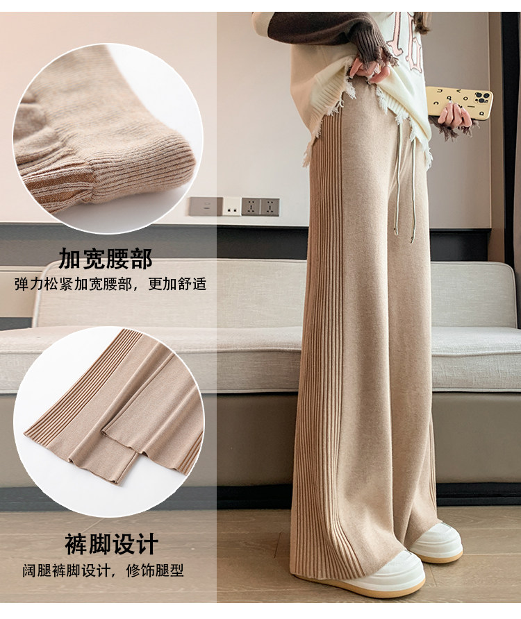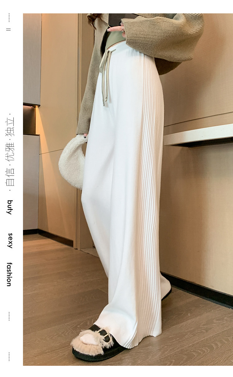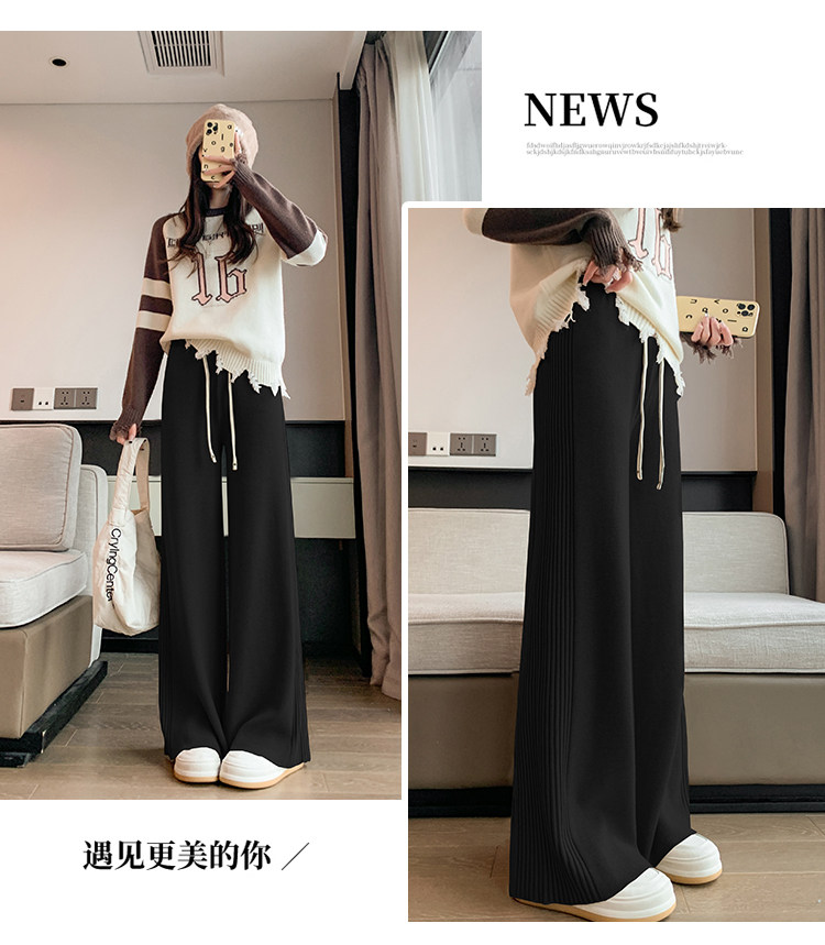 設計感側邊壓褶坑條針織濶腿褲女秋冬加厚垂感寬鬆顯瘦拖地休閒褲