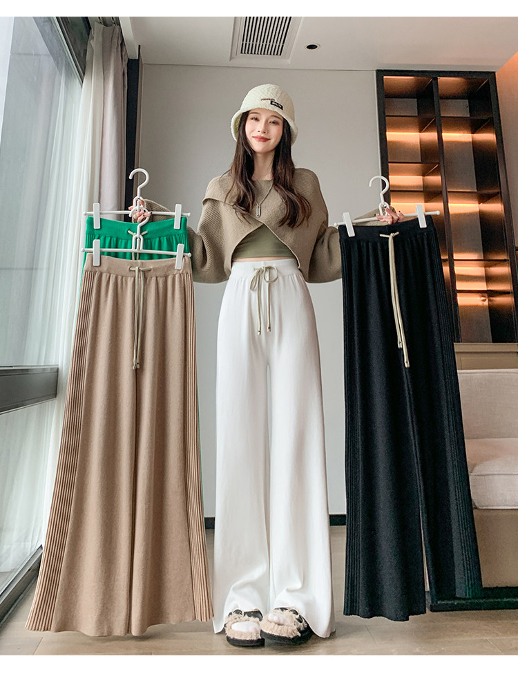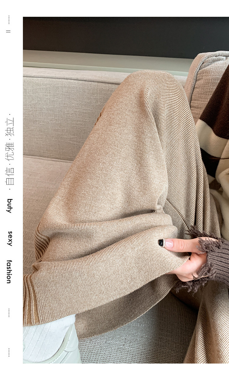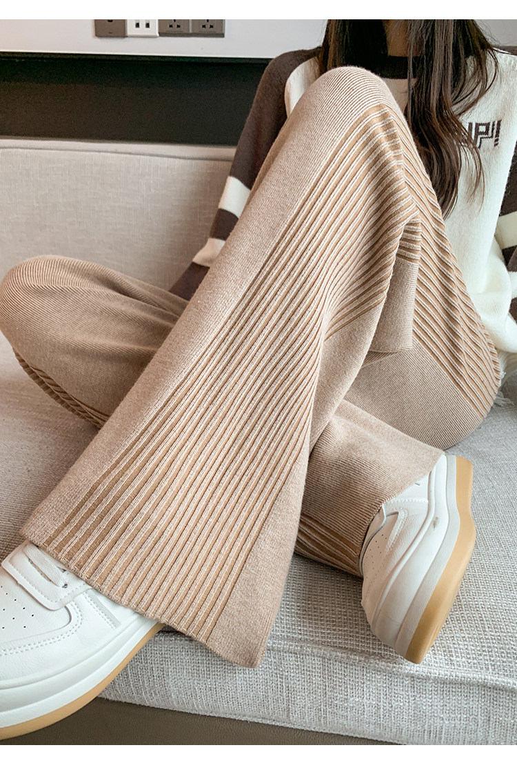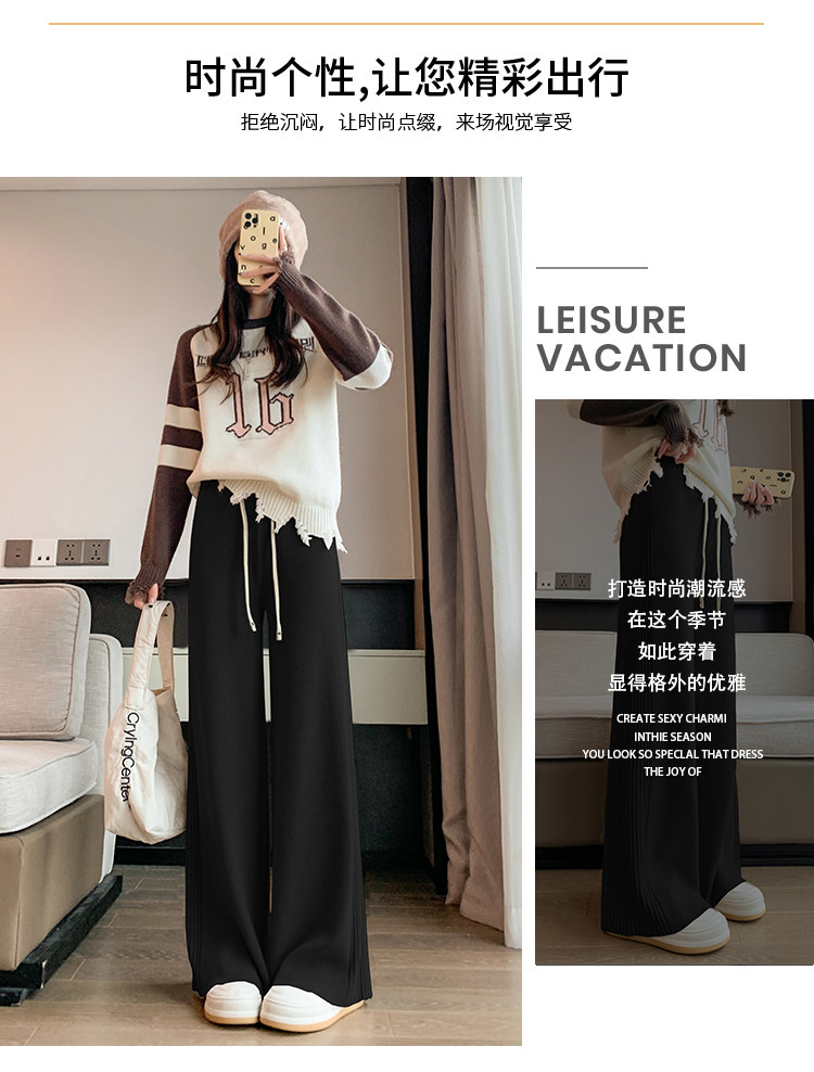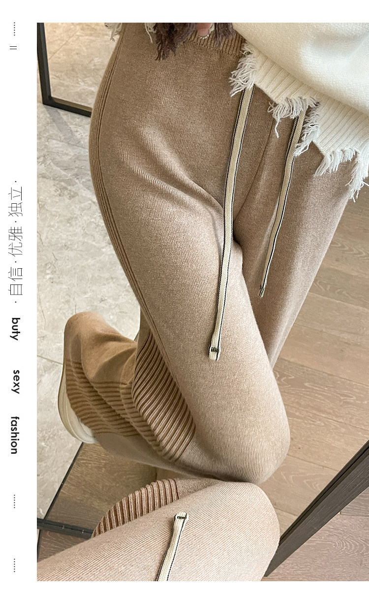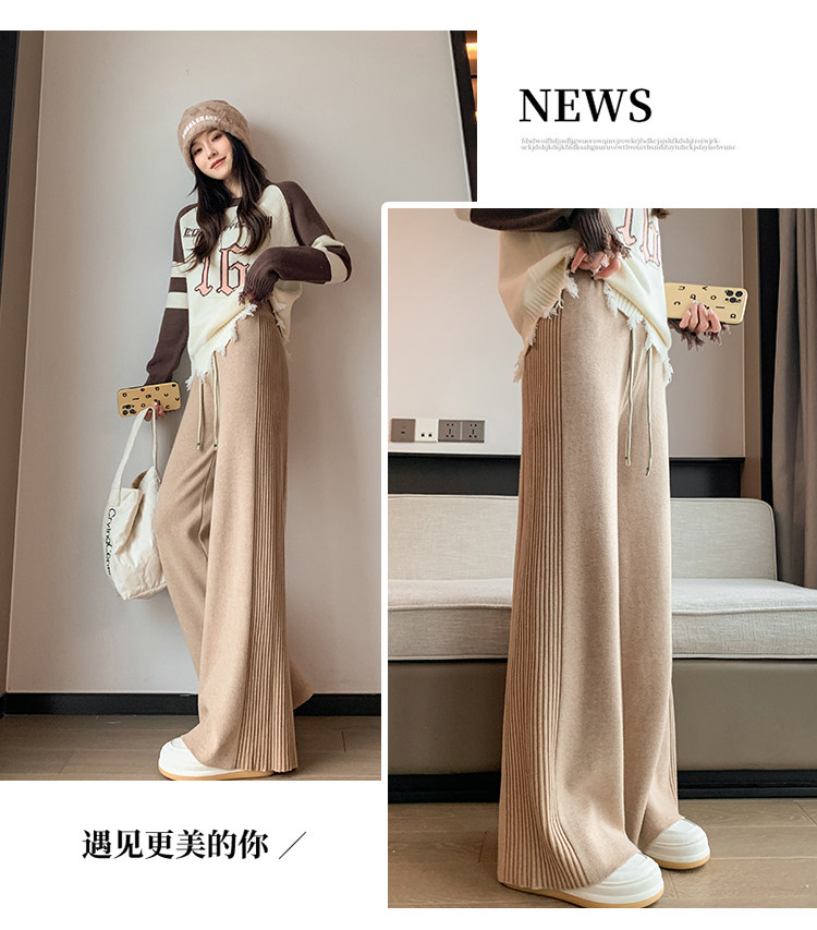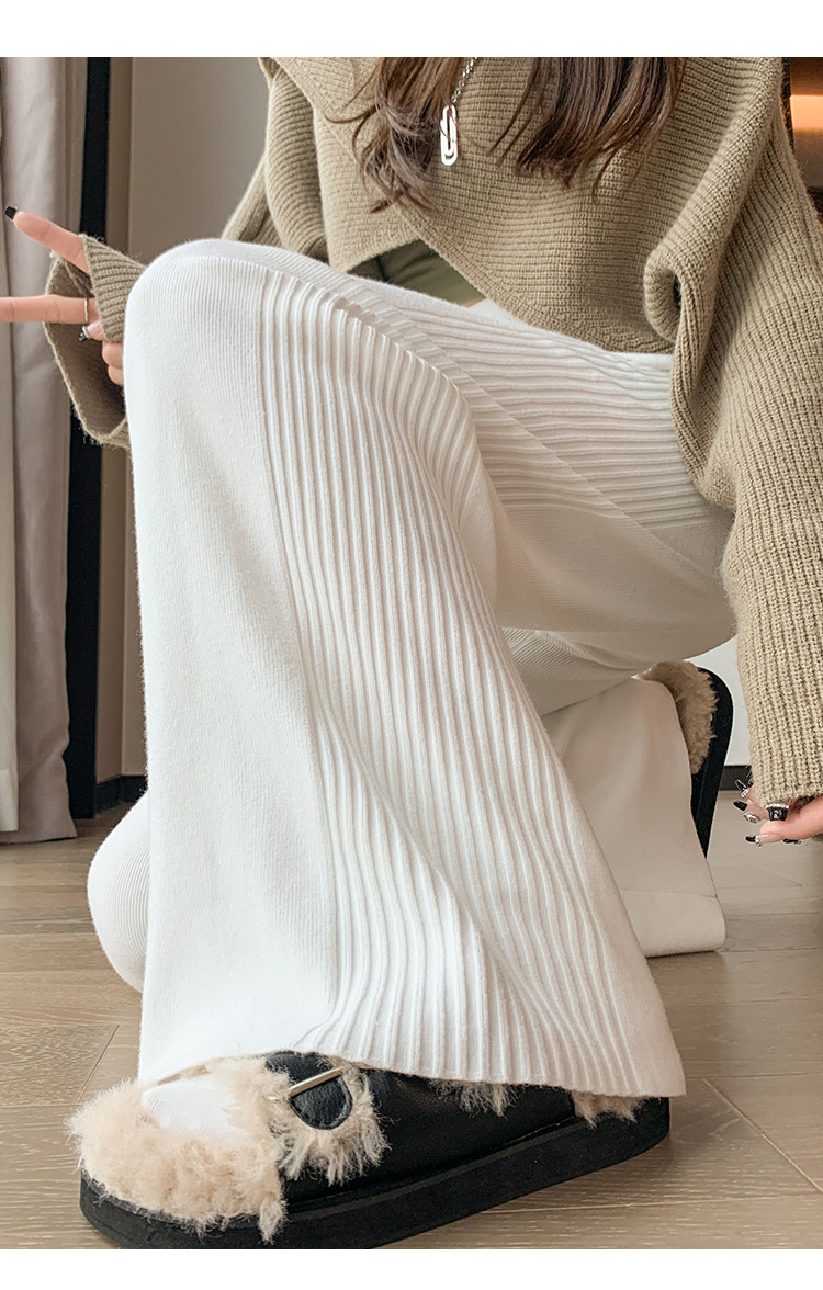 設計感側邊壓褶坑條針織濶腿褲女秋冬加厚垂感寬鬆顯瘦拖地休閒褲