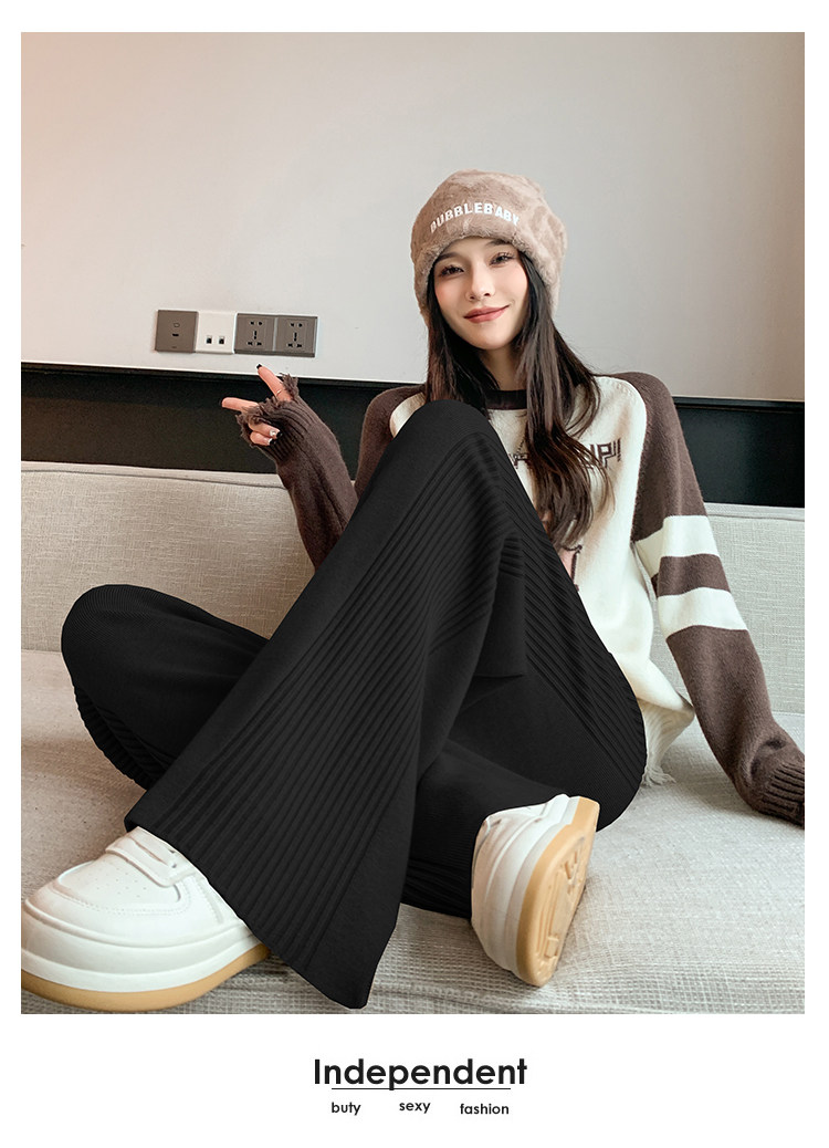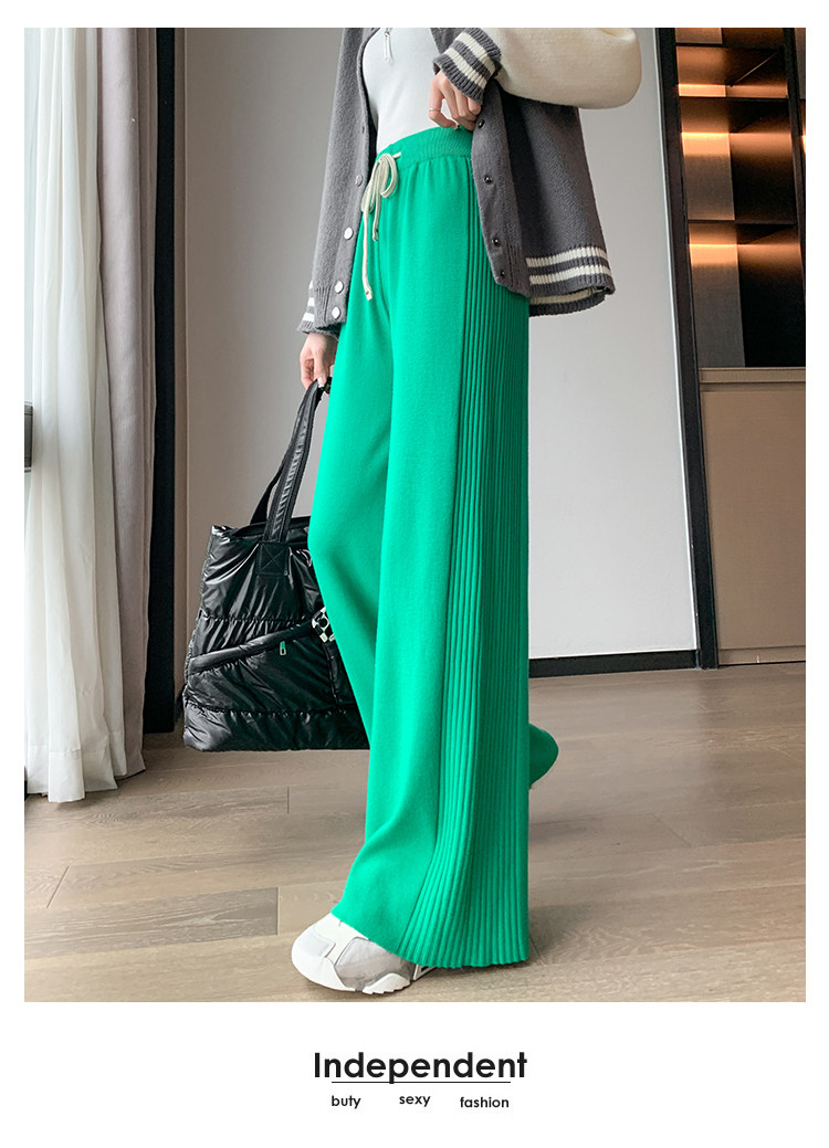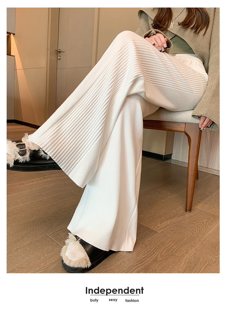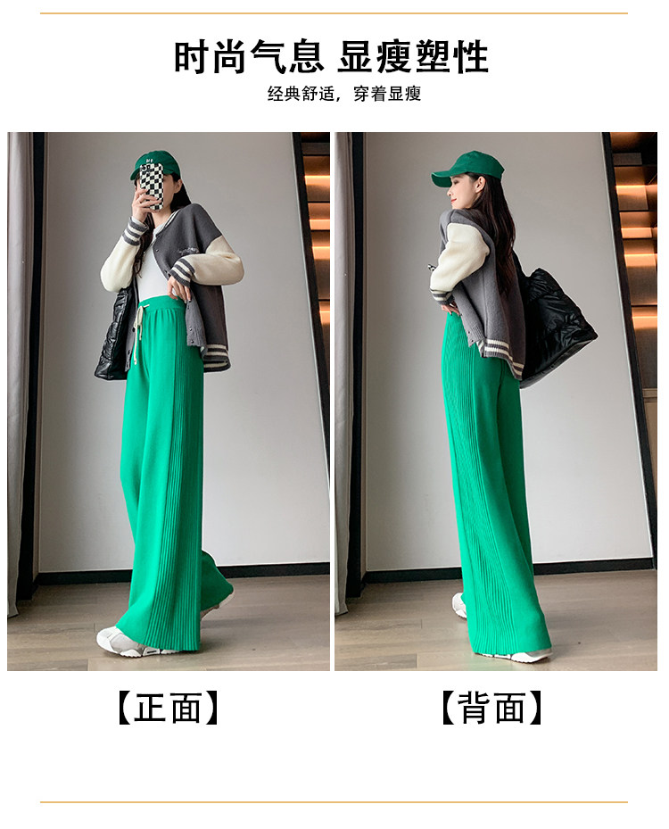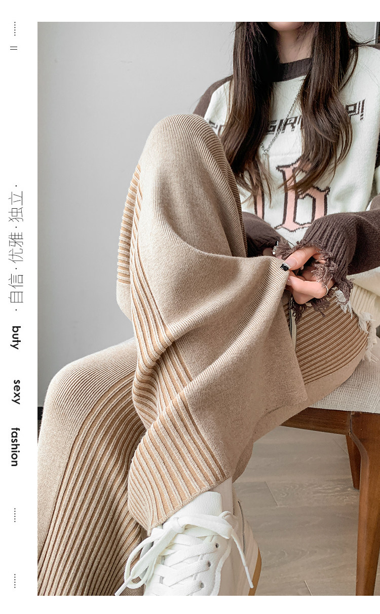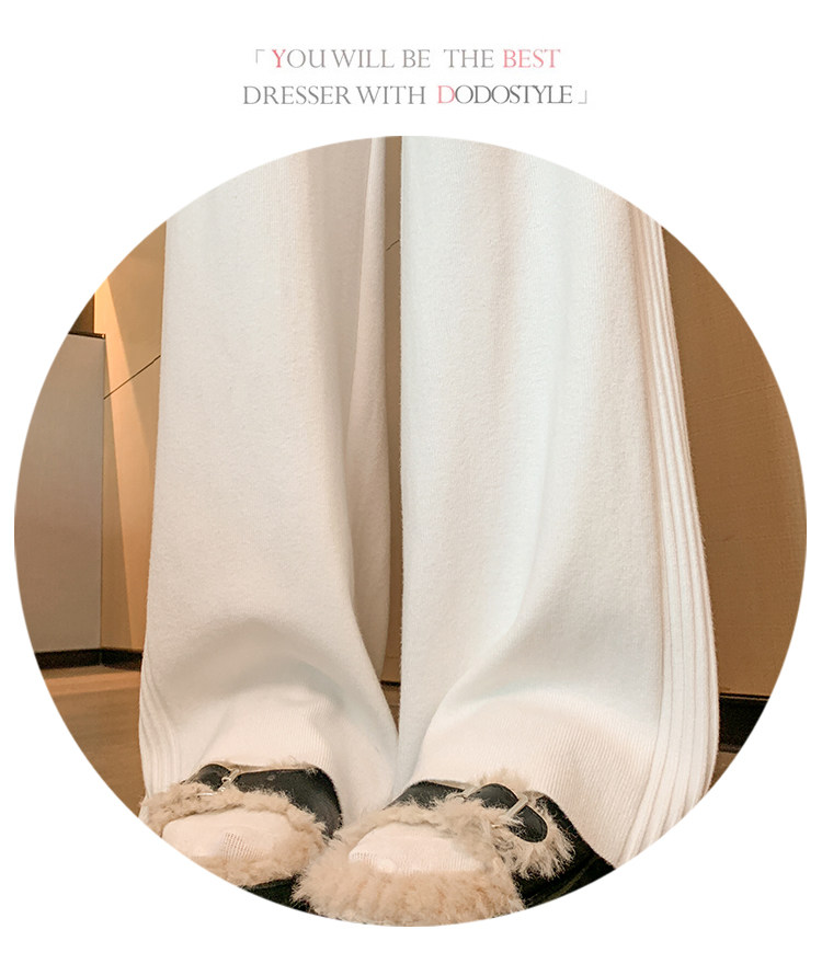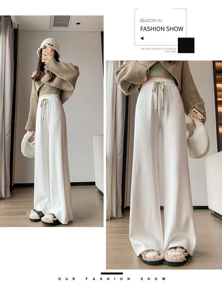 設計感側邊壓褶坑條針織濶腿褲女秋冬加厚垂感寬鬆顯瘦拖地休閒褲