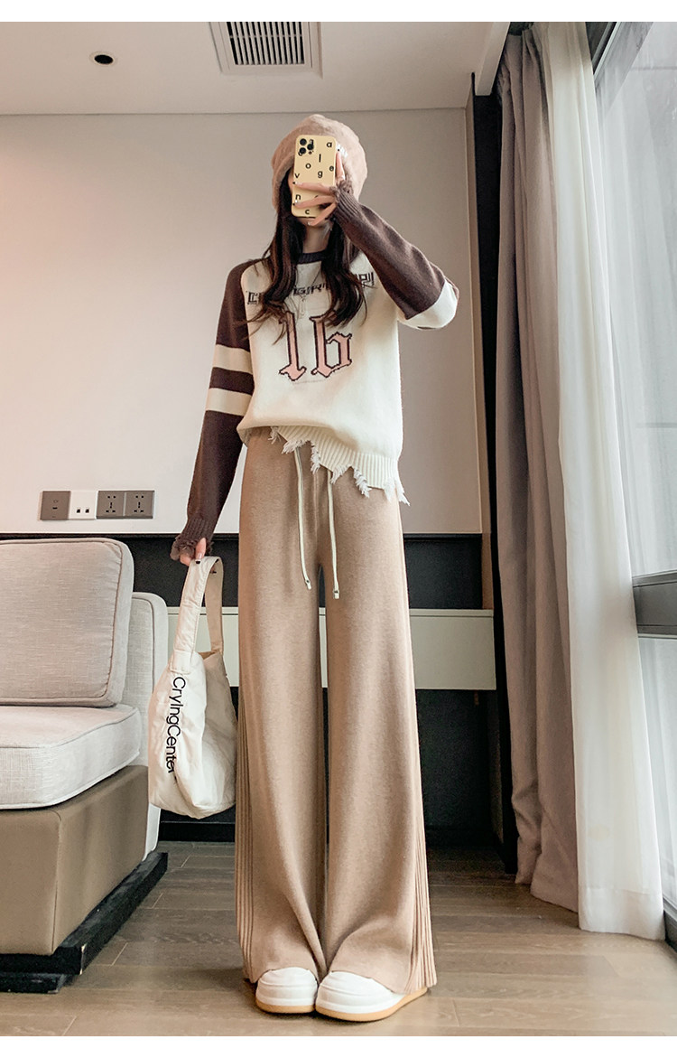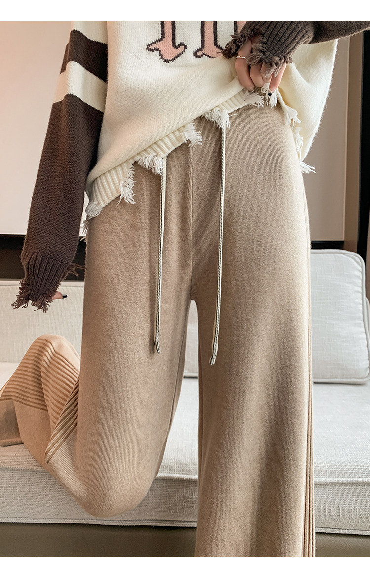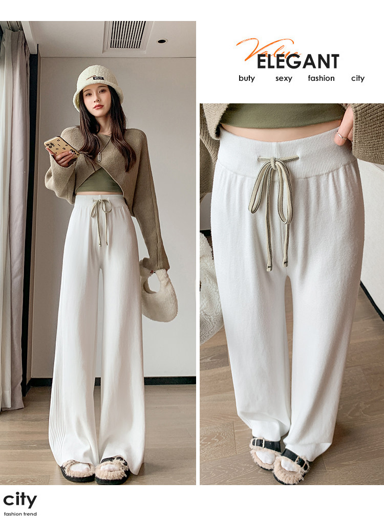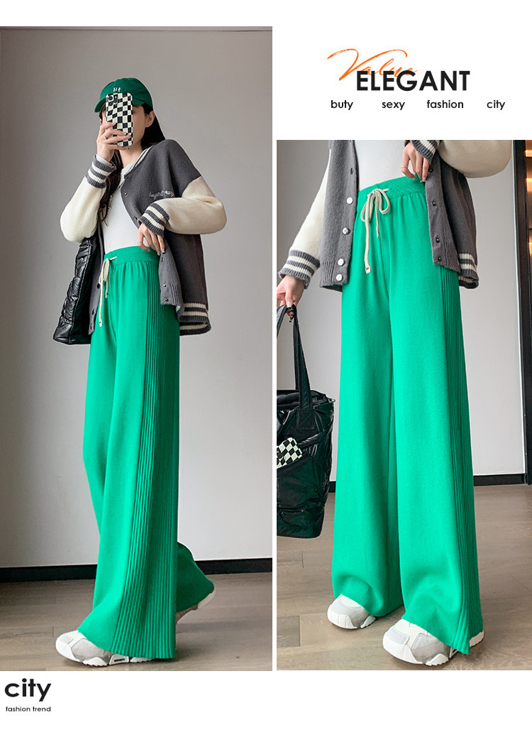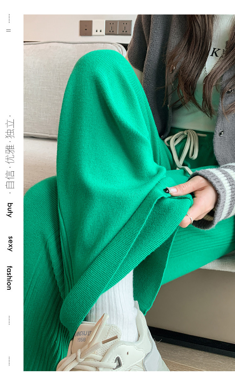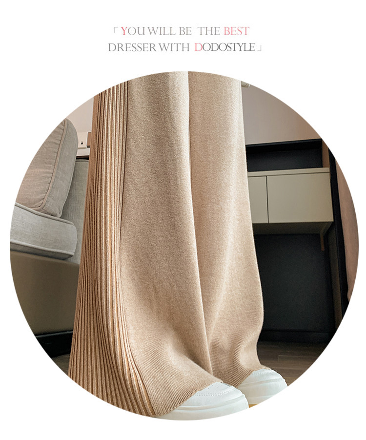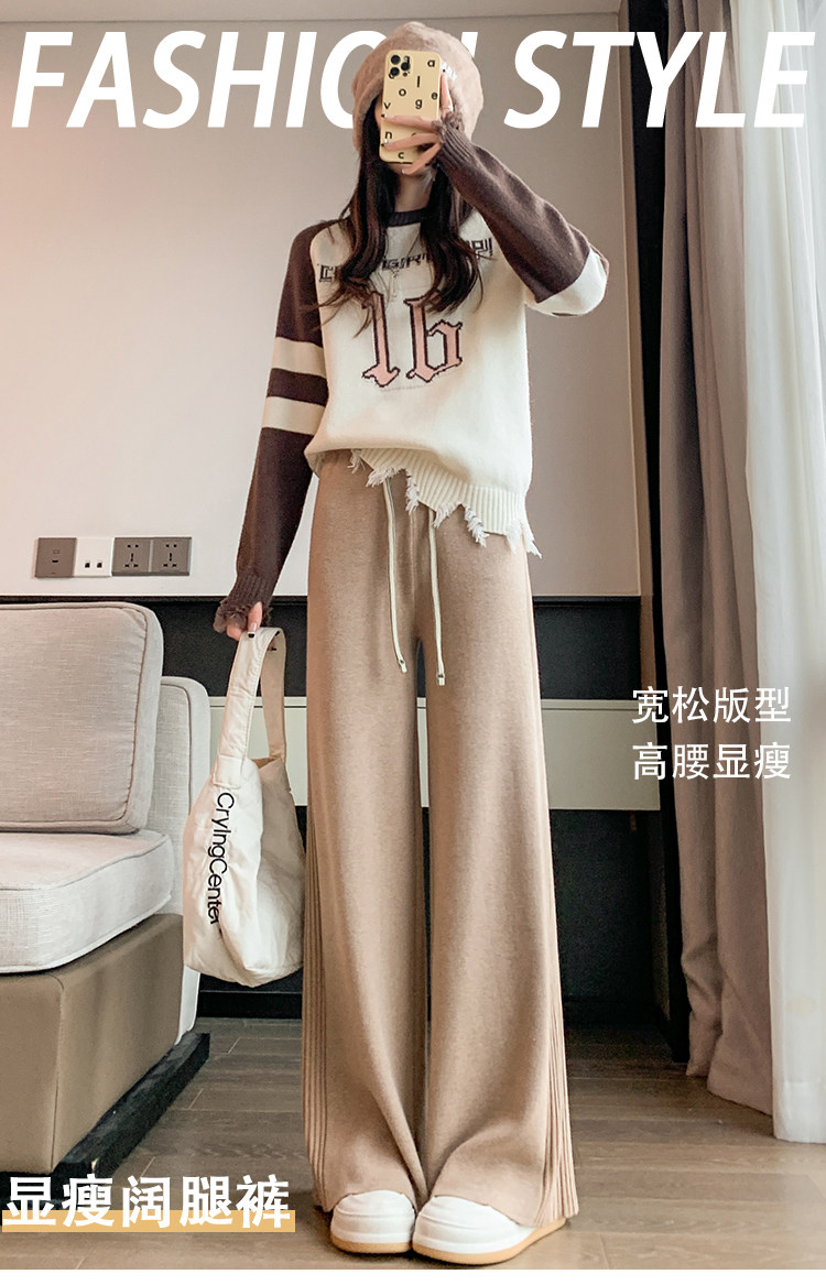 設計感側邊壓褶坑條針織濶腿褲女秋冬加厚垂感寬鬆顯瘦拖地休閒褲