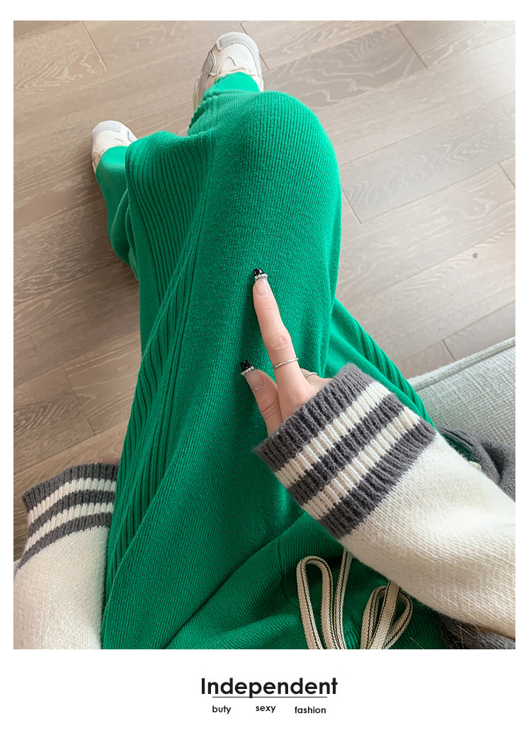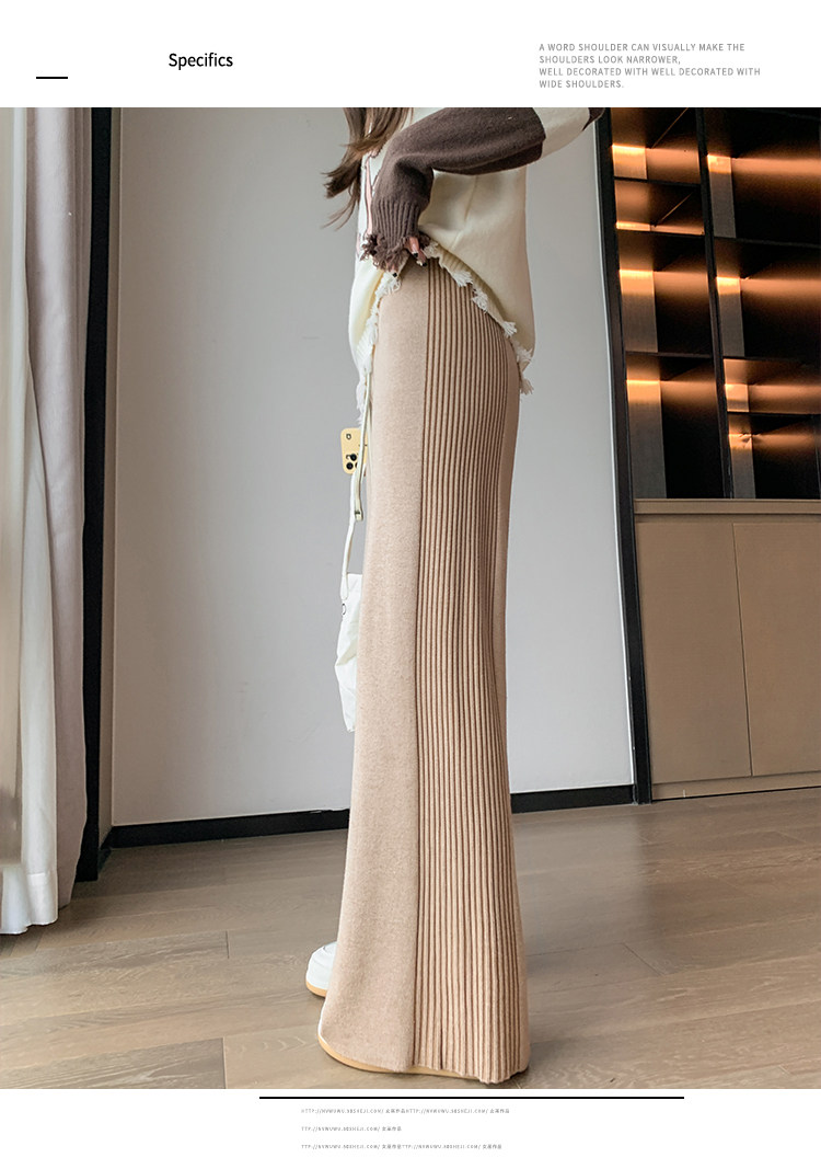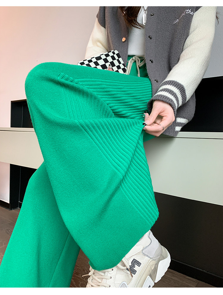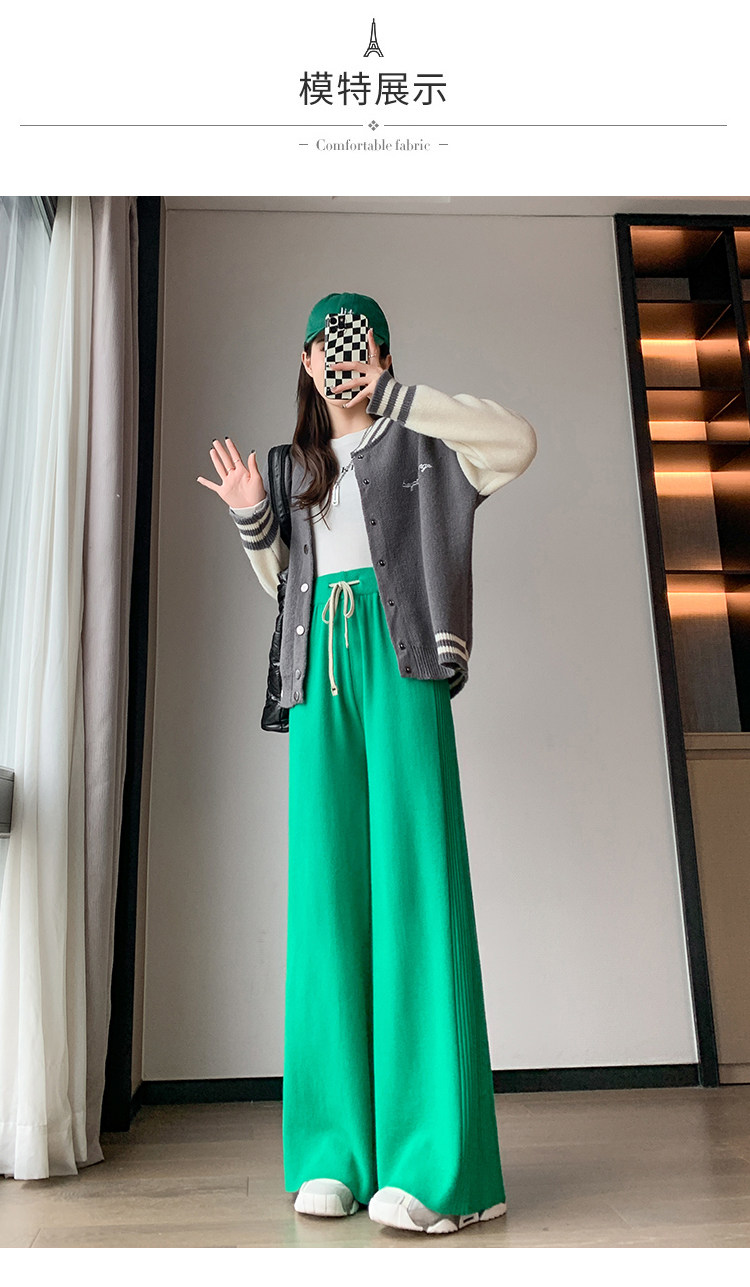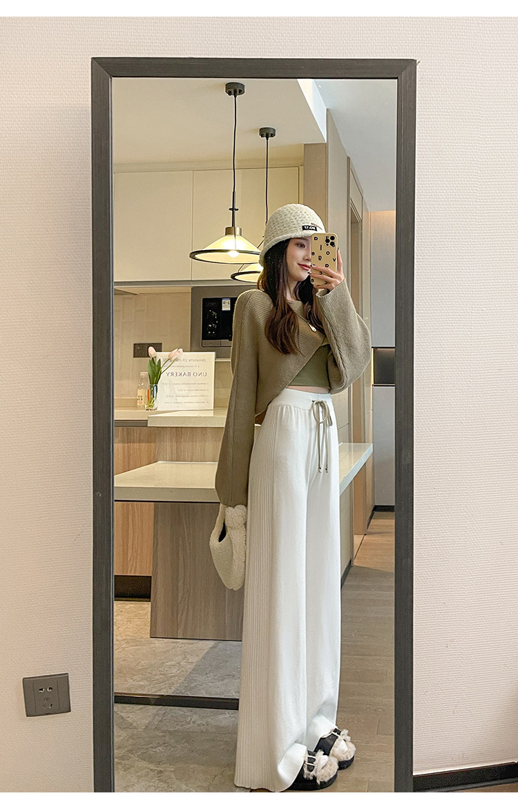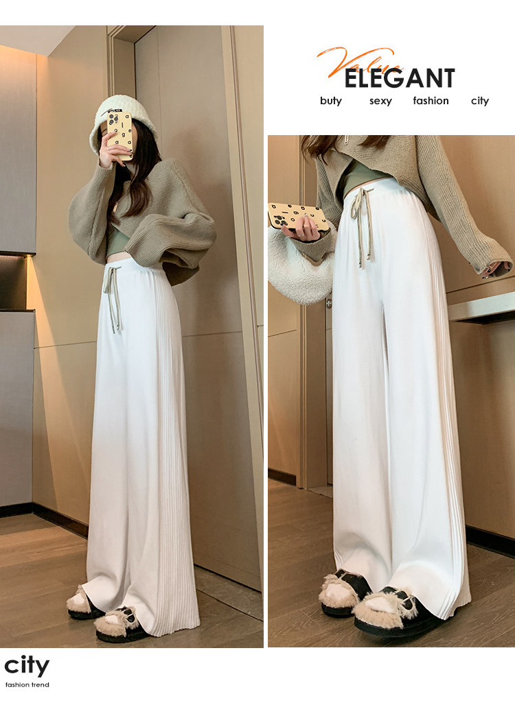設計感側邊壓褶坑條針織濶腿褲女秋冬加厚垂感寬鬆顯瘦拖地休閒褲