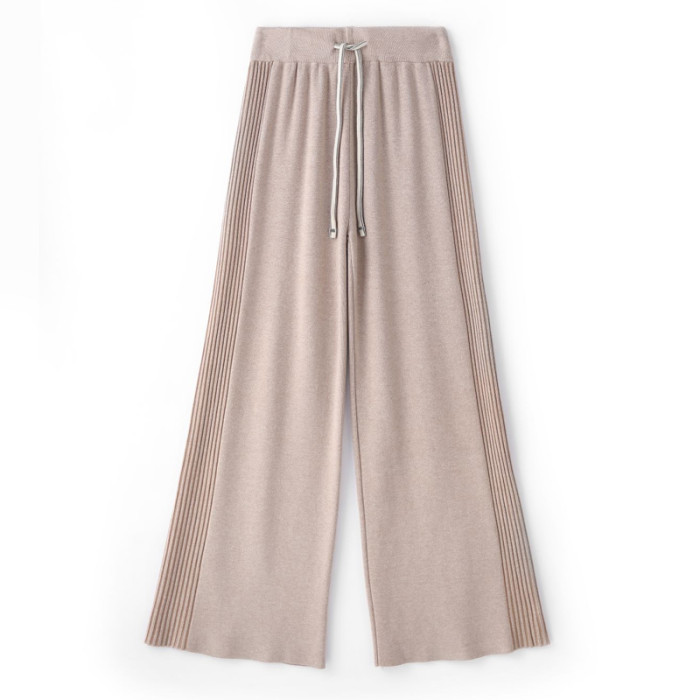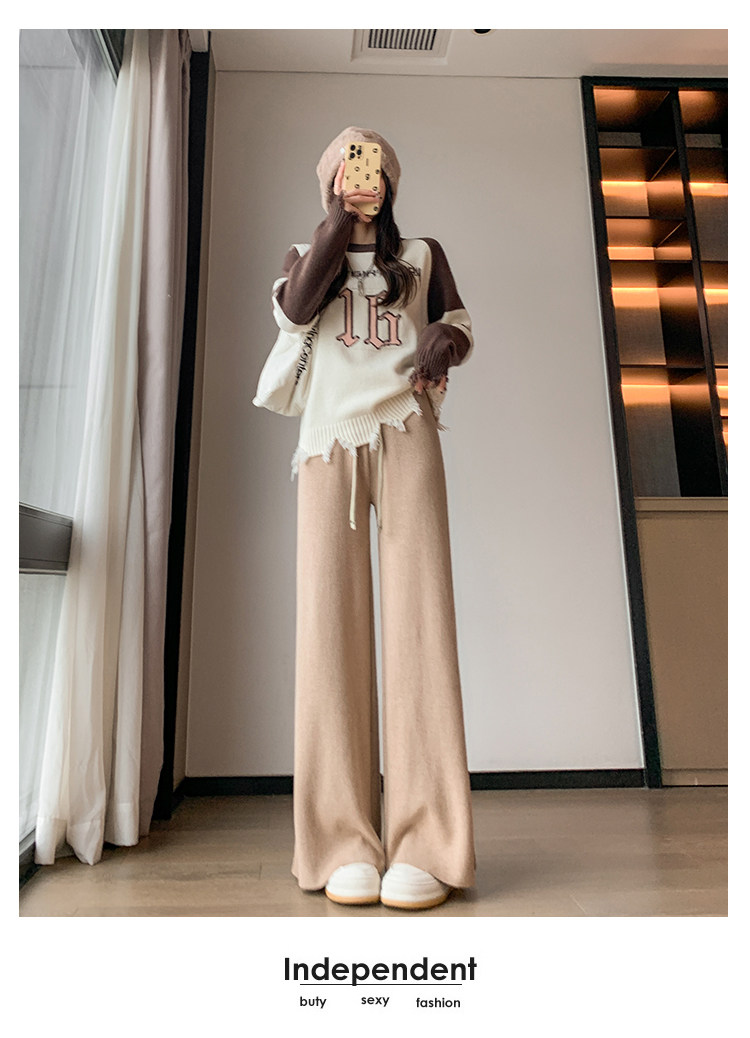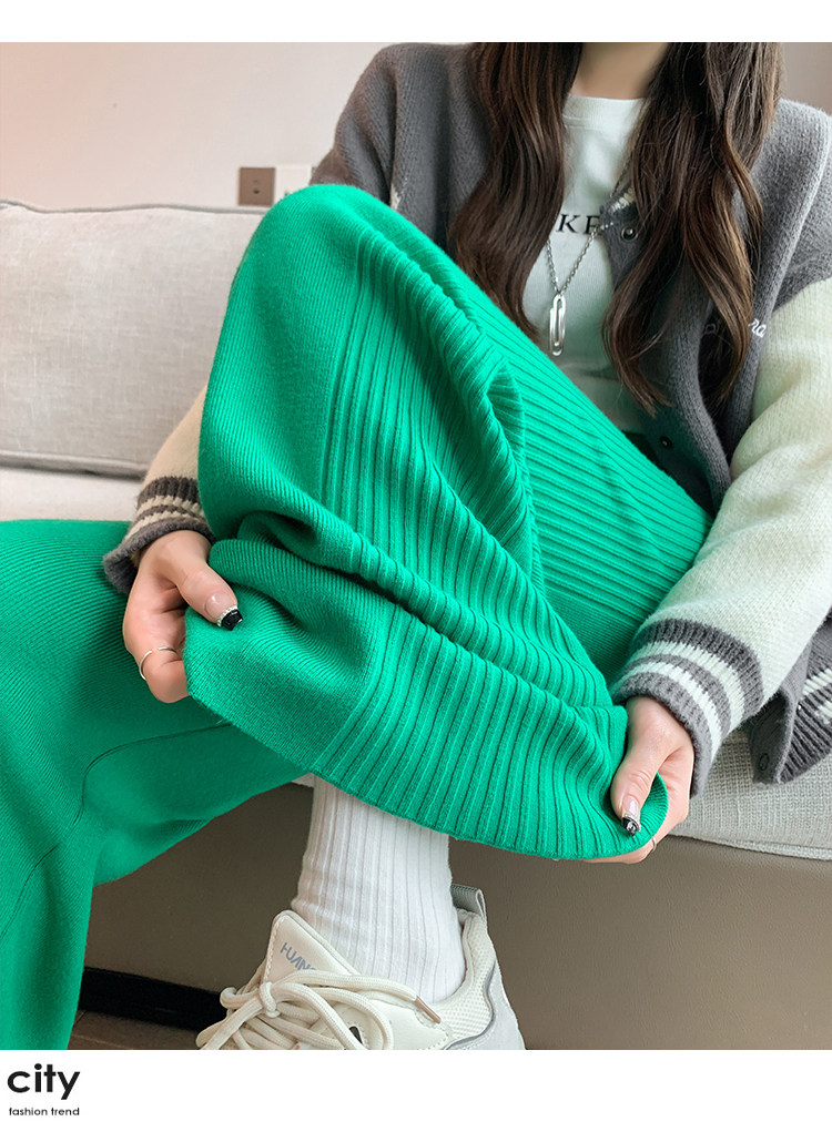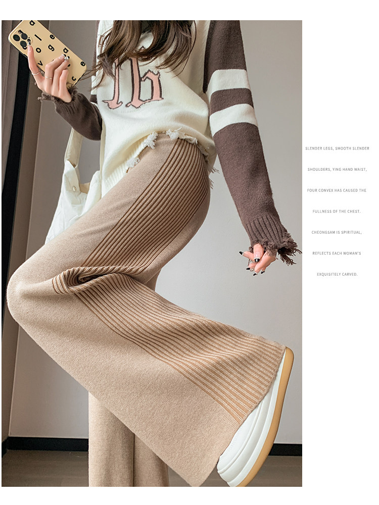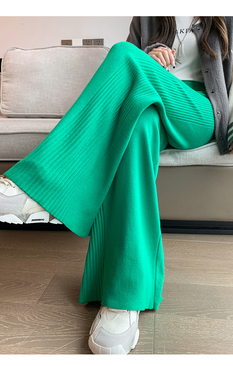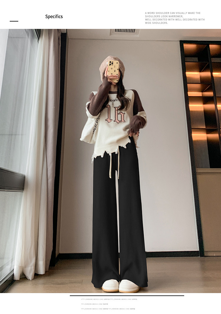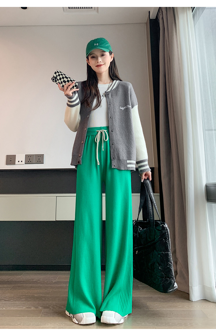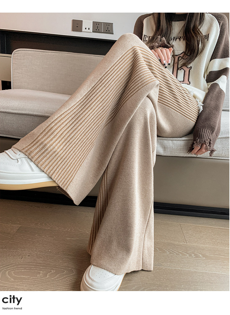 設計感側邊壓褶坑條針織濶腿褲女秋冬加厚垂感寬鬆顯瘦拖地休閒褲