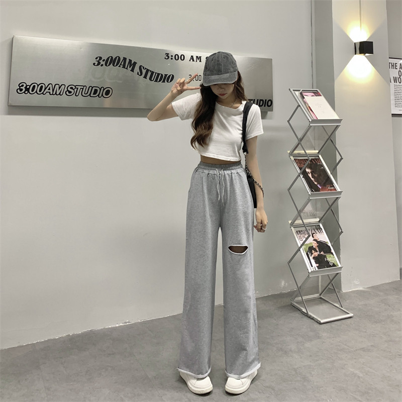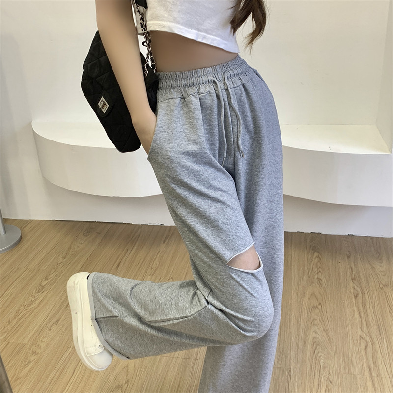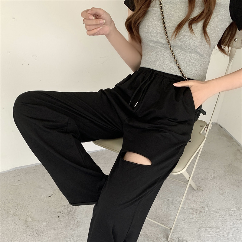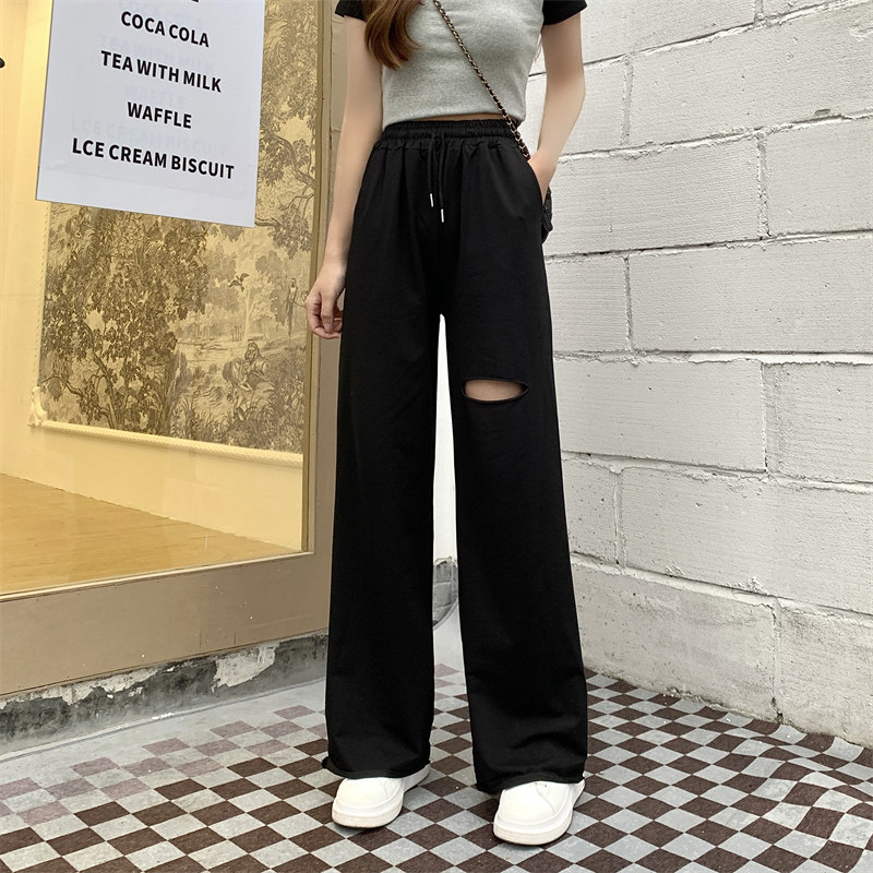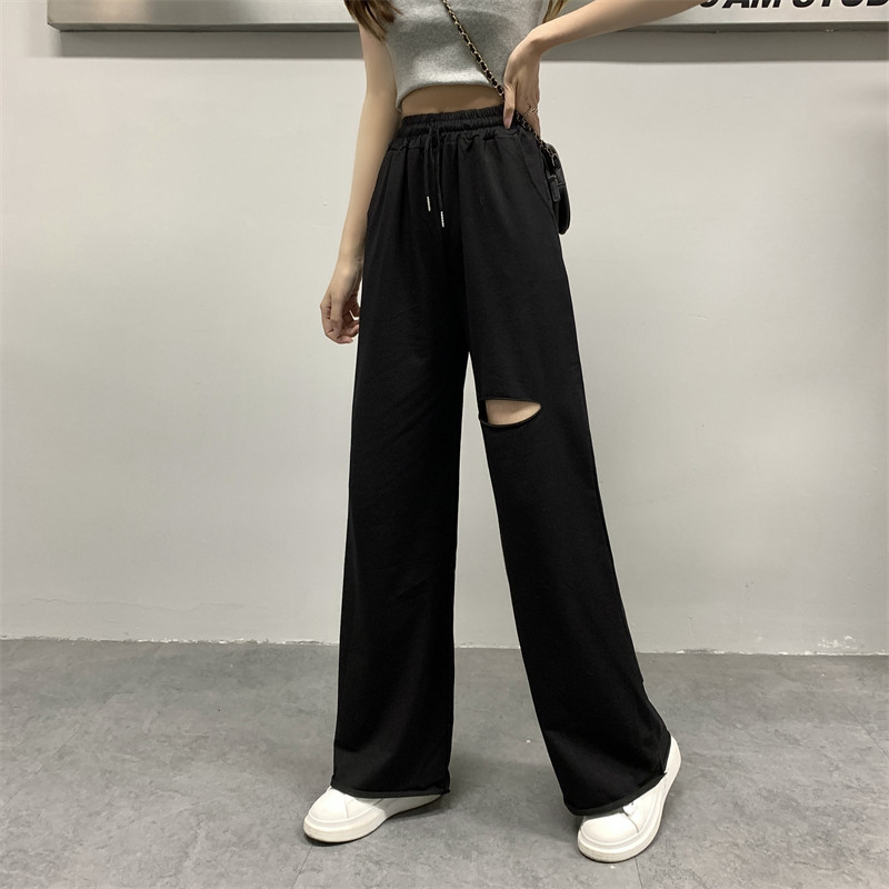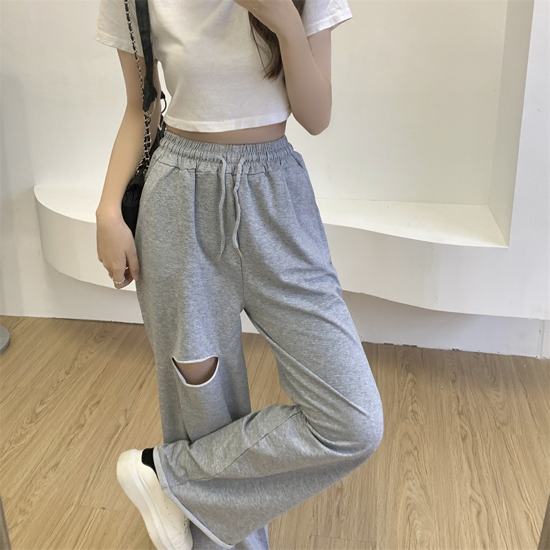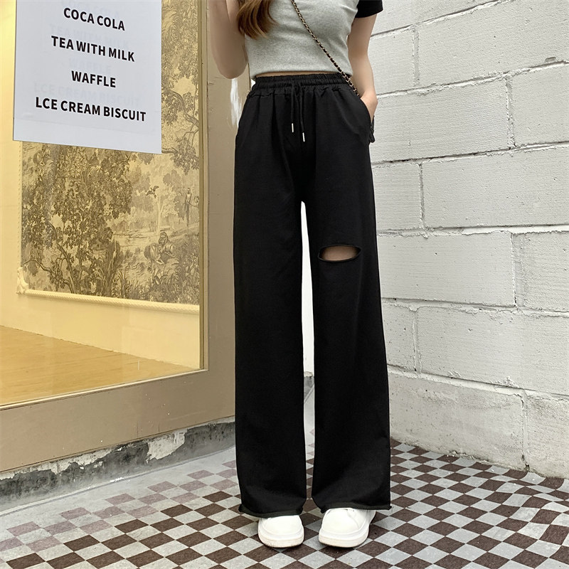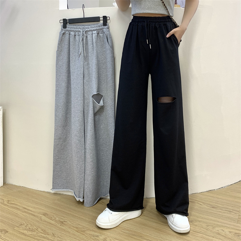破洞濶腿褲子女夏季新款寬鬆大碼顯瘦休閒松緊運動衛褲200斤胖mm