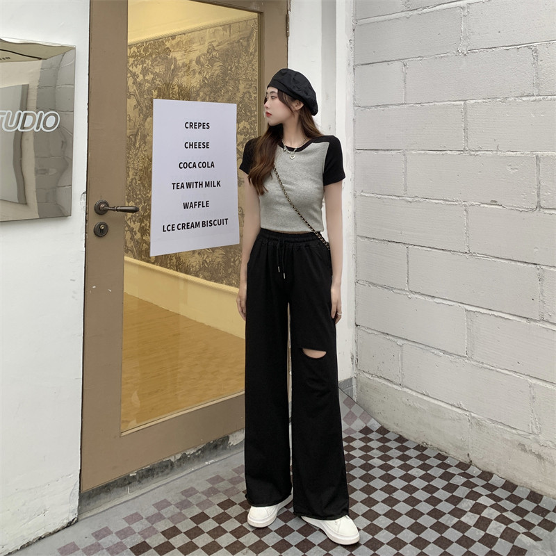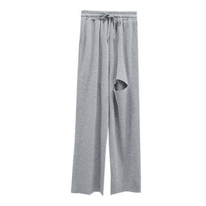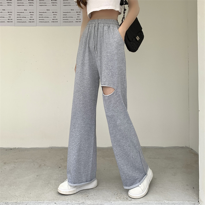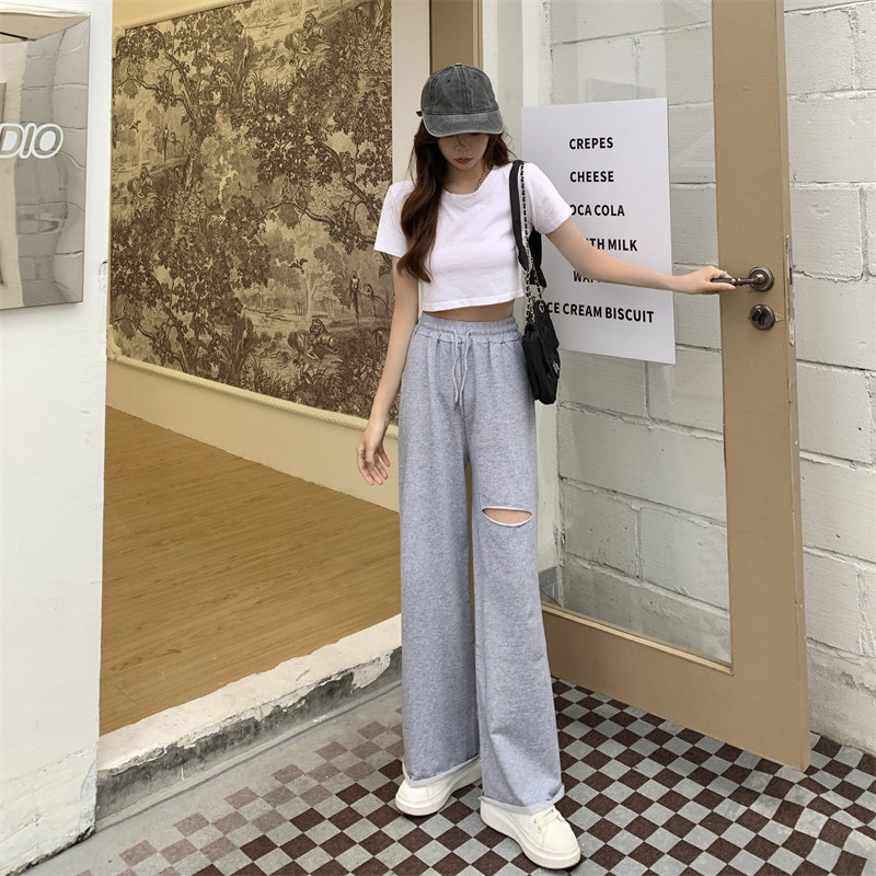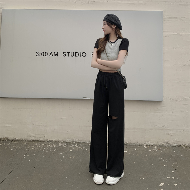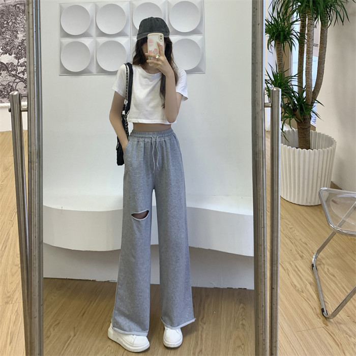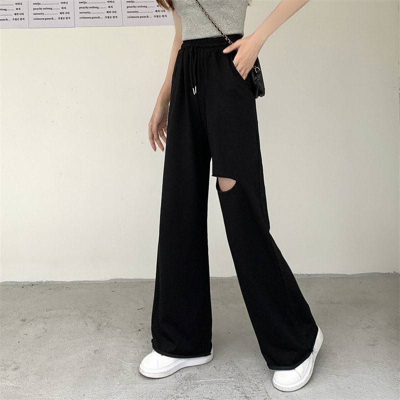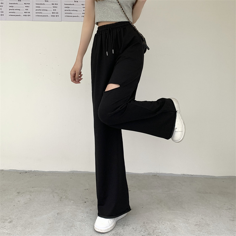 破洞濶腿褲子女夏季新款寬鬆大碼顯瘦休閒松緊運動衛褲200斤胖mm