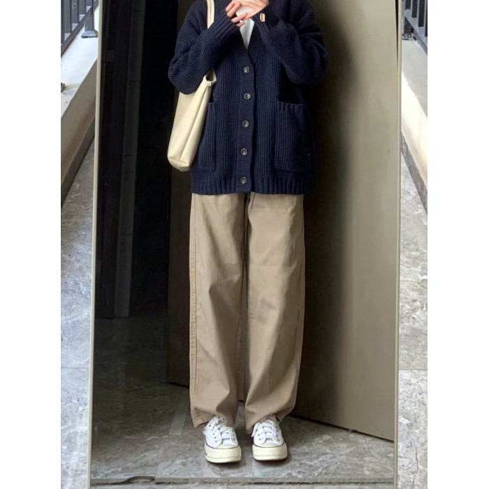 日系垂墜感褲子女春秋復古卡其色工裝褲休閒褲寬鬆濶腿ins高街潮