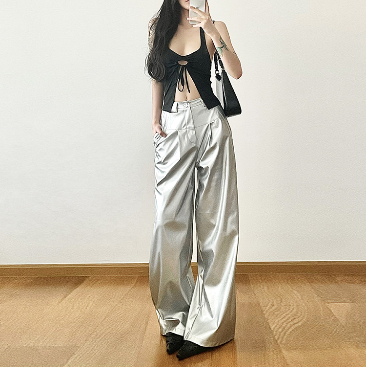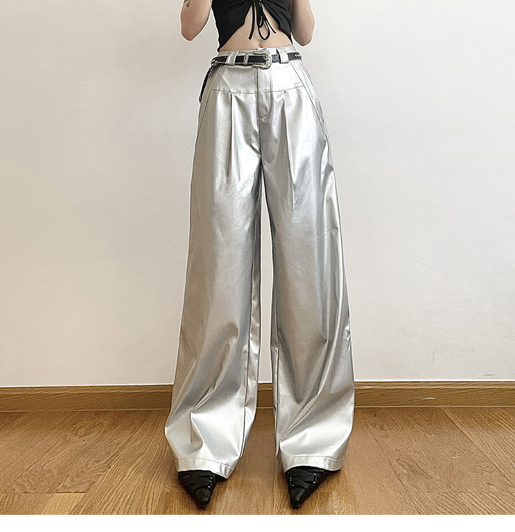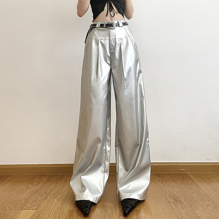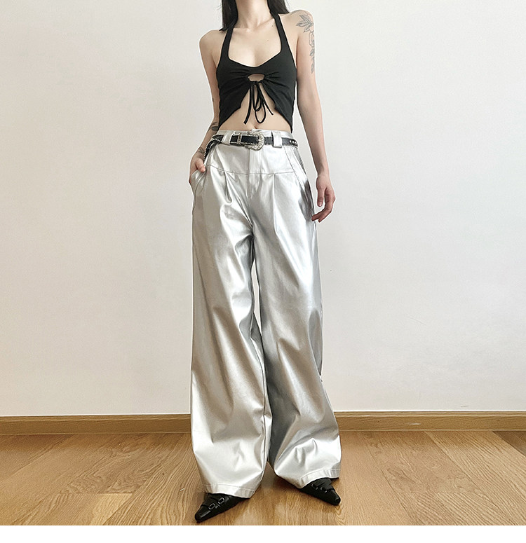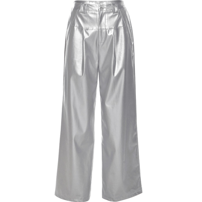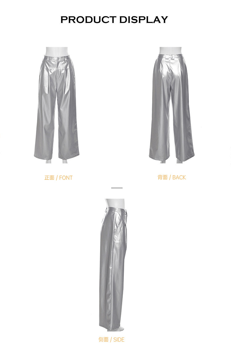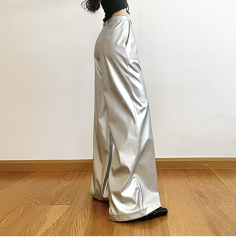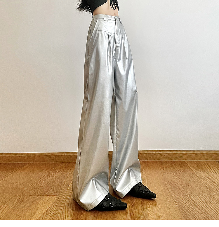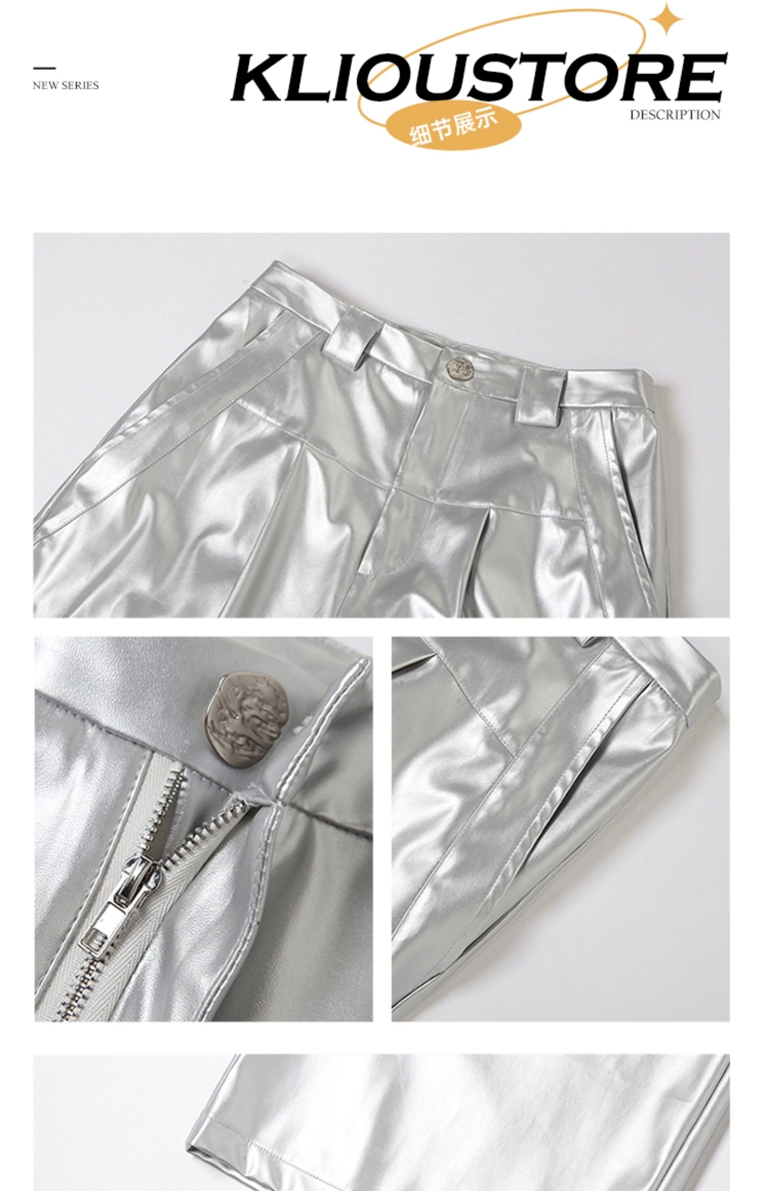 KLIOU 酷颯拽姐炸街個性銀色高腰休閒褲女寬鬆顯瘦濶腿拖地長褲潮