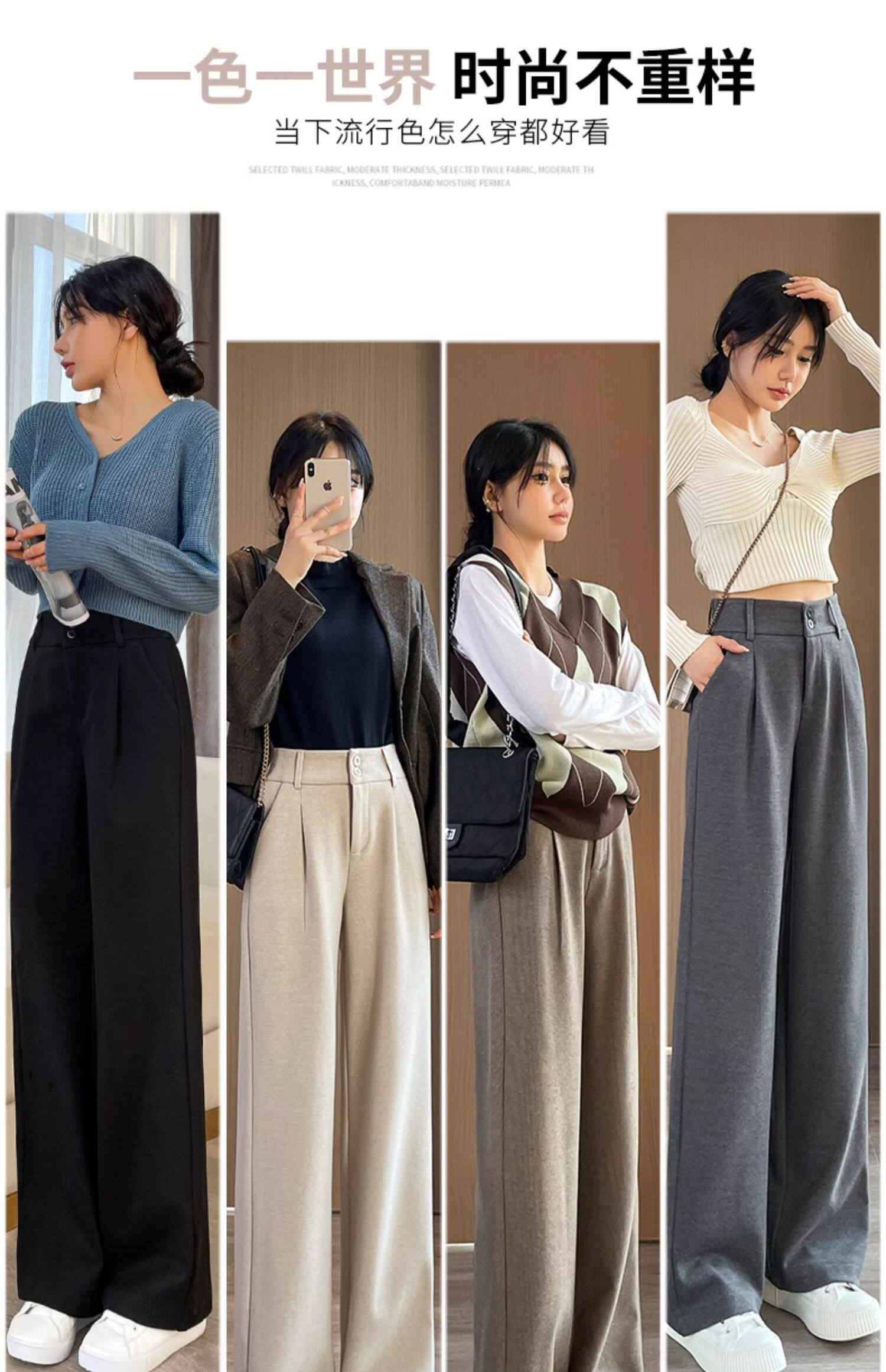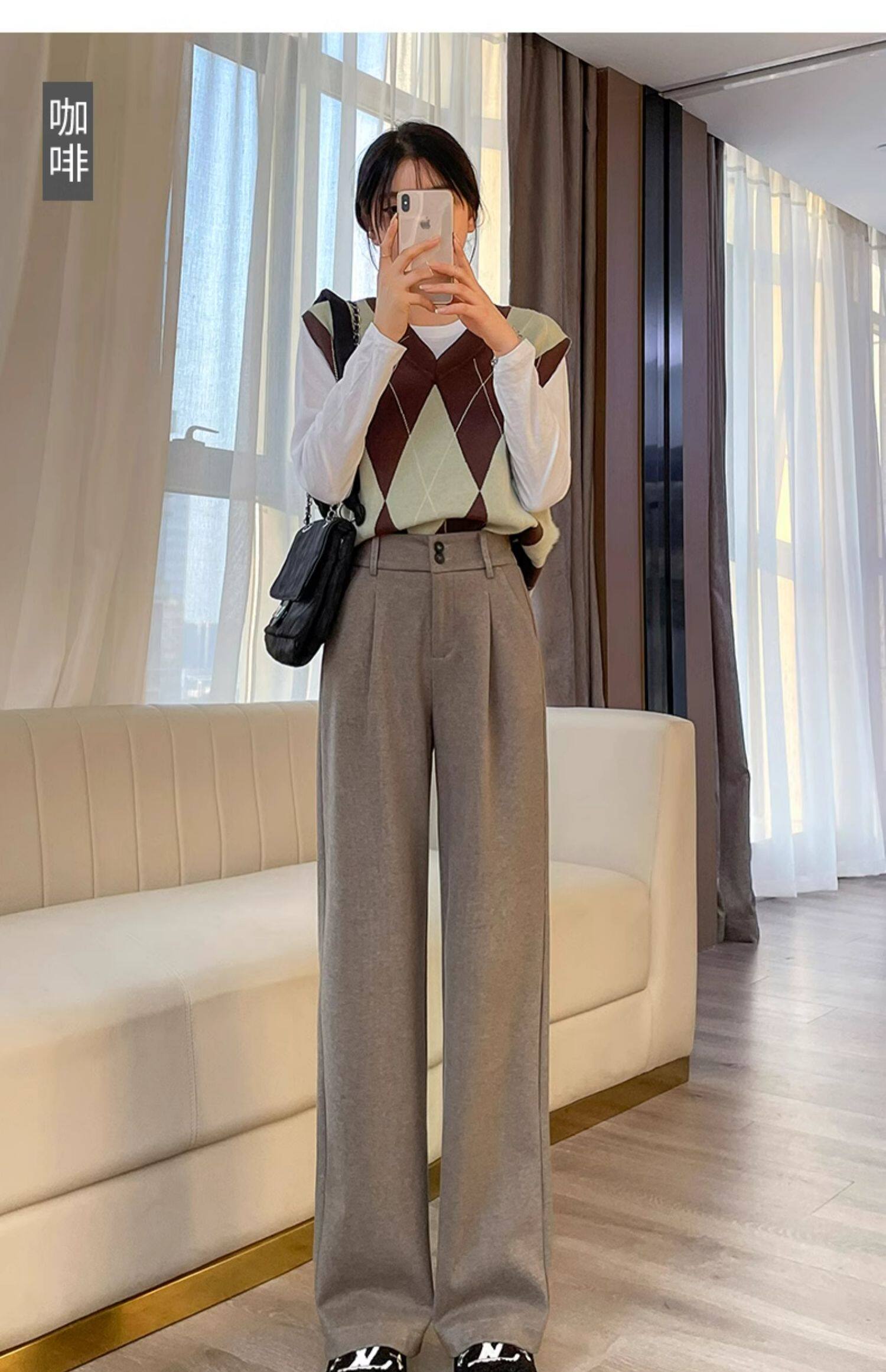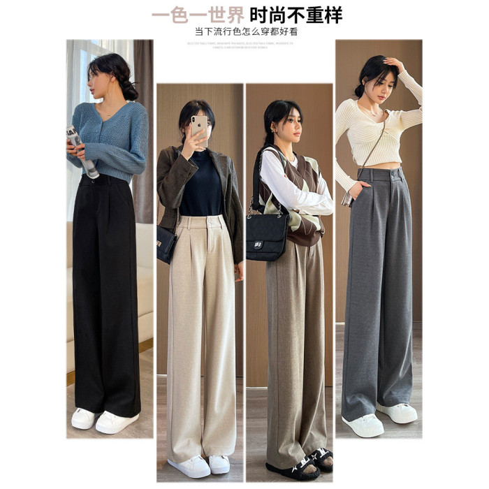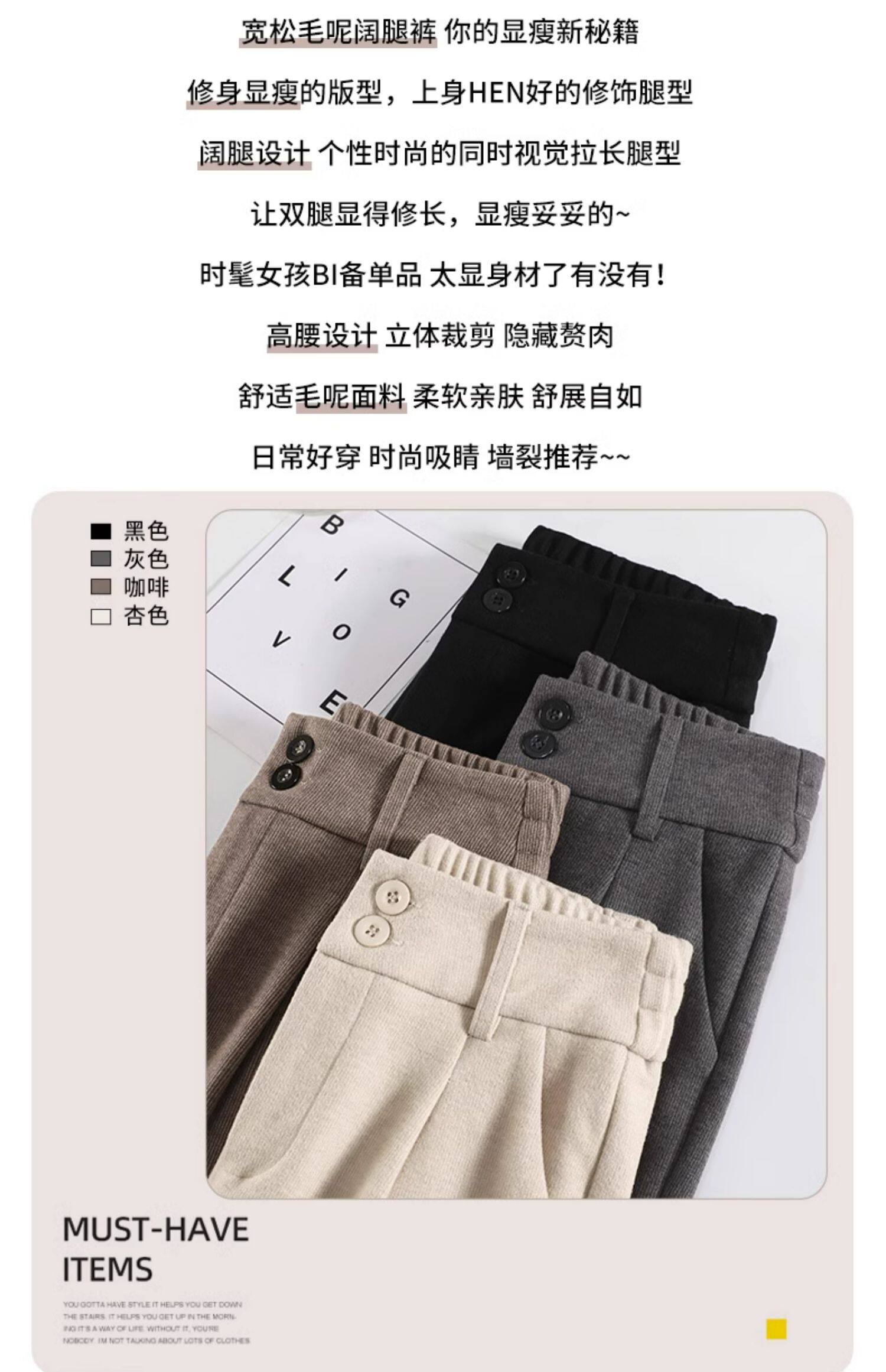 毛呢濶腿褲女春秋冬季2023爆款高腰垂感顯瘦加絨休閒拖地直筒褲子
