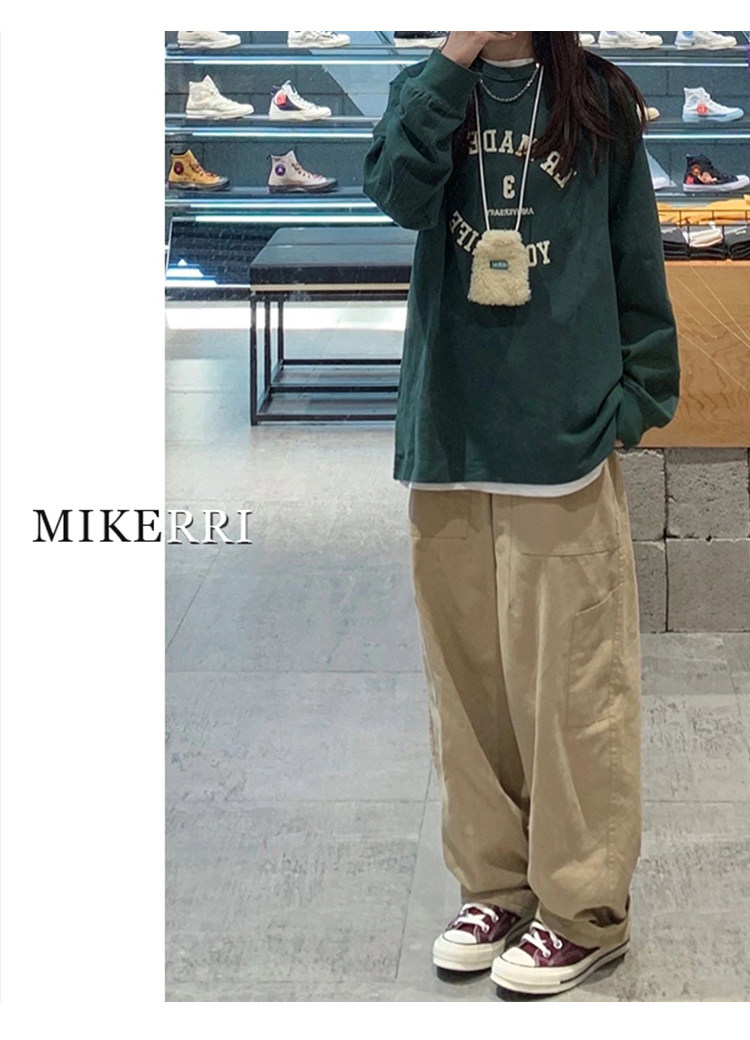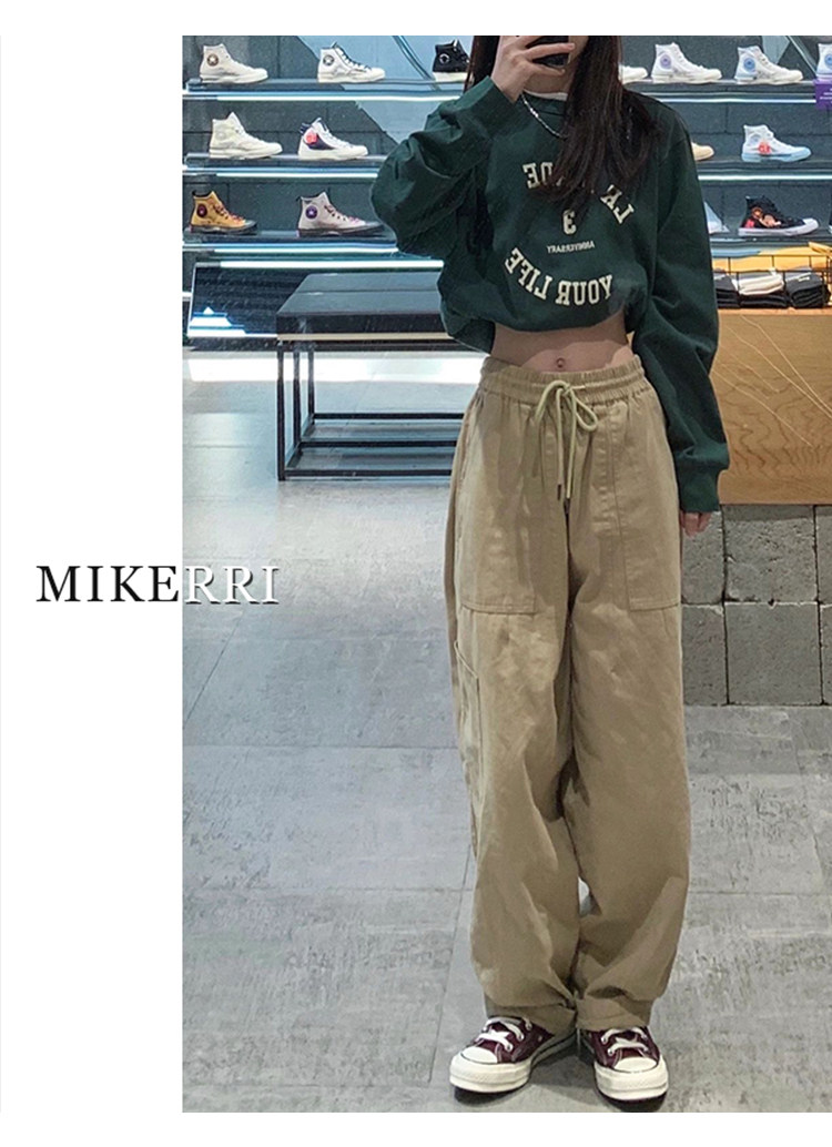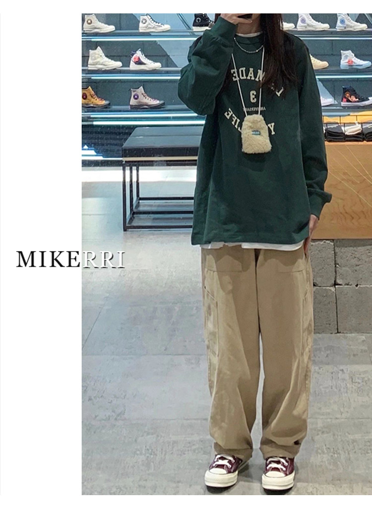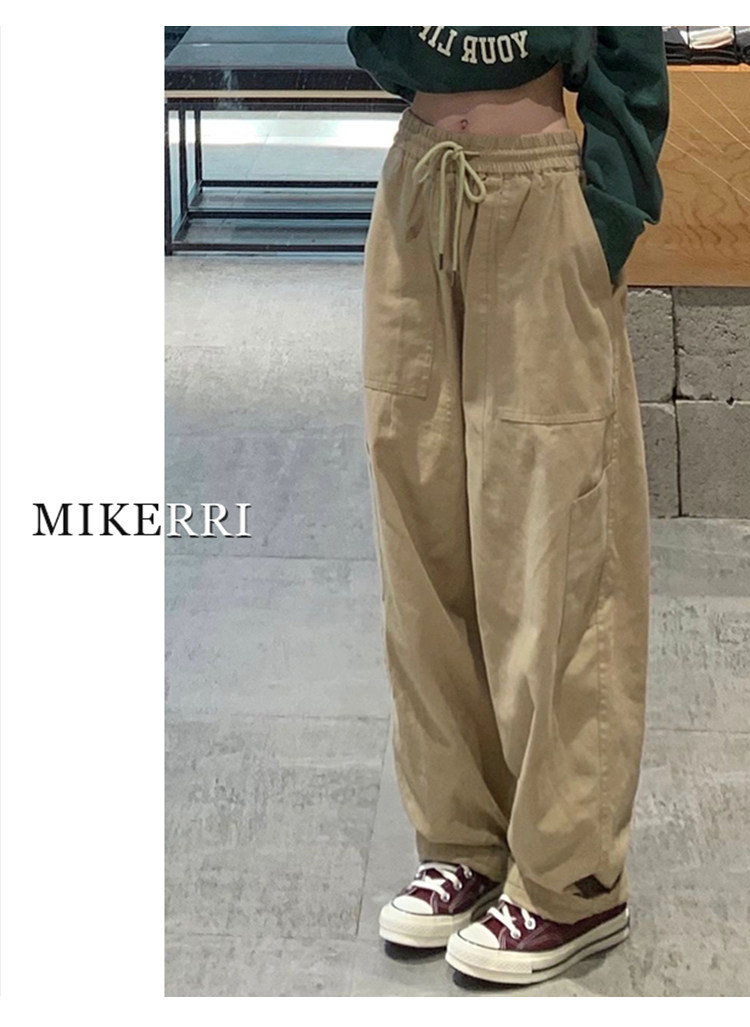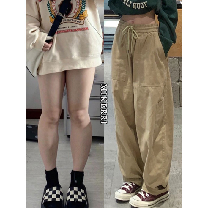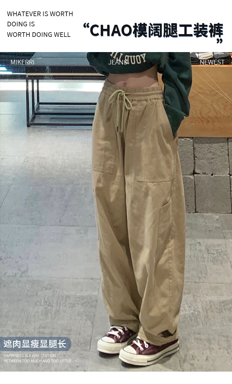 卡其色工裝休閒褲女直筒秋冬加絨加厚大碼胖mm寬鬆顯瘦濶腿老爹褲