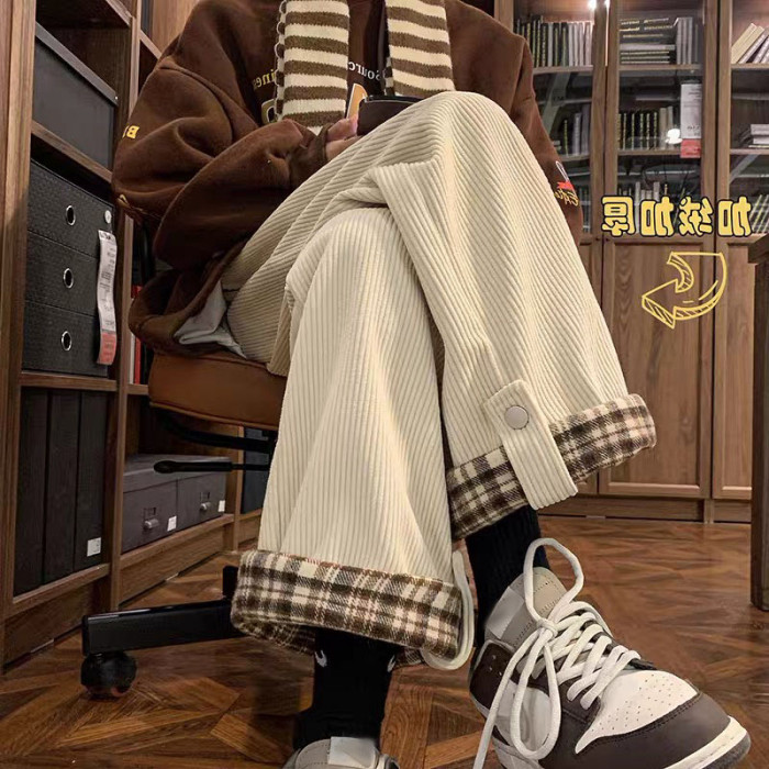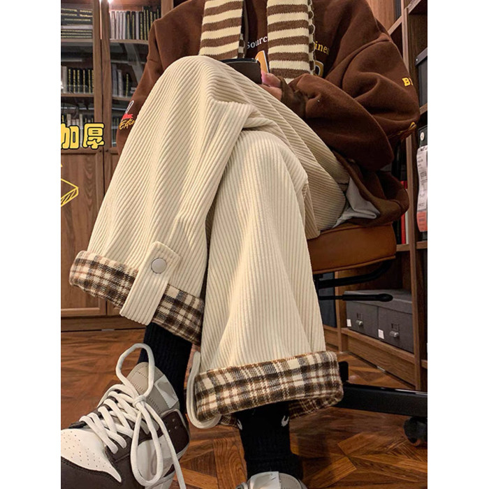 胖mm女大碼燈芯絨格子秋冬季新款加厚加絨褲子女休閒棉褲濶腿工裝