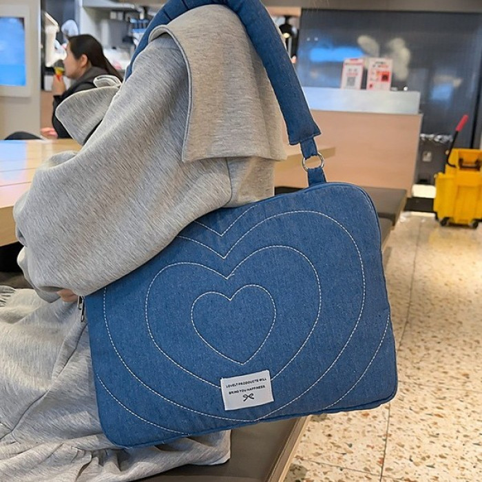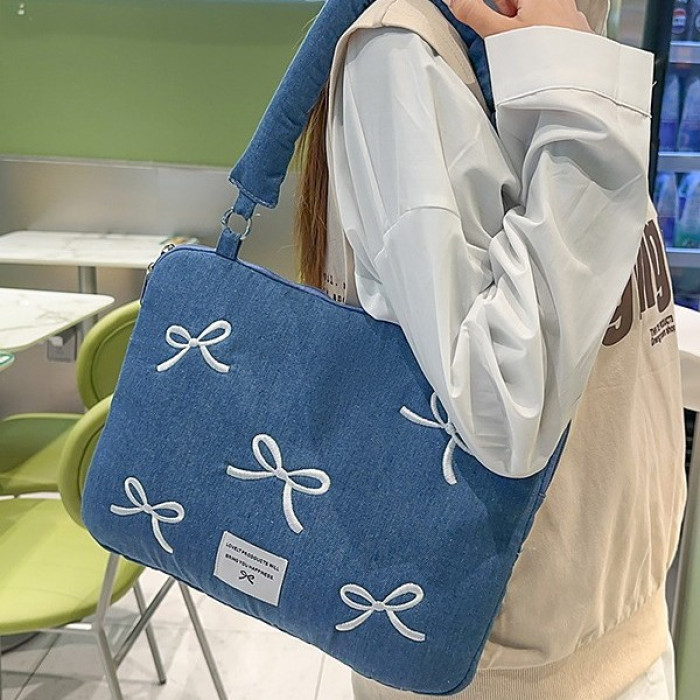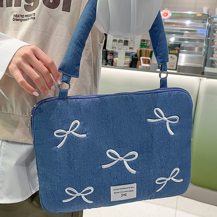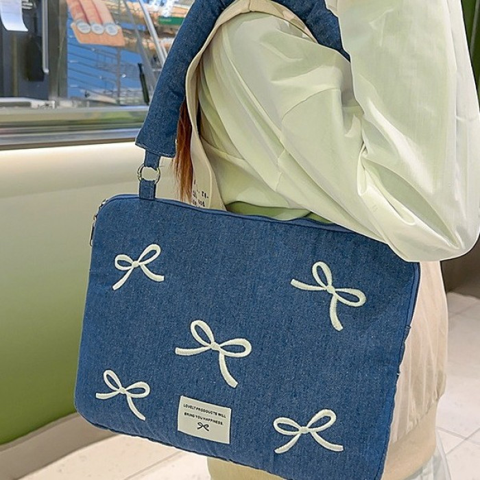 韓國ins牛仔刺綉筆記型電腦包手提14寸適用蘋果macbookair/pro13.3蝴蝶結單肩托特包女聯想華爲內膽16