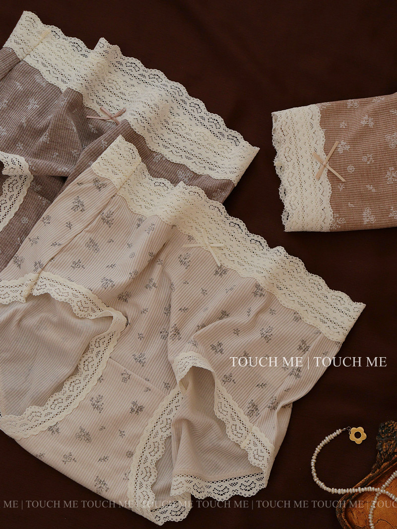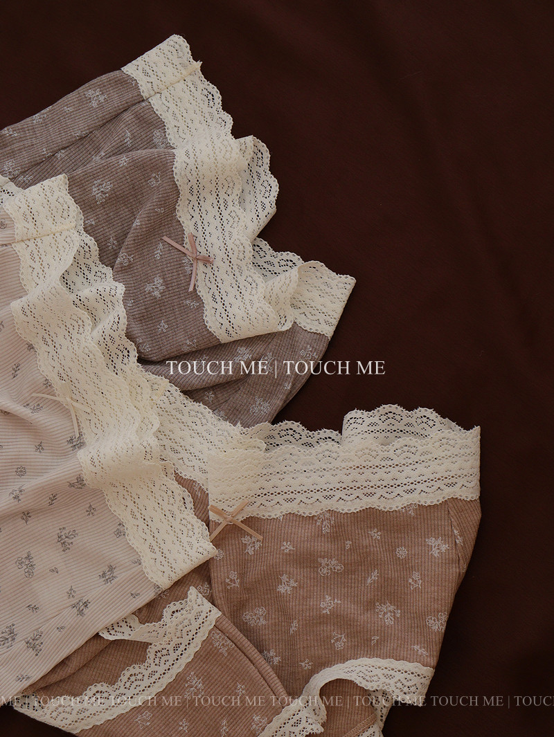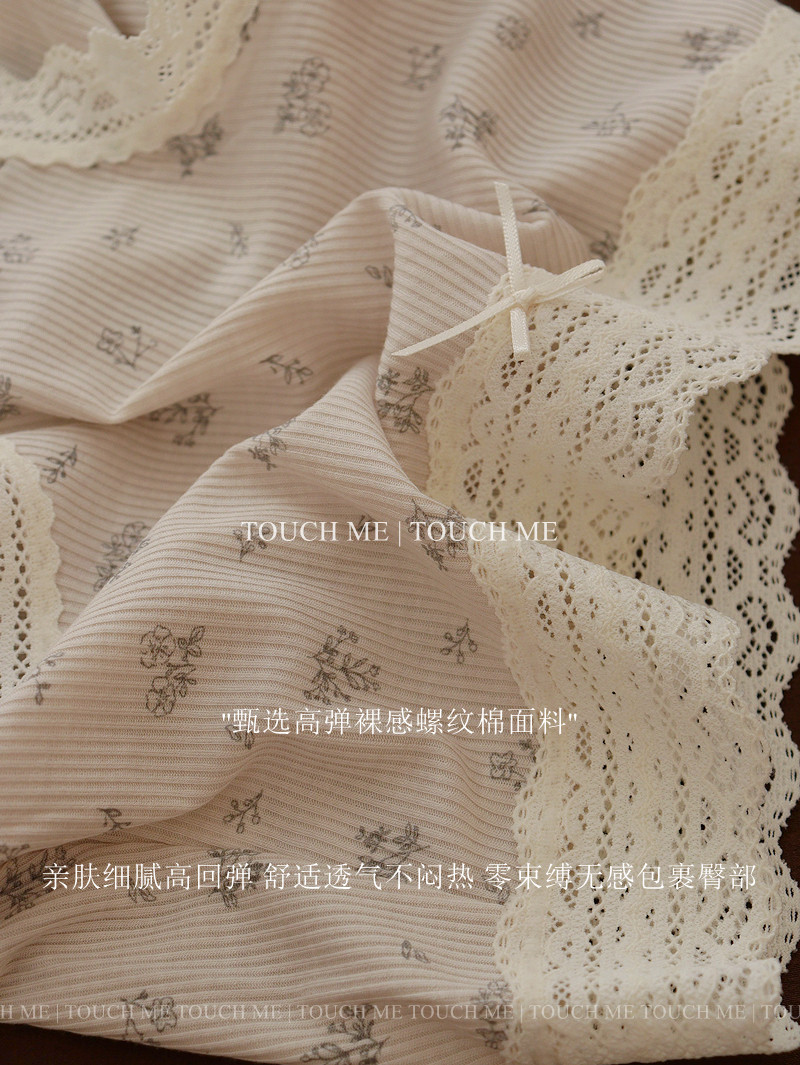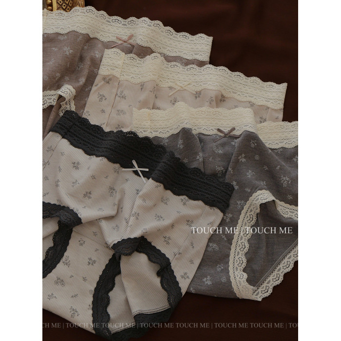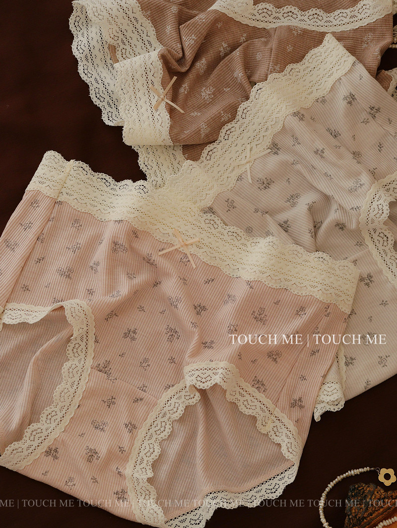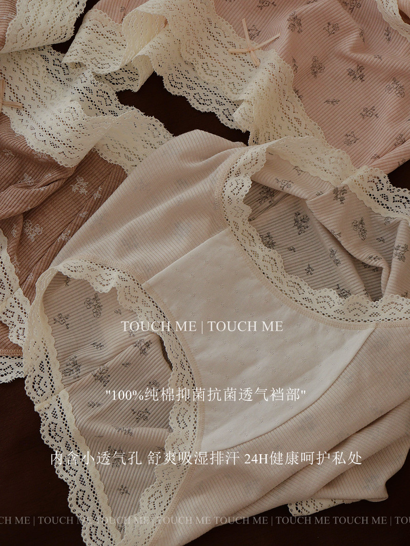 touchme法式復古螺紋碎花蕾絲邊裸感內褲女透氣抑菌純棉襠中腰3條