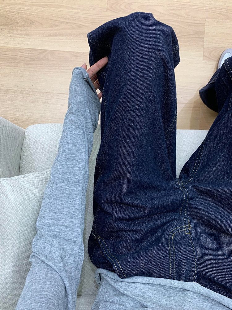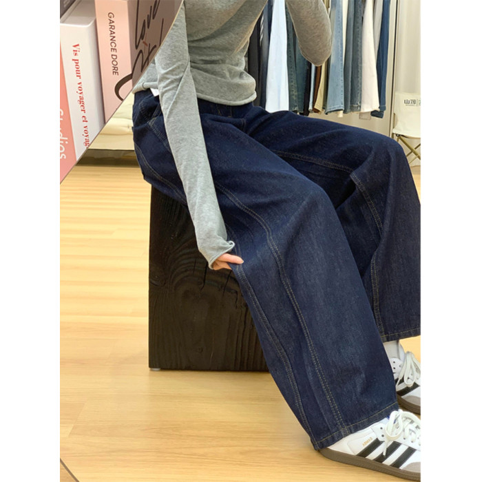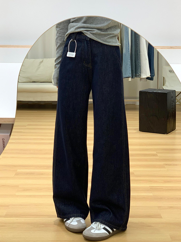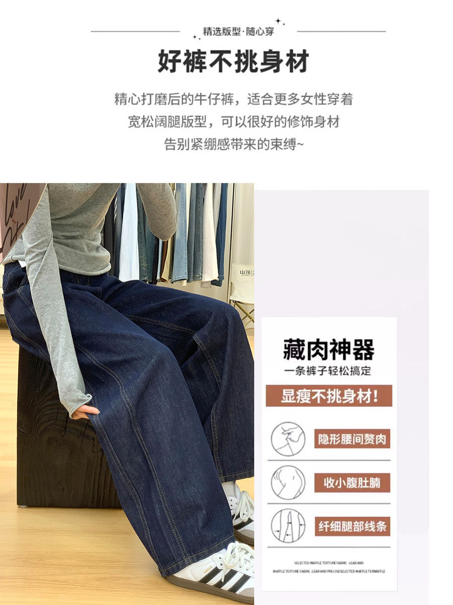深藍色濶腿牛仔褲秋季梨型身材褲子女大碼胖mm顯瘦復古丹甯直筒褲