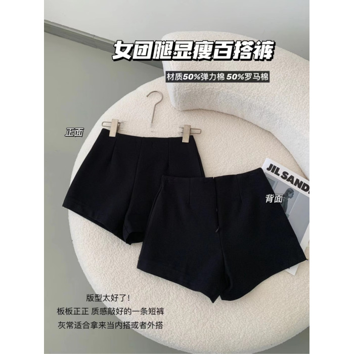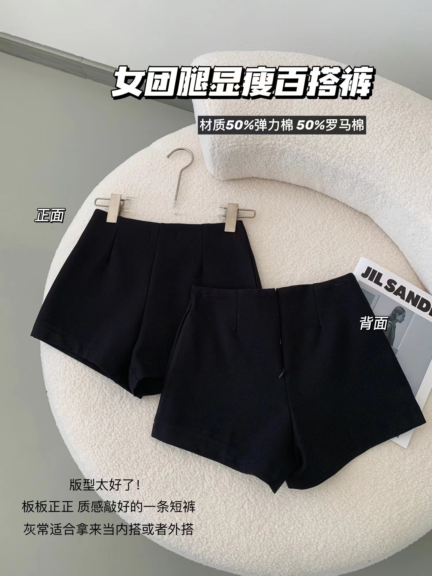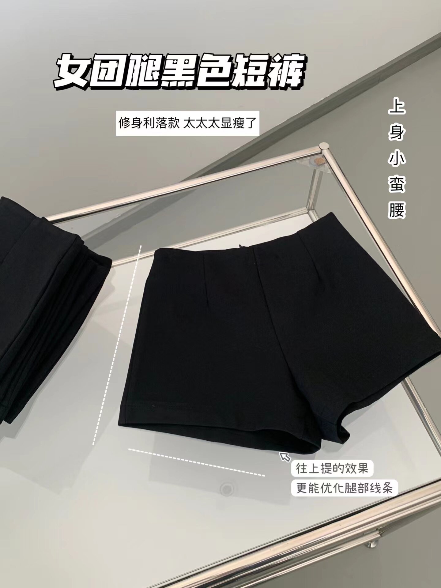 POPW 女團腿無D版型黑色短褲女2024秋季新款修身顯瘦百搭褲
