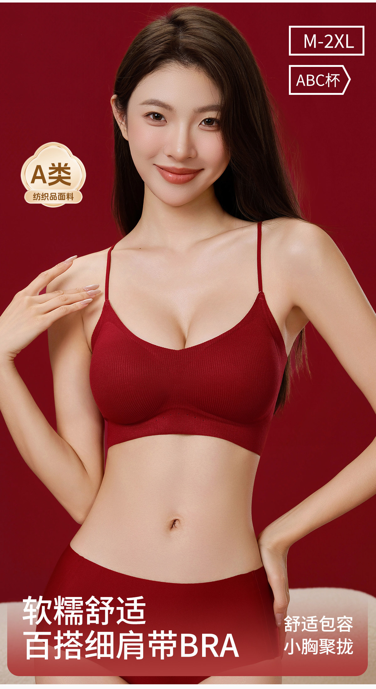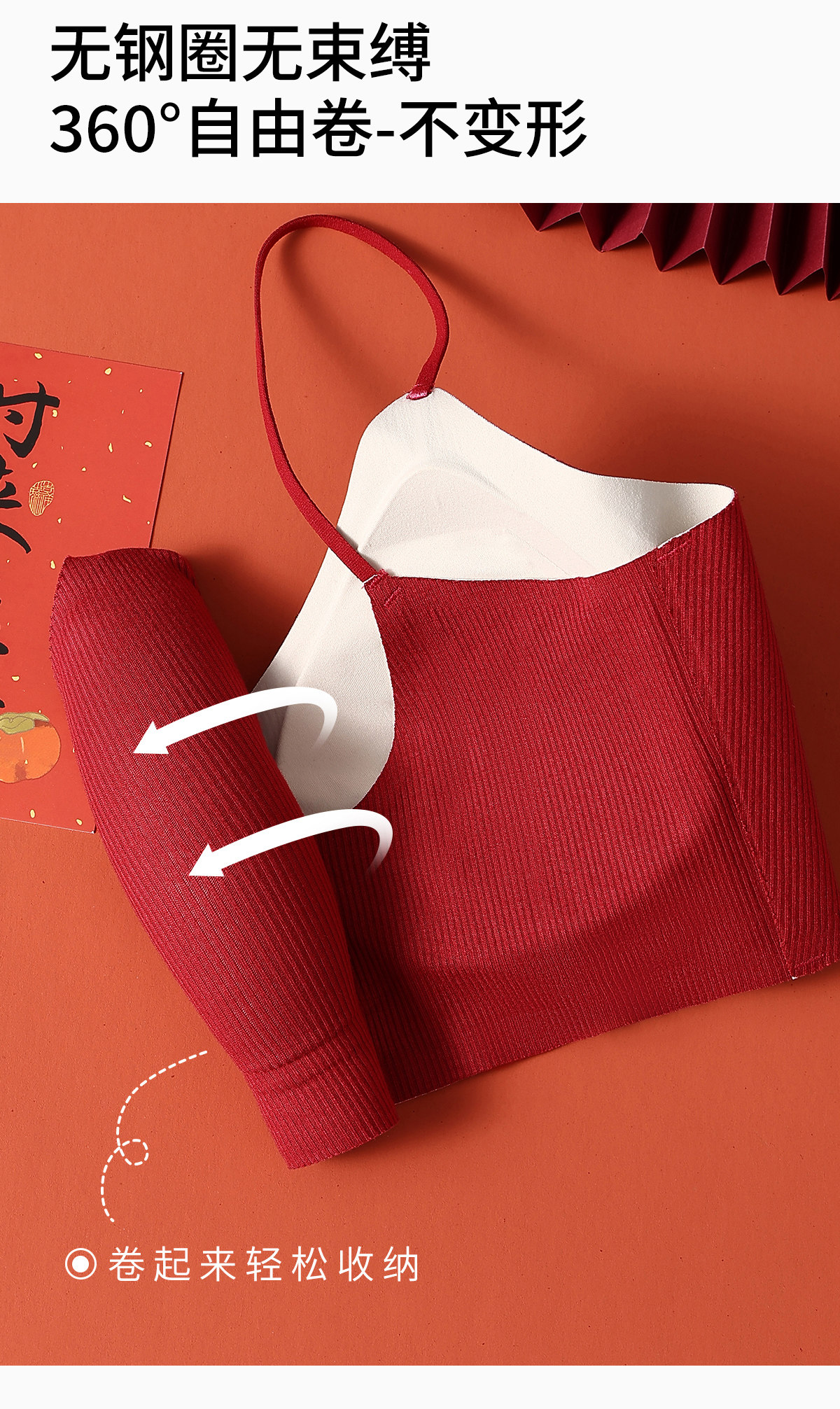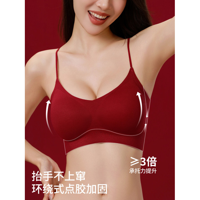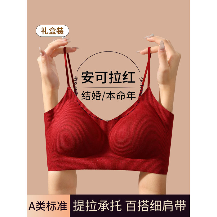 草本初色紅色細肩帶內衣女本命年小胸聚攏新娘結婚無痕文胸套裝冬